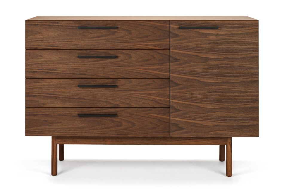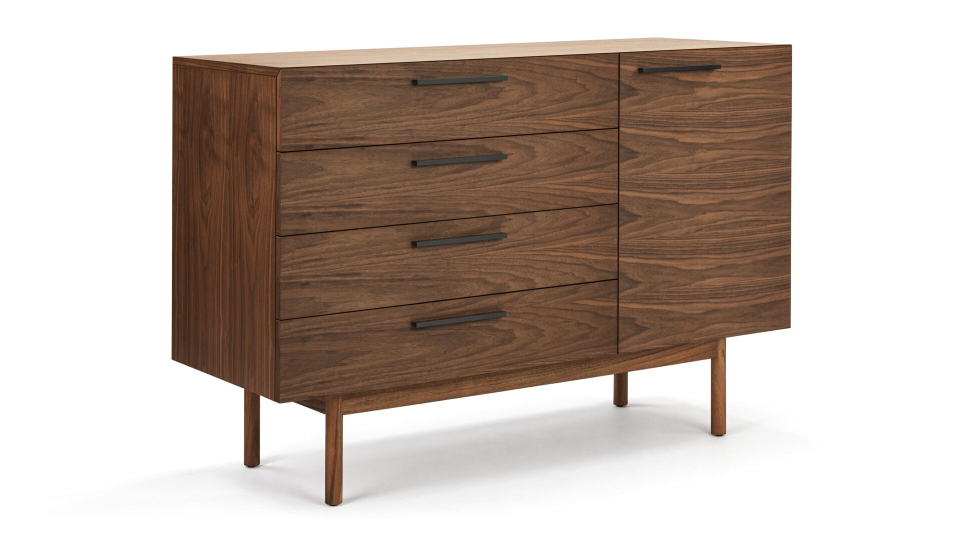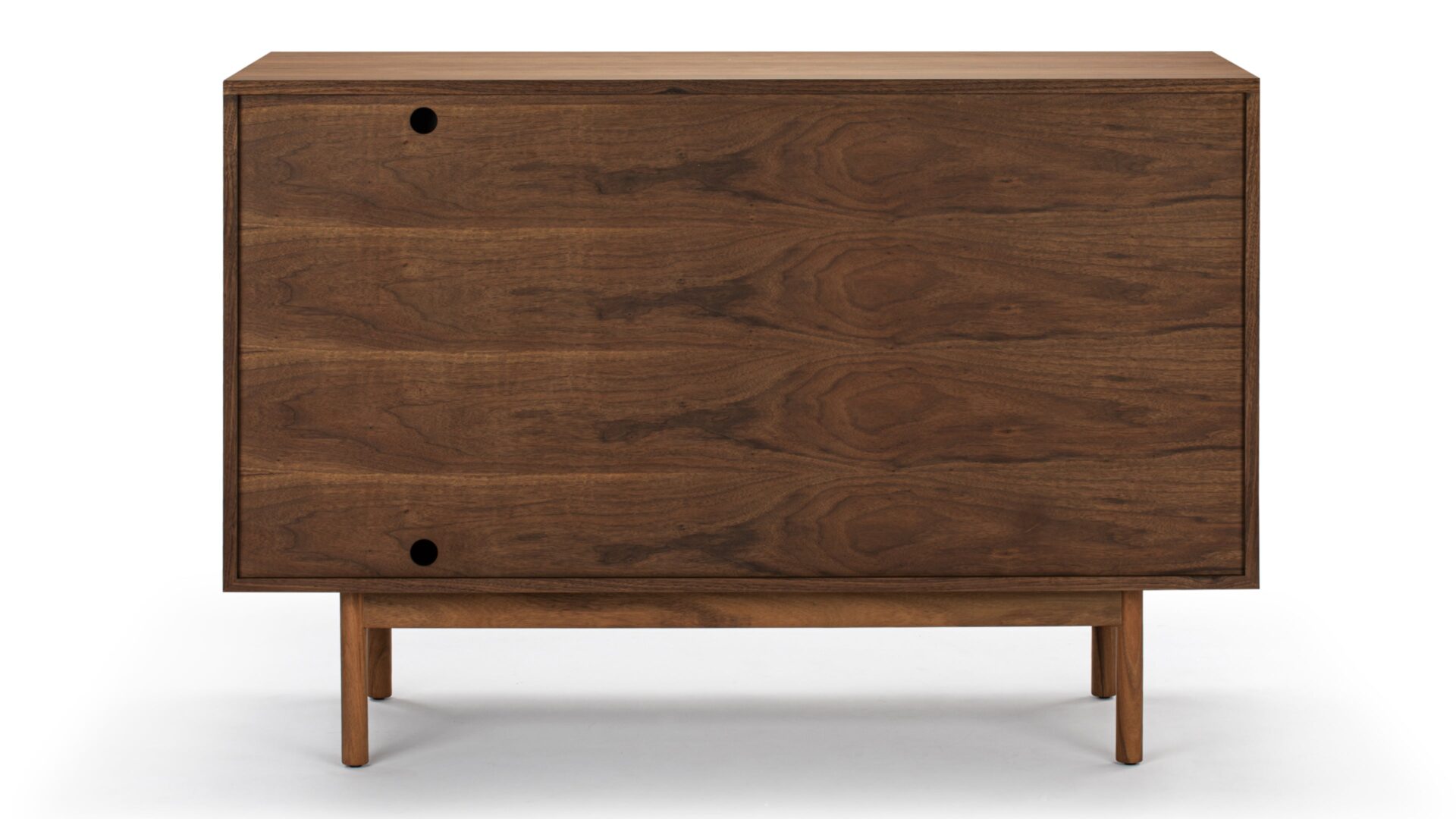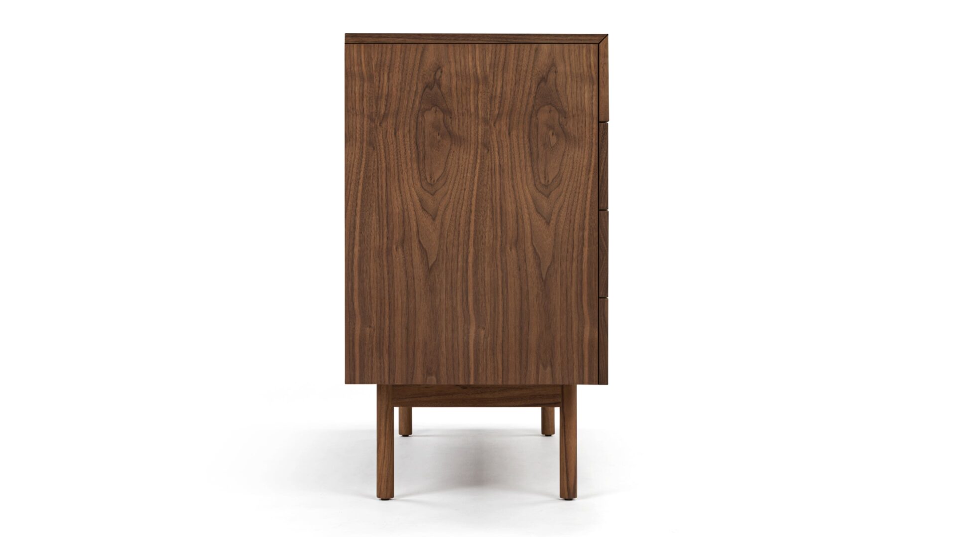 Drawing inspiration from mid-century modern designs, this walnut credenza seamlessly blends timeless charm with practical functionality. With its spacious surface and ample storage capacity, you can effortlessly adorn your space or host gatherings while discreetly stashing away dining essentials. Crafted with expertise from quality woods, this elegant piece adds a touch of sophistication to any room.