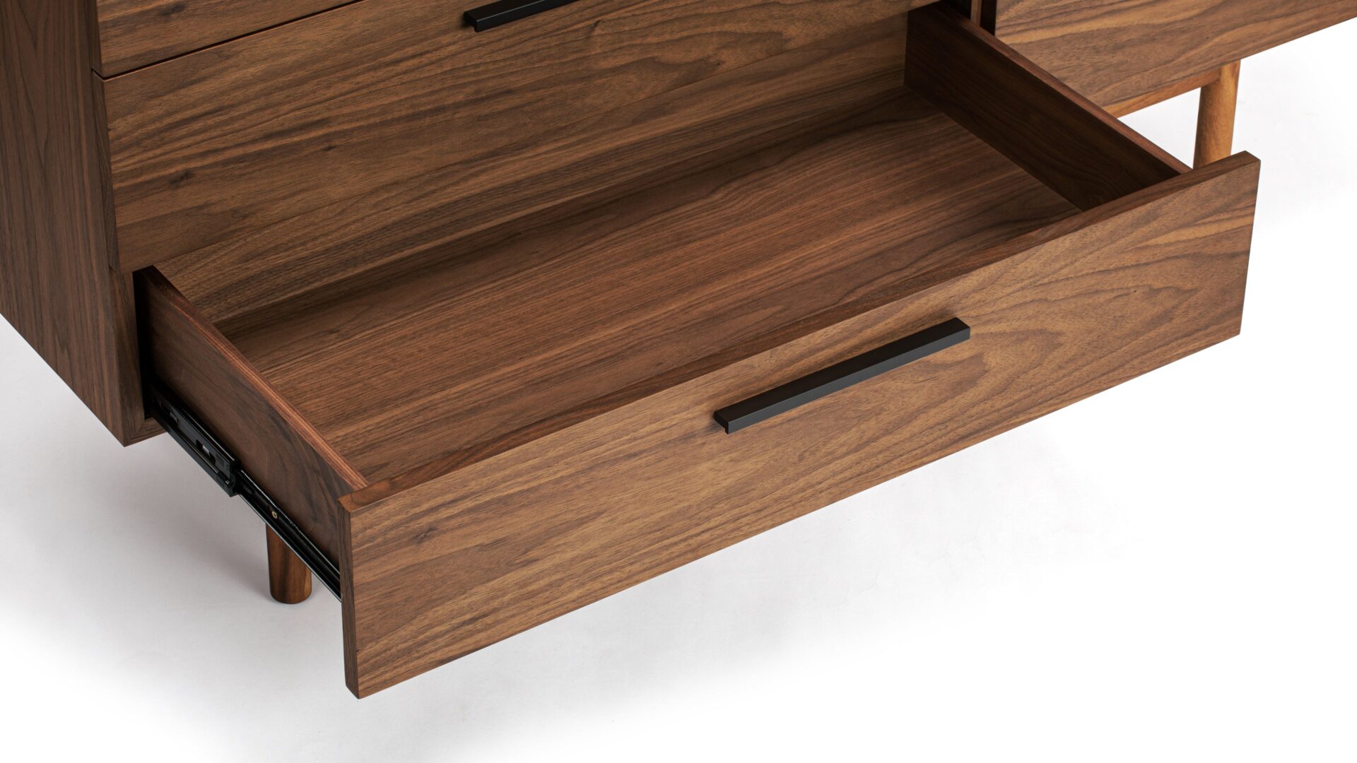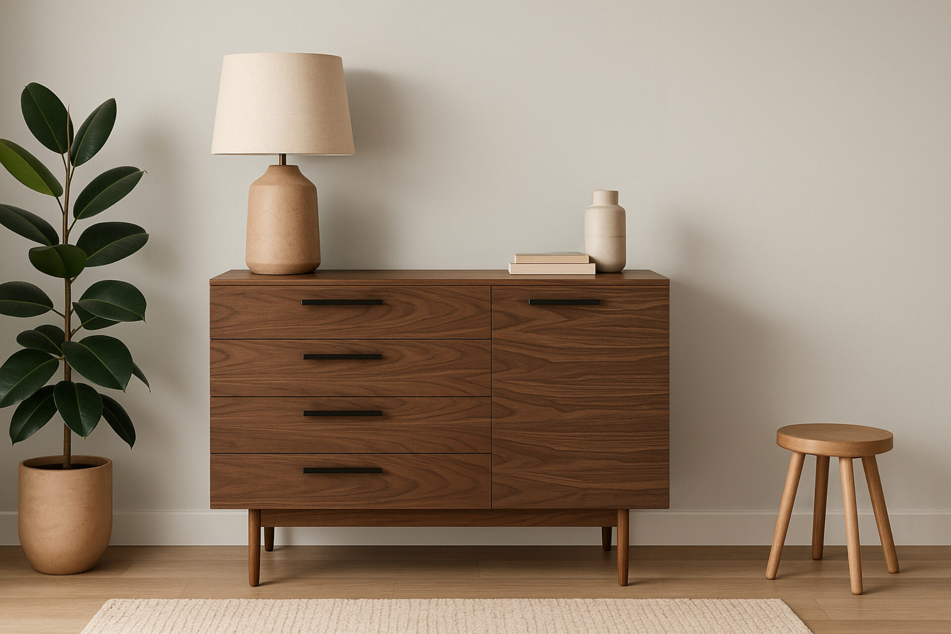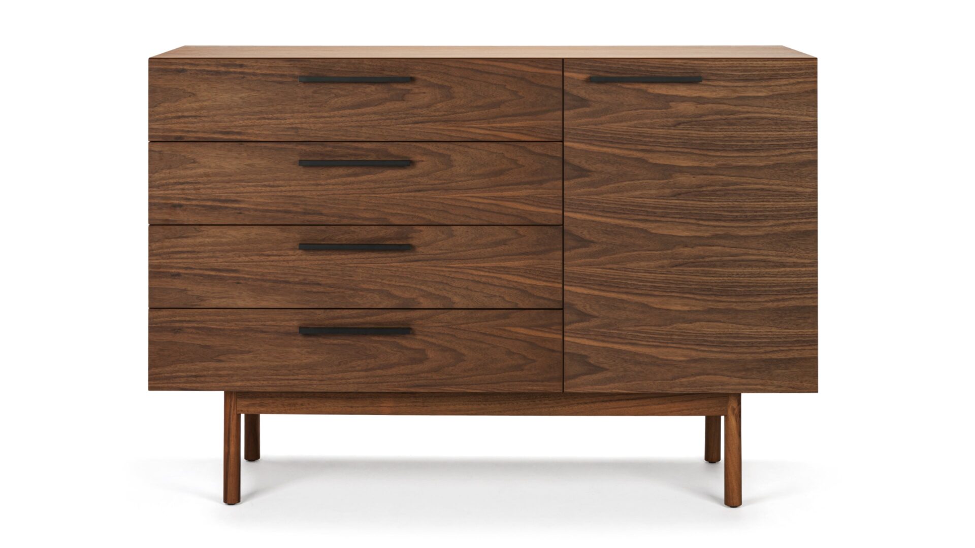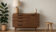 Drawing inspiration from mid-century modern designs, this walnut credenza seamlessly blends timeless charm with practical functionality. With its spacious surface and ample storage capacity, you can effortlessly adorn your space or host gatherings while discreetly stashing away dining essentials. Crafted with expertise from quality woods, this elegant piece adds a touch of sophistication to any room.