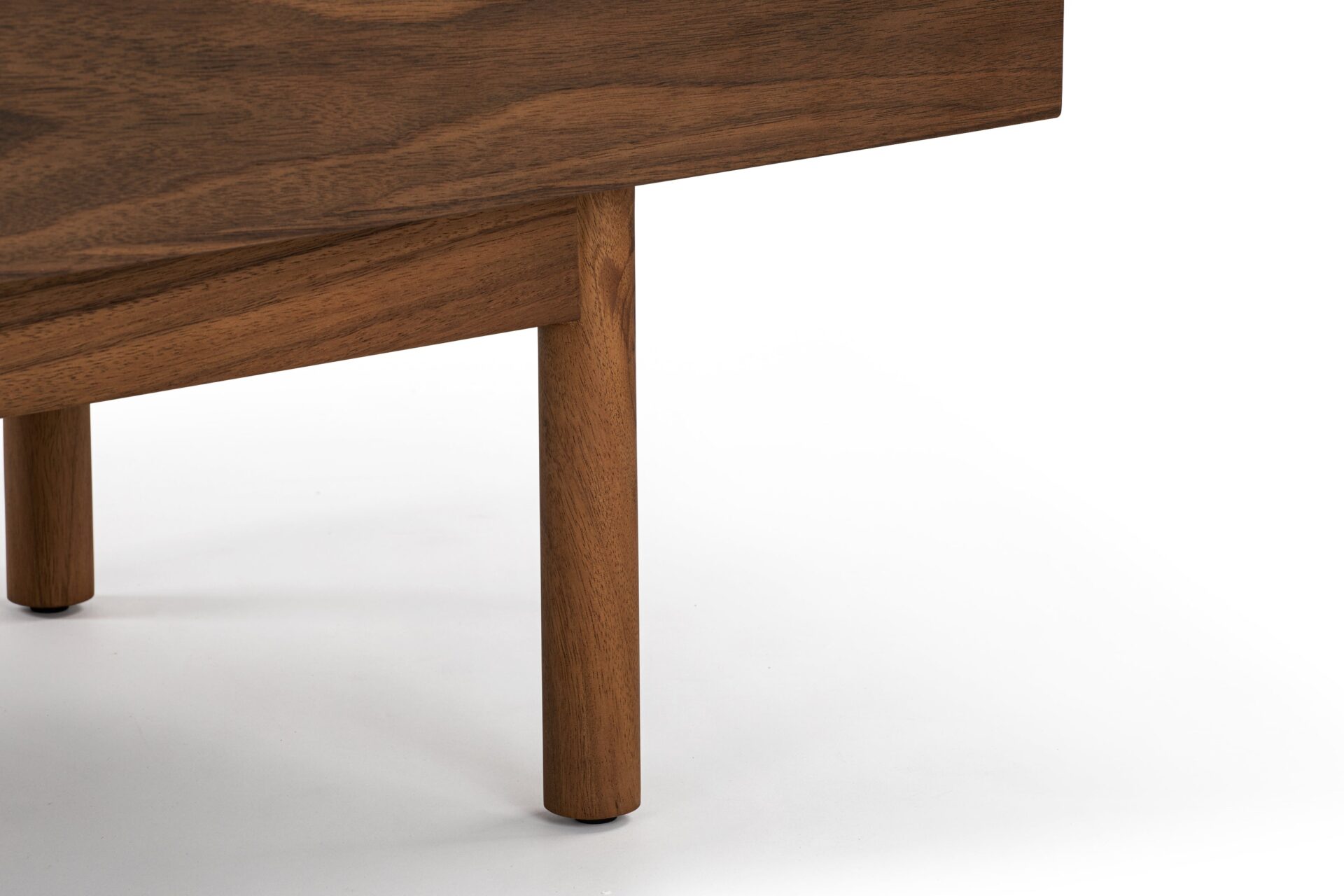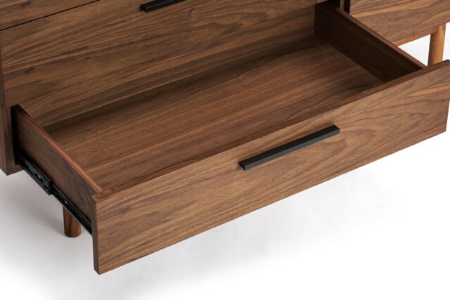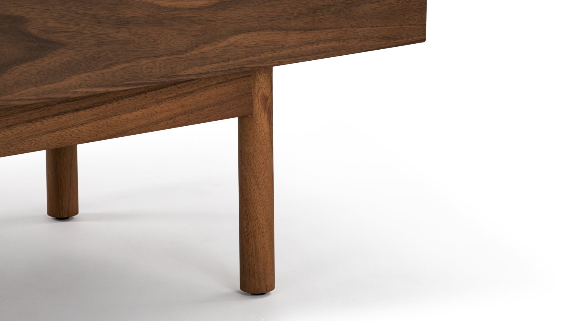 Enhance your space with the elegant Tapered Leg Credenza showcasing a stunning walnut veneer and sturdy solid walnut wood legs, uniquely angled and tapered for a modern touch. This enduring piece is designed to complement both casual and formal settings for years to come.