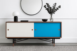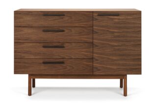 Drawing inspiration from mid-century modern designs, this walnut credenza seamlessly blends timeless charm with practical functionality. With its spacious surface and ample storage capacity, you can effortlessly adorn your space or host gatherings while discreetly stashing away dining essentials. Crafted with expertise from quality woods, this elegant piece adds a touch of sophistication to any room.