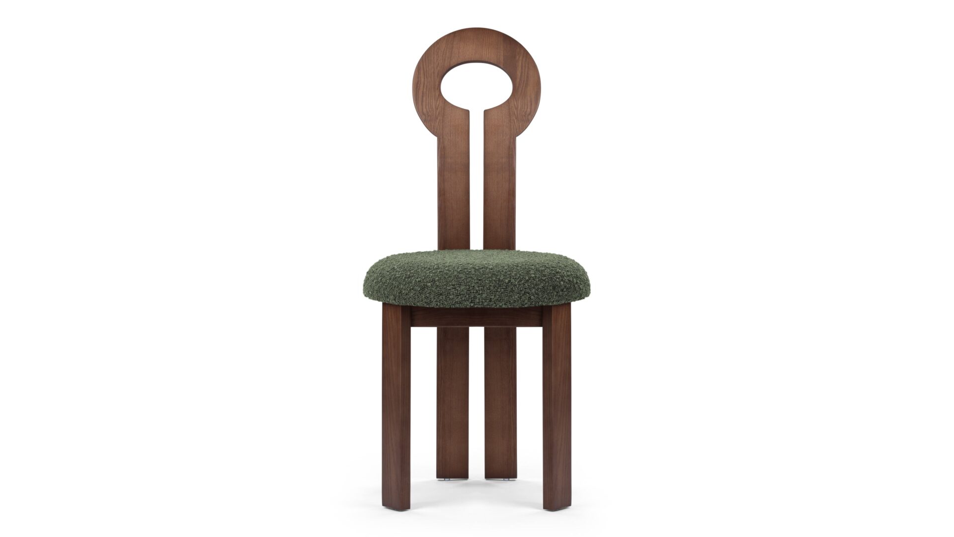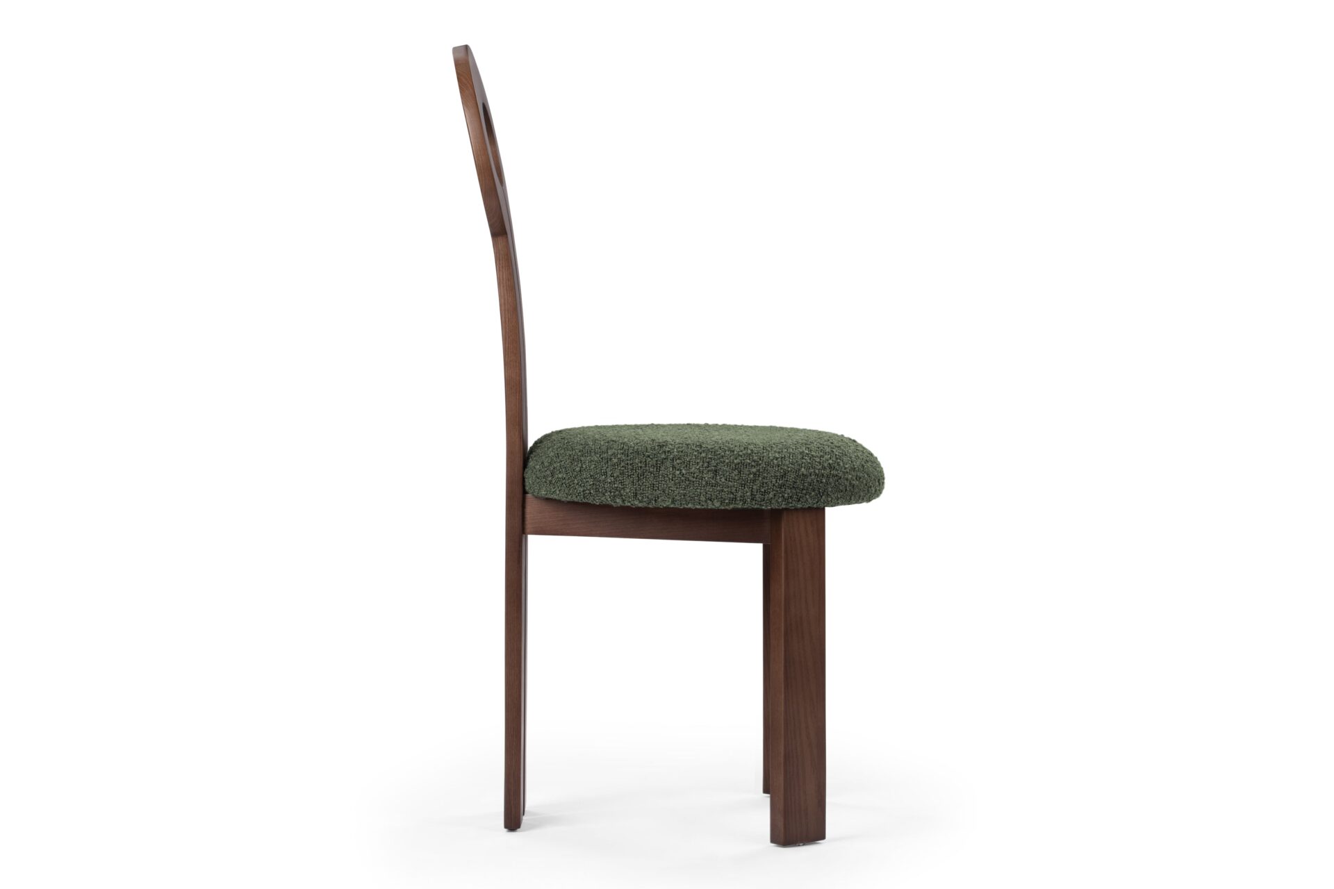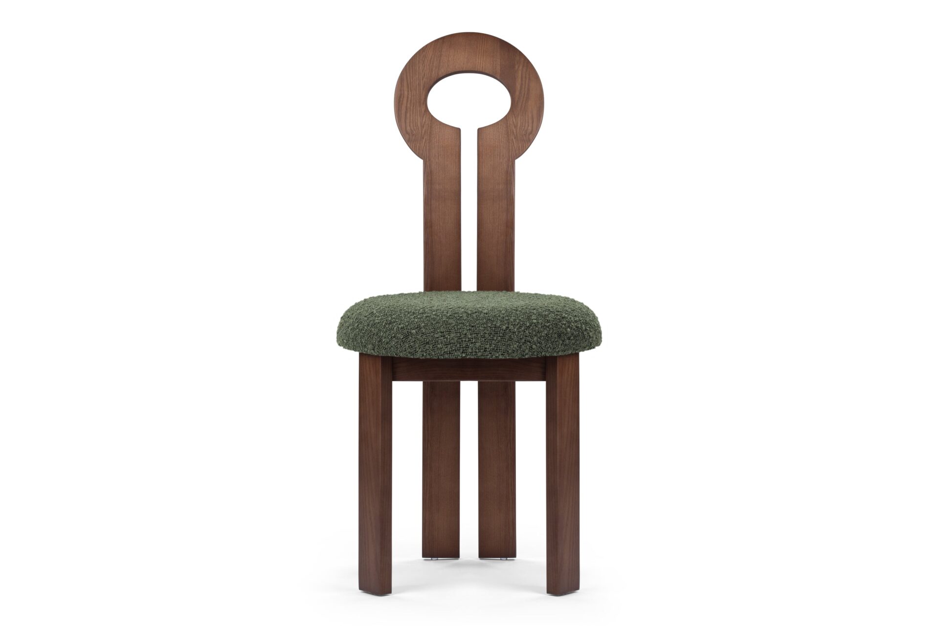 Elevate your space with the timeless sophistication of the Giocosa Side Chair, designed with a graceful round backrest and a unique circular cutout for a touch of mid-century elegance. Crafted with high-quality Walnut wood and sumptuous fabrics, this chair radiates luxury and durability, effortlessly transitioning from dining to desk chair for versatile and stylish functionality.