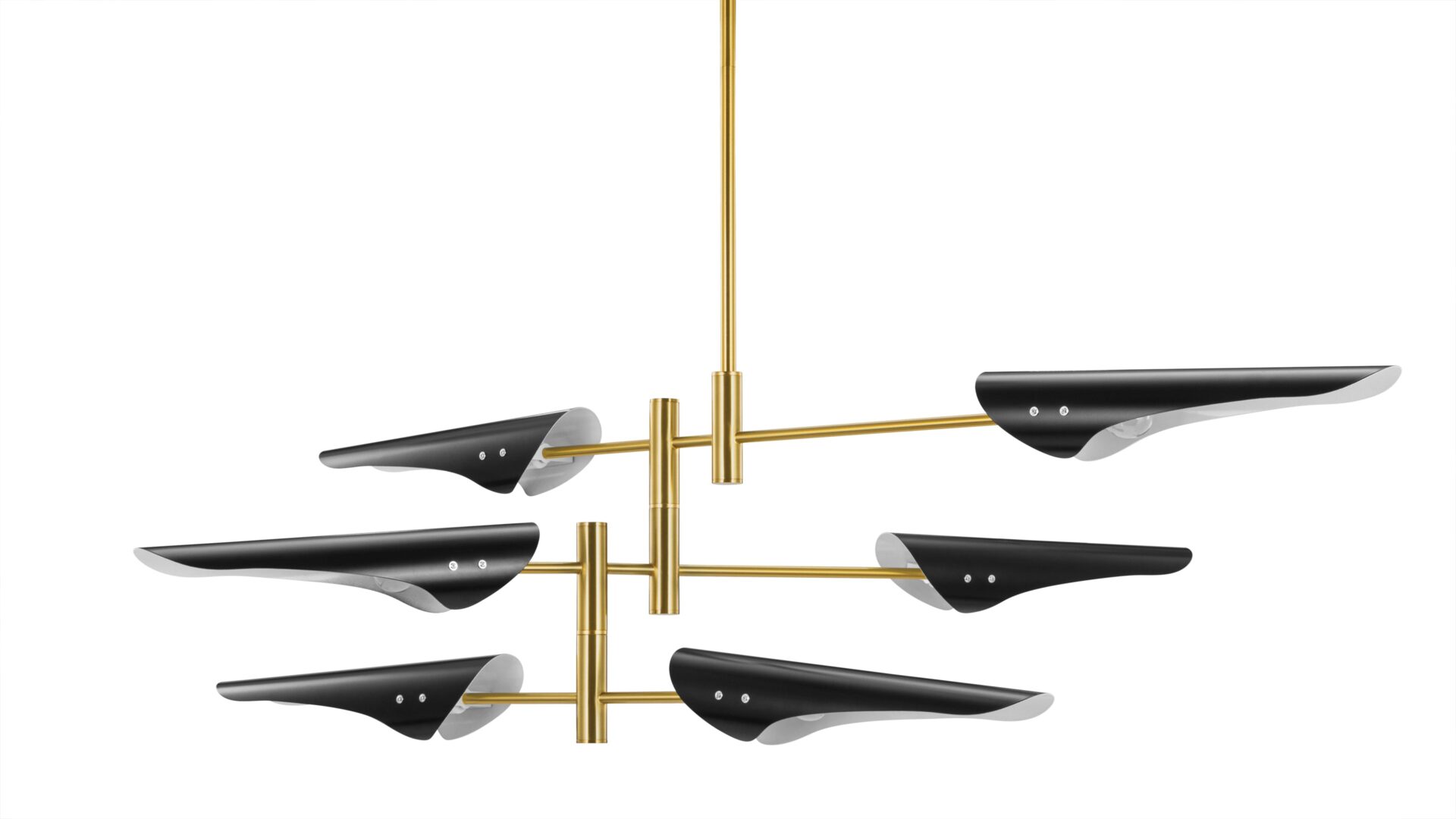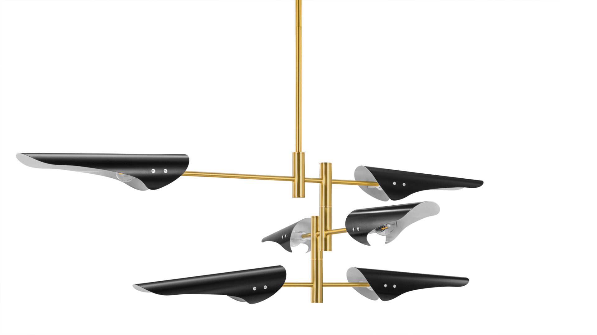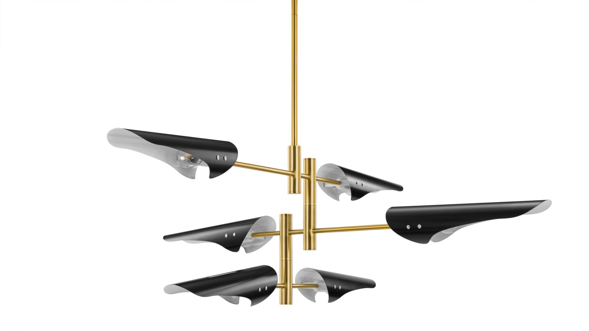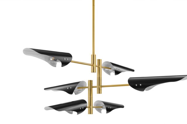 Introducing the Hale Pendant Light, showcasing adjustable brass arms topped with black shades, this fixture exudes timeless elegance. Ideal for both office and living spaces, this piece pays homage to traditional design.