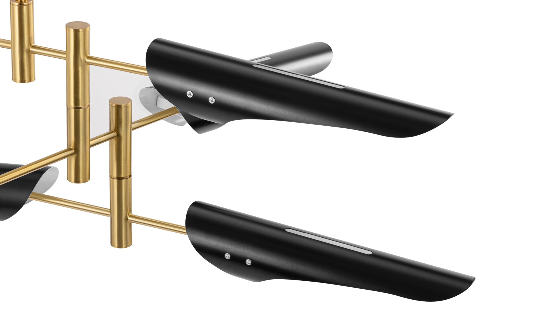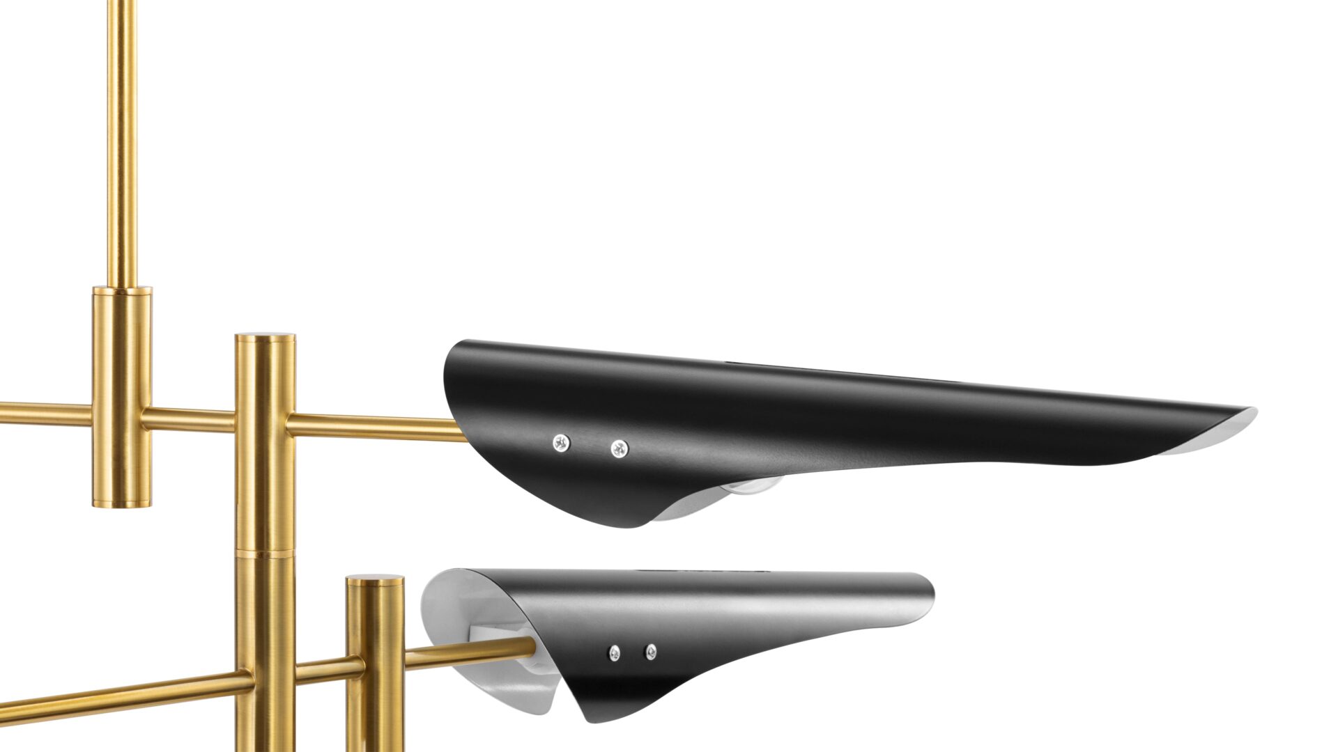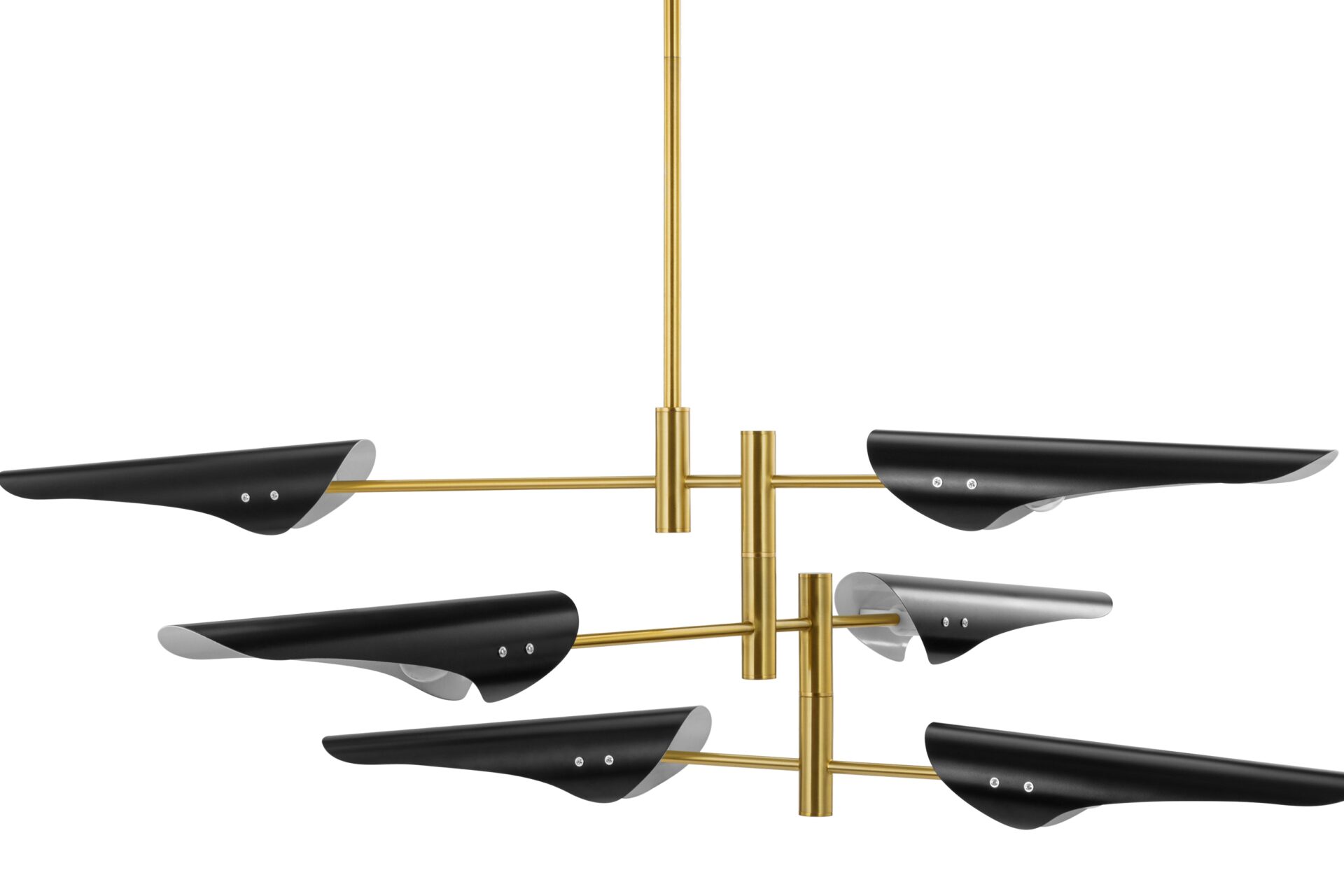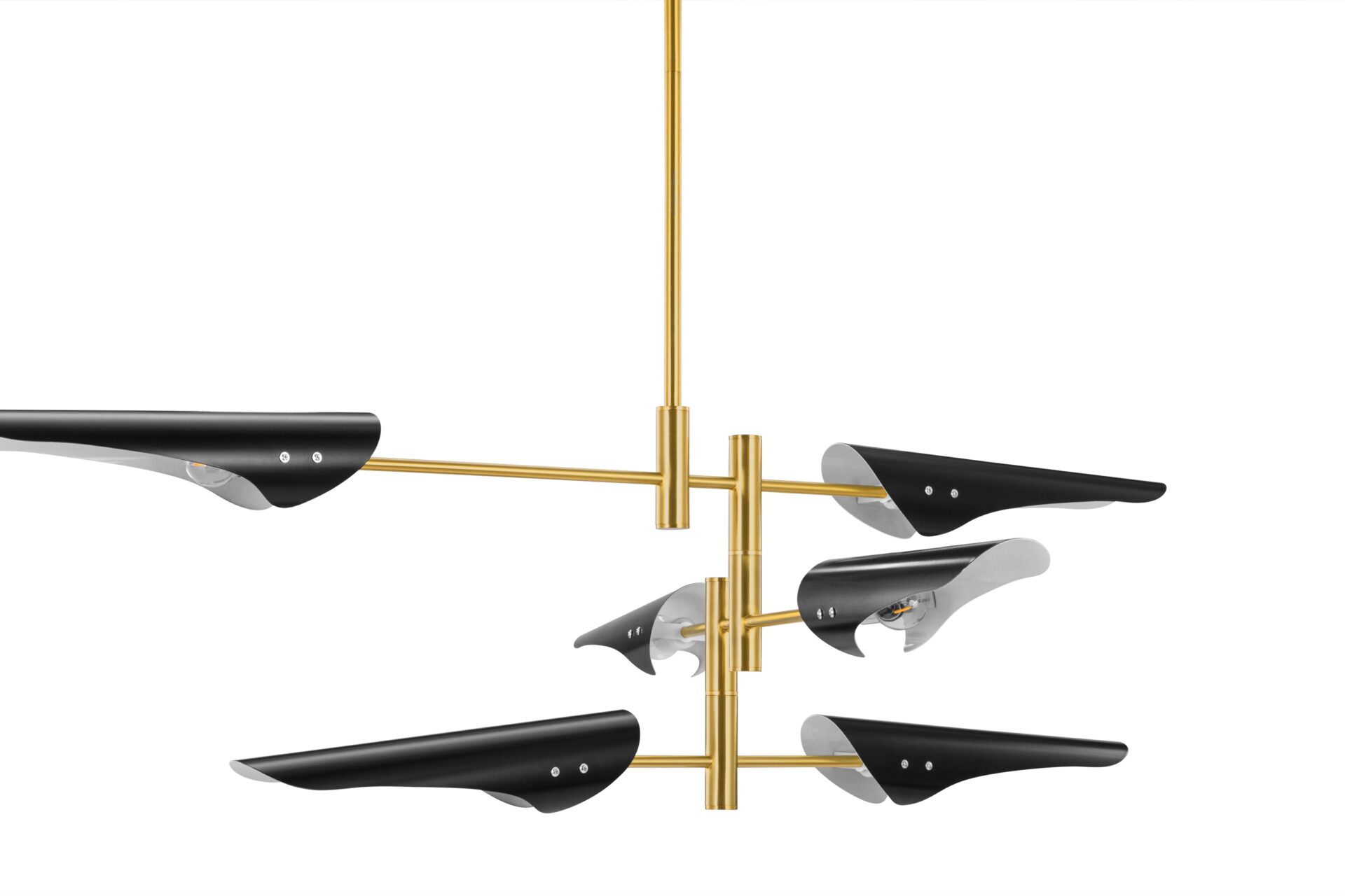 Introducing the Hale Pendant Light, showcasing adjustable brass arms topped with black shades, this fixture exudes timeless elegance. Ideal for both office and living spaces, this piece pays homage to traditional design.