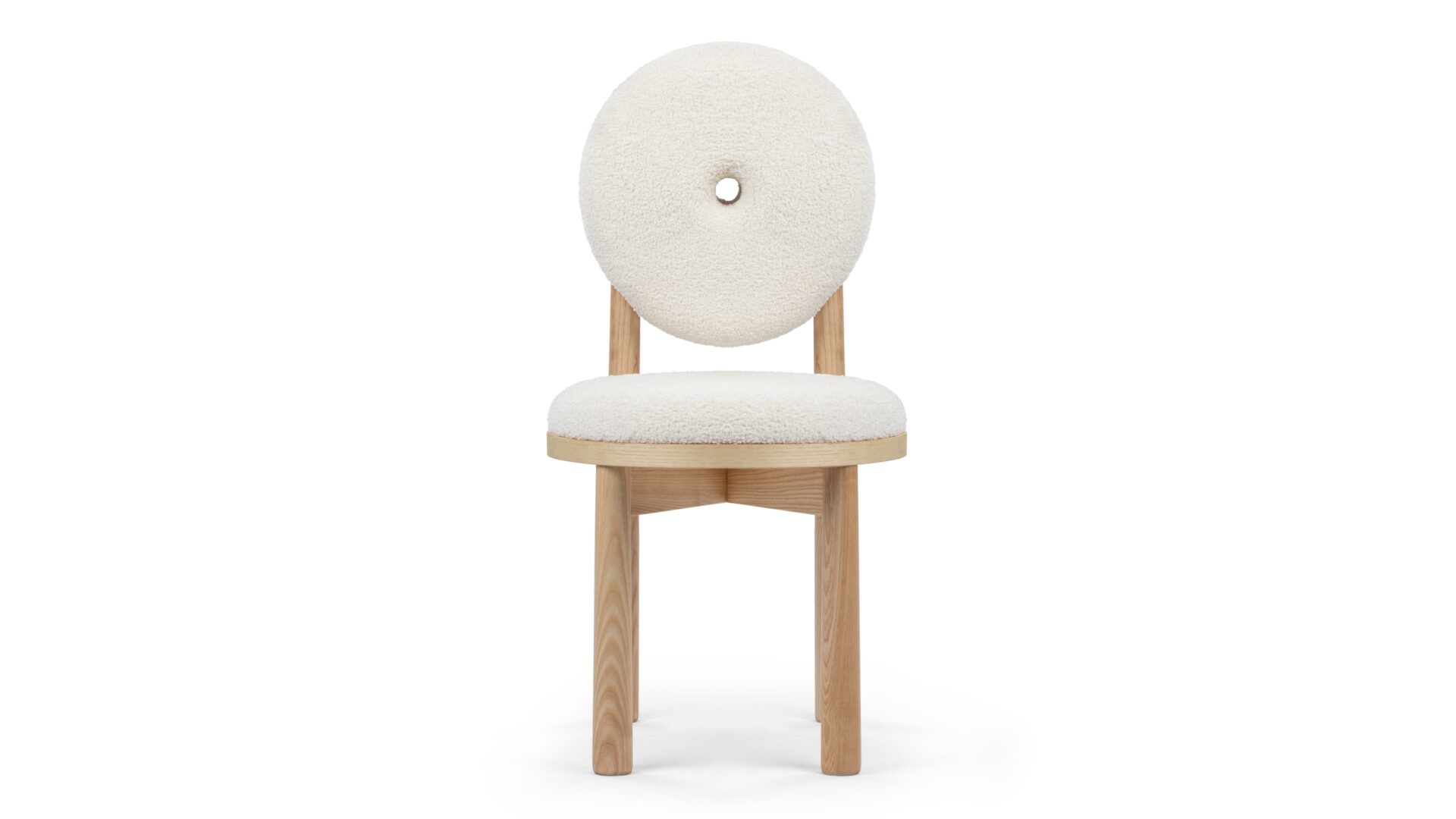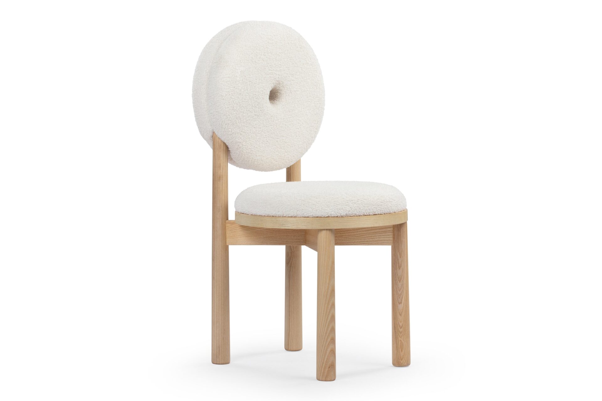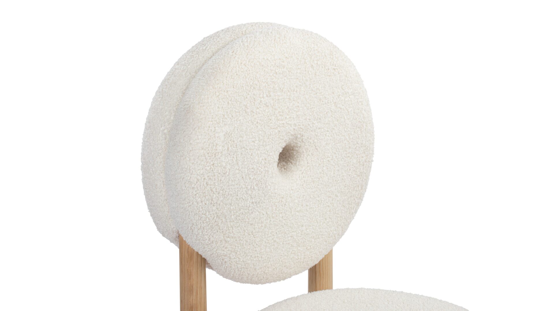 Experience a contemporary and minimalist design with the Hanna Dining Chair, featuring a distinctive doughnut-shaped backrest. The chair's combination of plush boucle fabric and warm natural wood finishes offers a subtle touch of sophistication to any room.