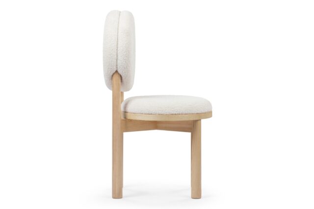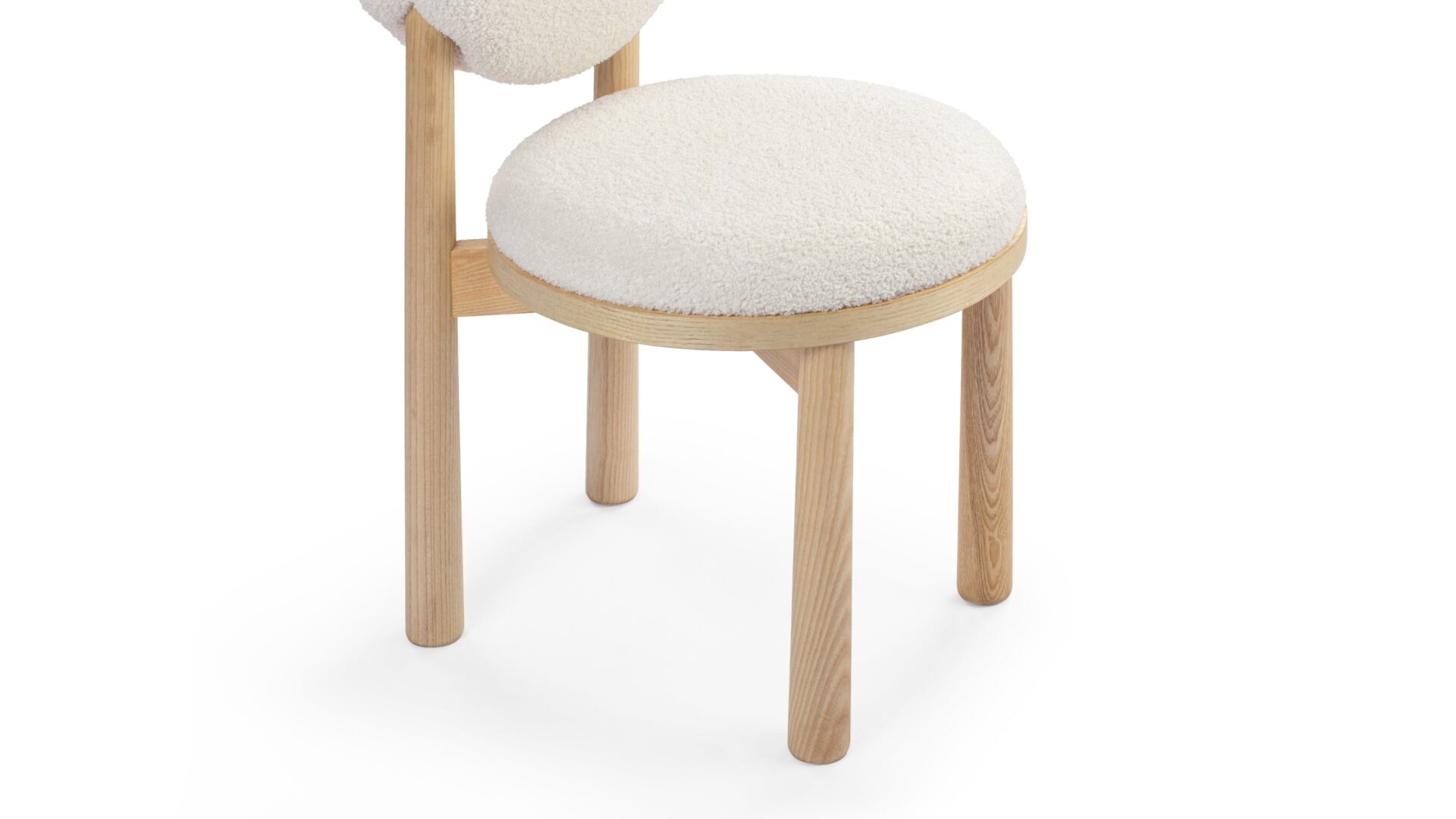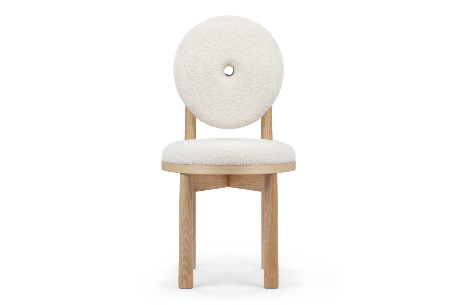 Experience a contemporary and minimalist design with the Hanna Dining Chair, featuring a distinctive doughnut-shaped backrest. The chair's combination of plush boucle fabric and warm natural wood finishes offers a subtle touch of sophistication to any room.