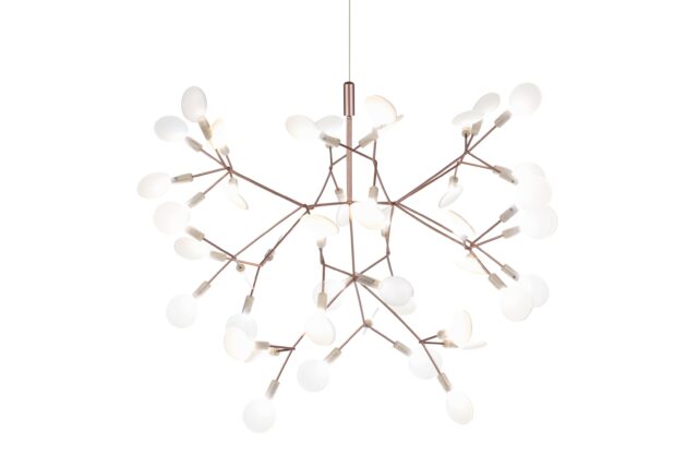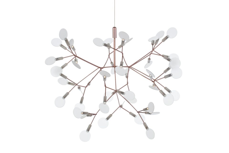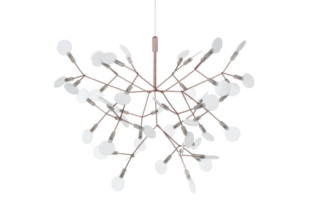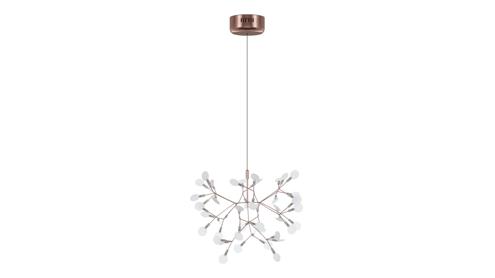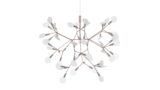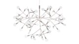 The Heracleum III Chandelier is a remarkable contemporary lighting fixture that draws inspiration from the organic beauty of nature. Its intricate design, evoking the delicate branches or dandelion seed heads, is skillfully crafted from stainless steel with a luxurious copper finish. Attached to slim, outward-reaching rods are small acrylic shades that gently diffuse the warm glow emitted by the integrated LED bulbs. Suspended elegantly by a slender wire or cable, it exudes a floating, sculptural quality that elevates modern interiors.