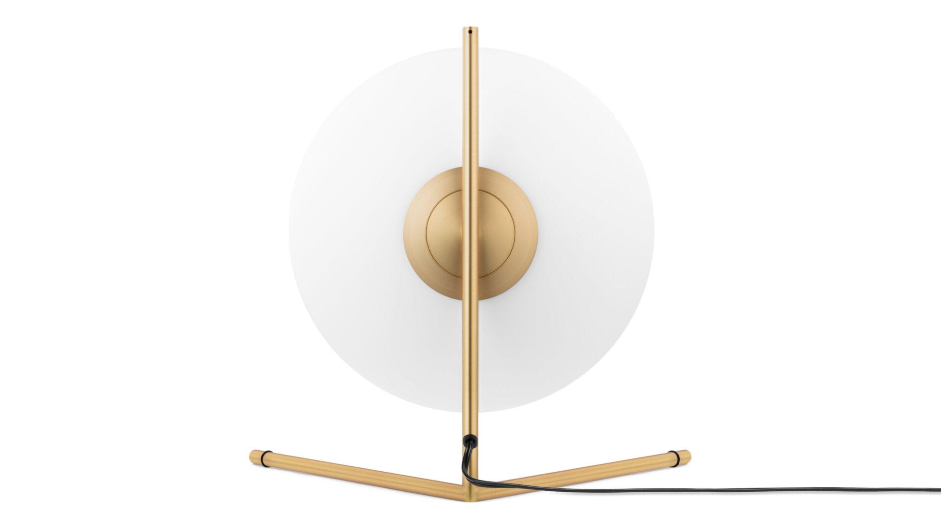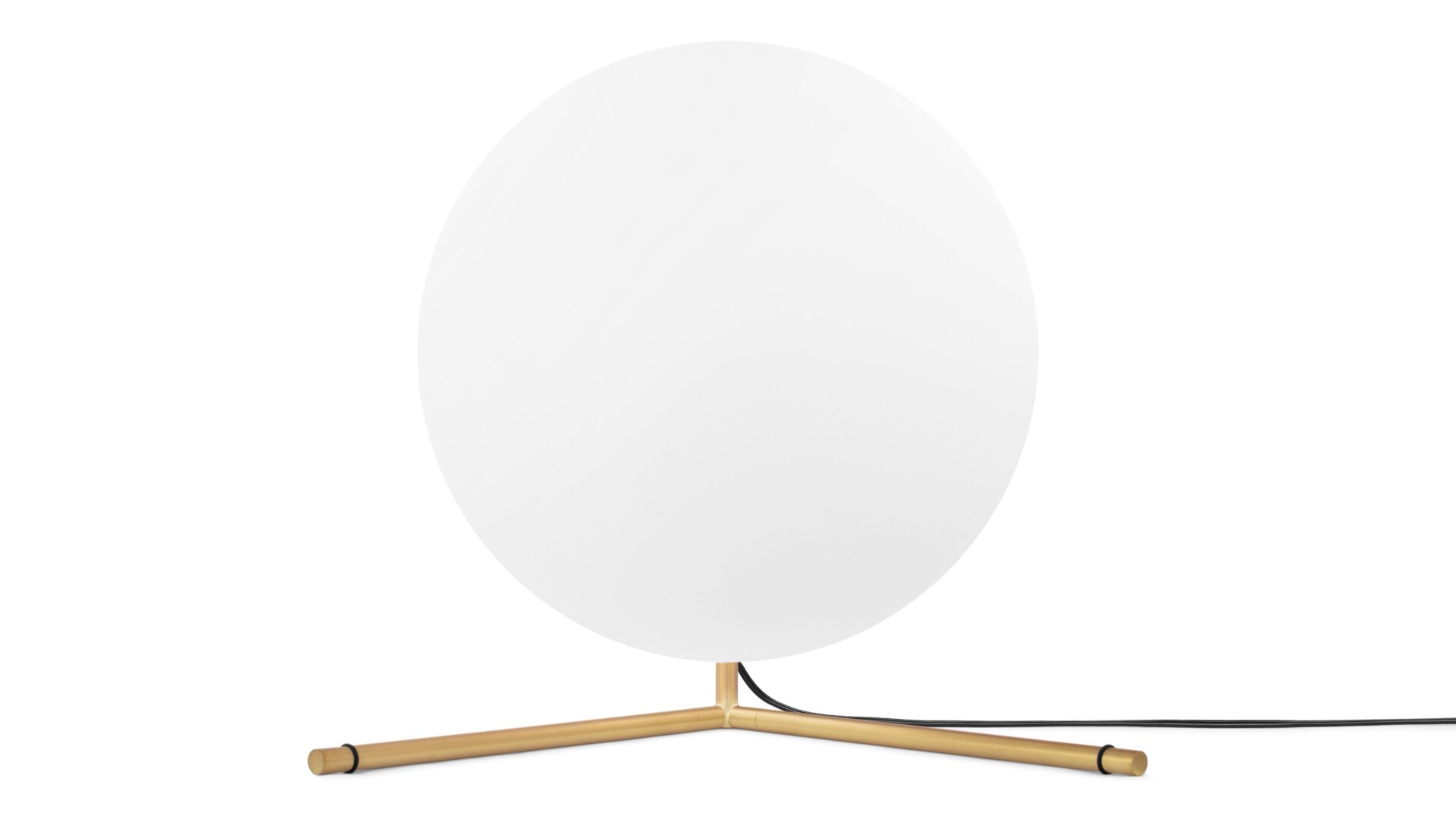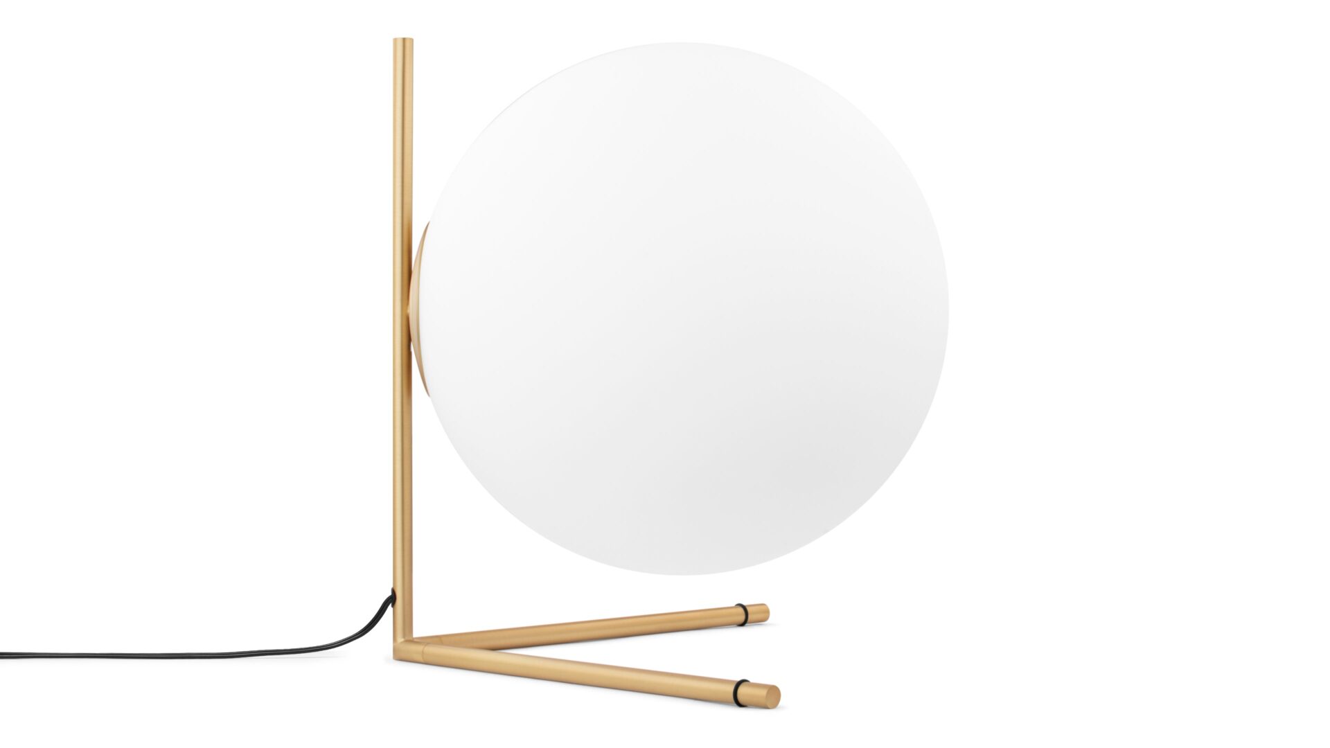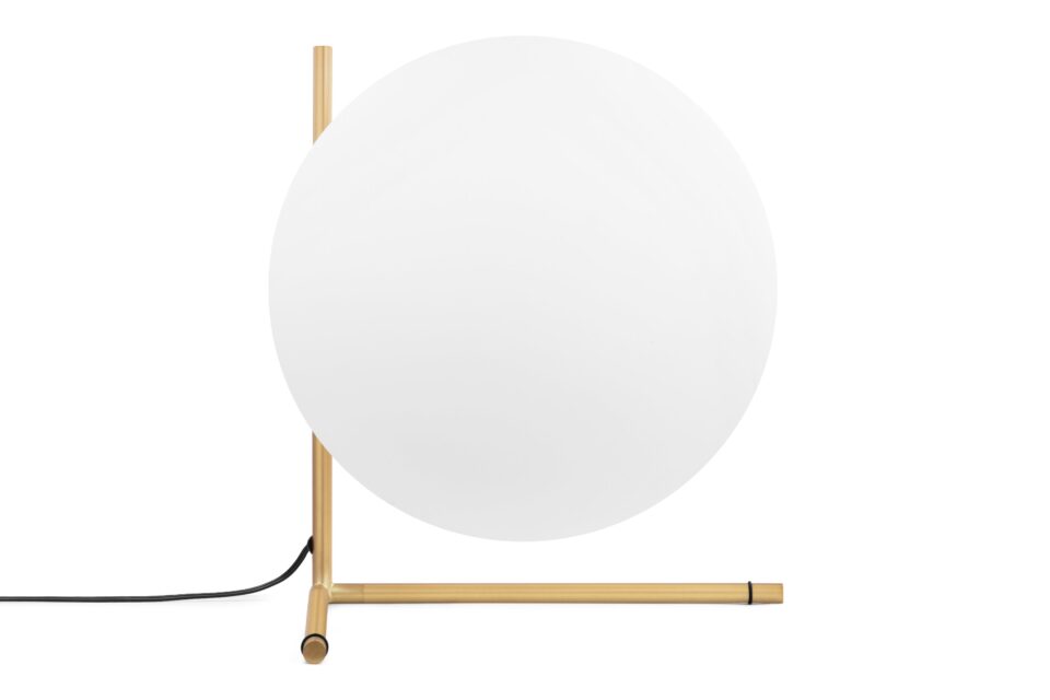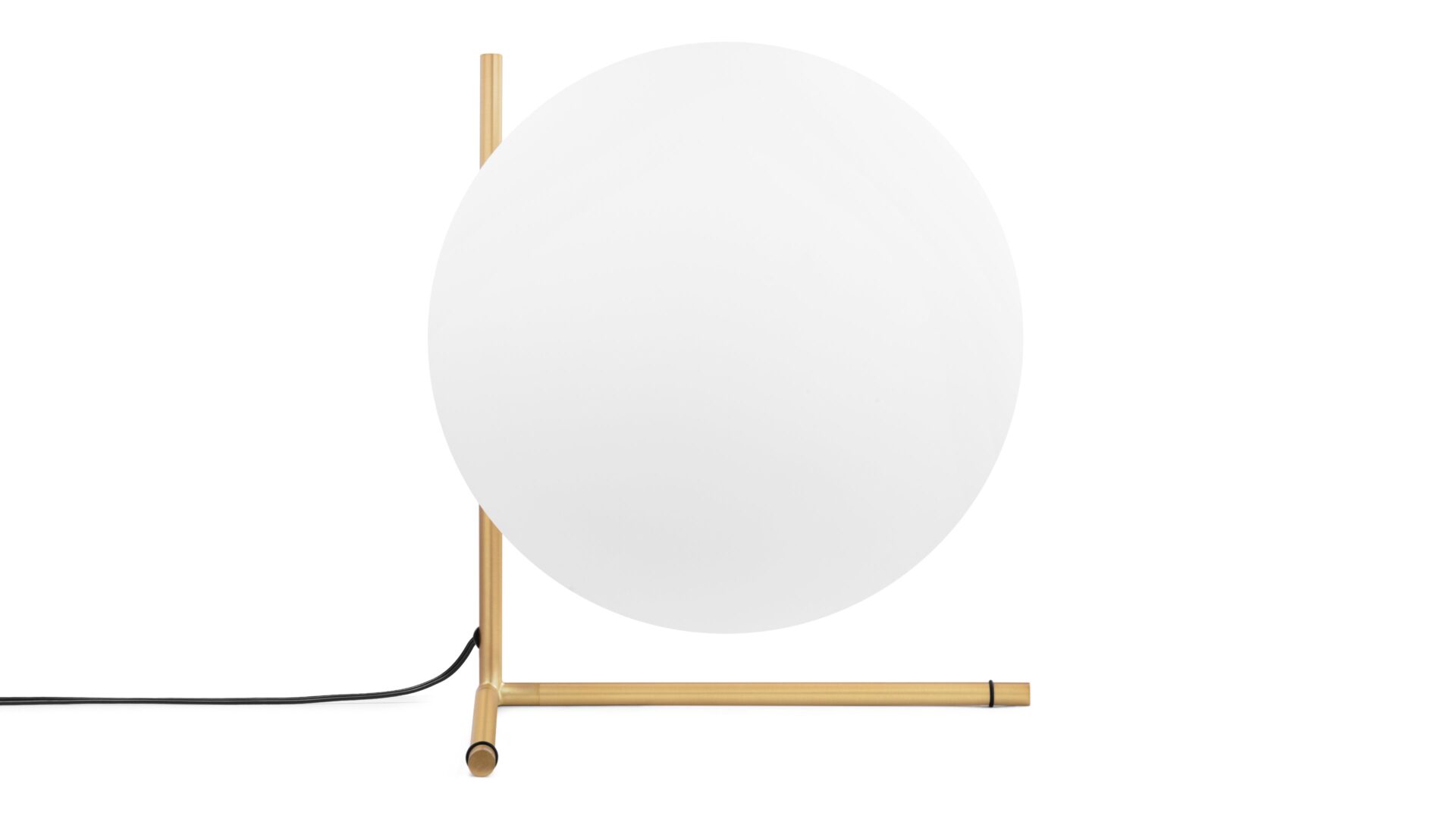 Meticulously crafted with a steel frame and offered in brushed brass, chrome, and black finishes, this modern table lamp features a striking blown-glass opal diffuser that rests elegantly on its slim stem. The IC T2 Table Lamp is skillfully designed to provide gentle ambient illumination.