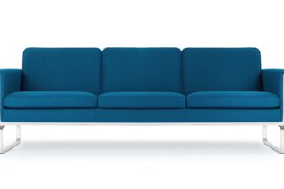 Discover the exquisite Jura Sofa, an embodiment of classic mid-century Danish design. Embodying a boxy silhouette and sleek steel runners that elegantly encase the arms and seamlessly merge into the frame, this sofa brings a touch of contemporary elegance to any setting. The rich blue wool upholstery beautifully contrasts with the shining metal accents, while the plush foam-cushioned seat ensures supreme comfort.
