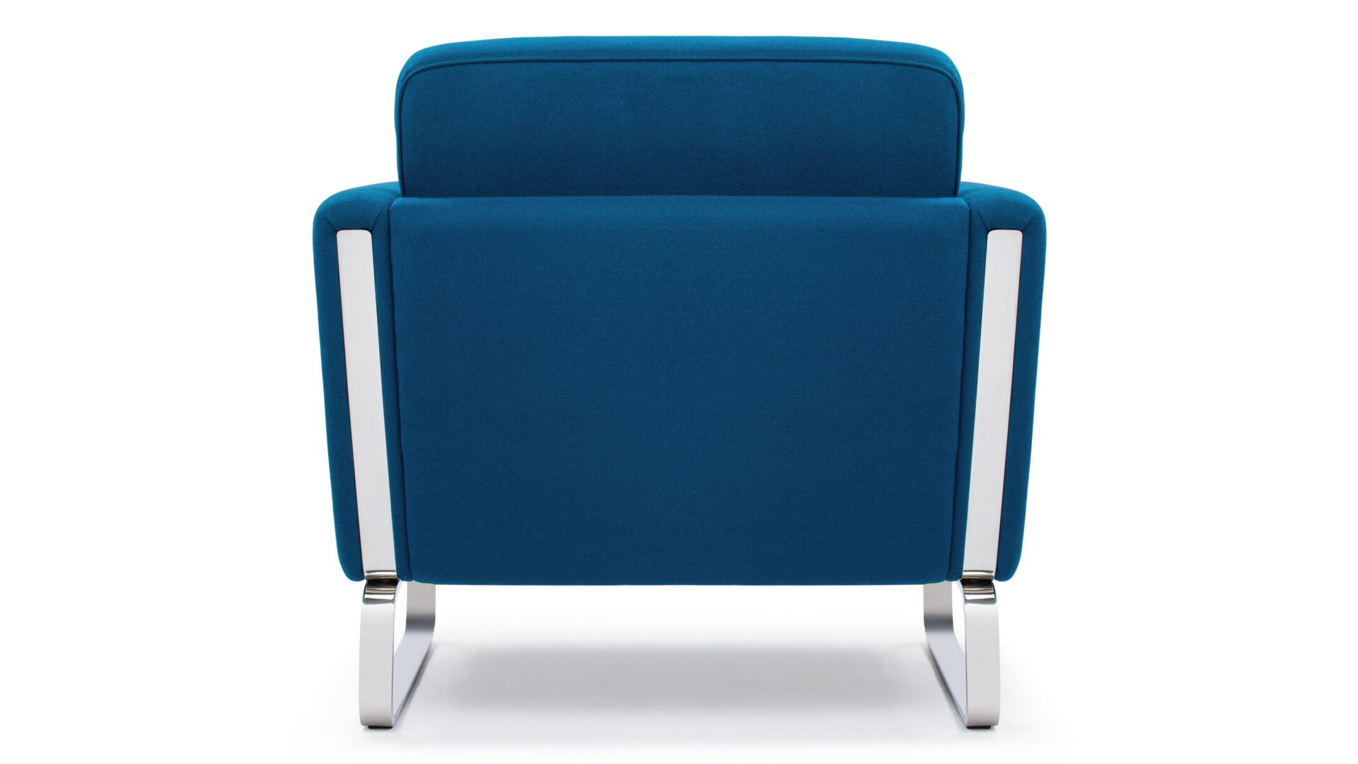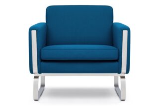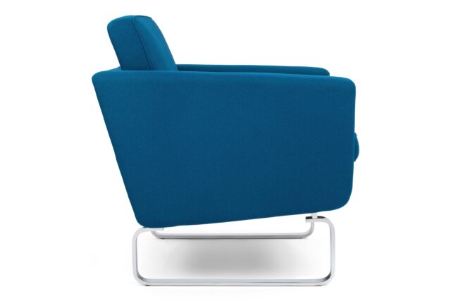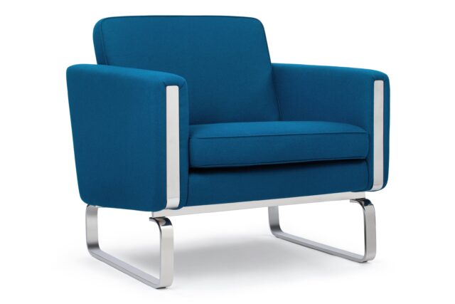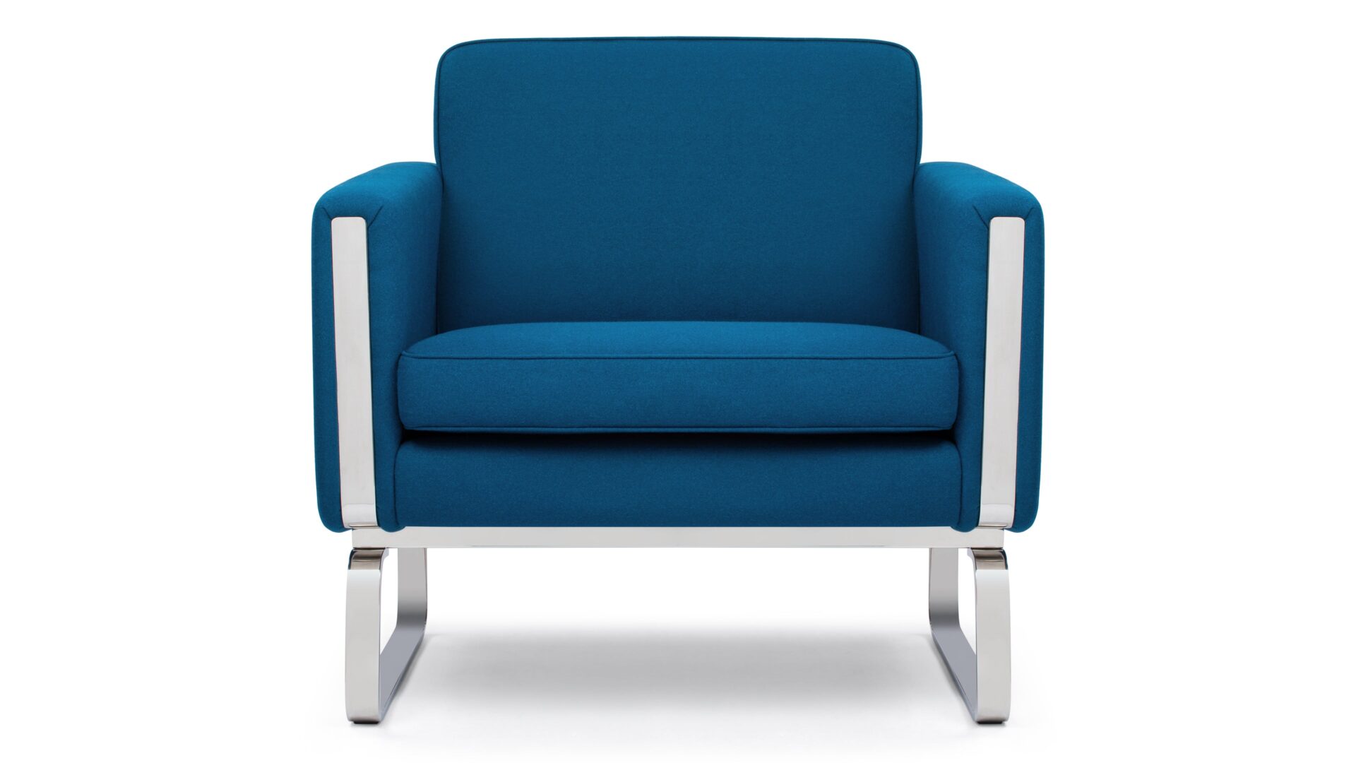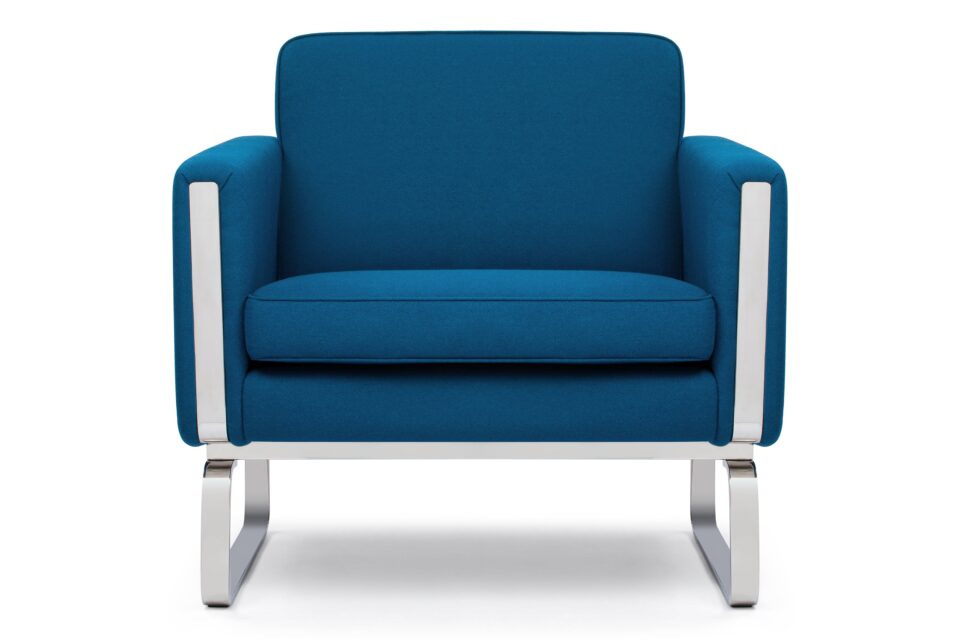 Elevate your space with the enchanting Jura Lounge Chair, a masterpiece embodying the essence of classic mid-century Danish design. Crafted with a boxy silhouette and sleek polished steel runners that elegantly encircle the arms and seamlessly integrate into the frame, this chair introduces a touch of contemporary elegance to any setting. The rich, deep blue wool upholstery strikingly complements the lustrous metal accents, while the plush foam-cushioned seat delivers unrivaled comfort.