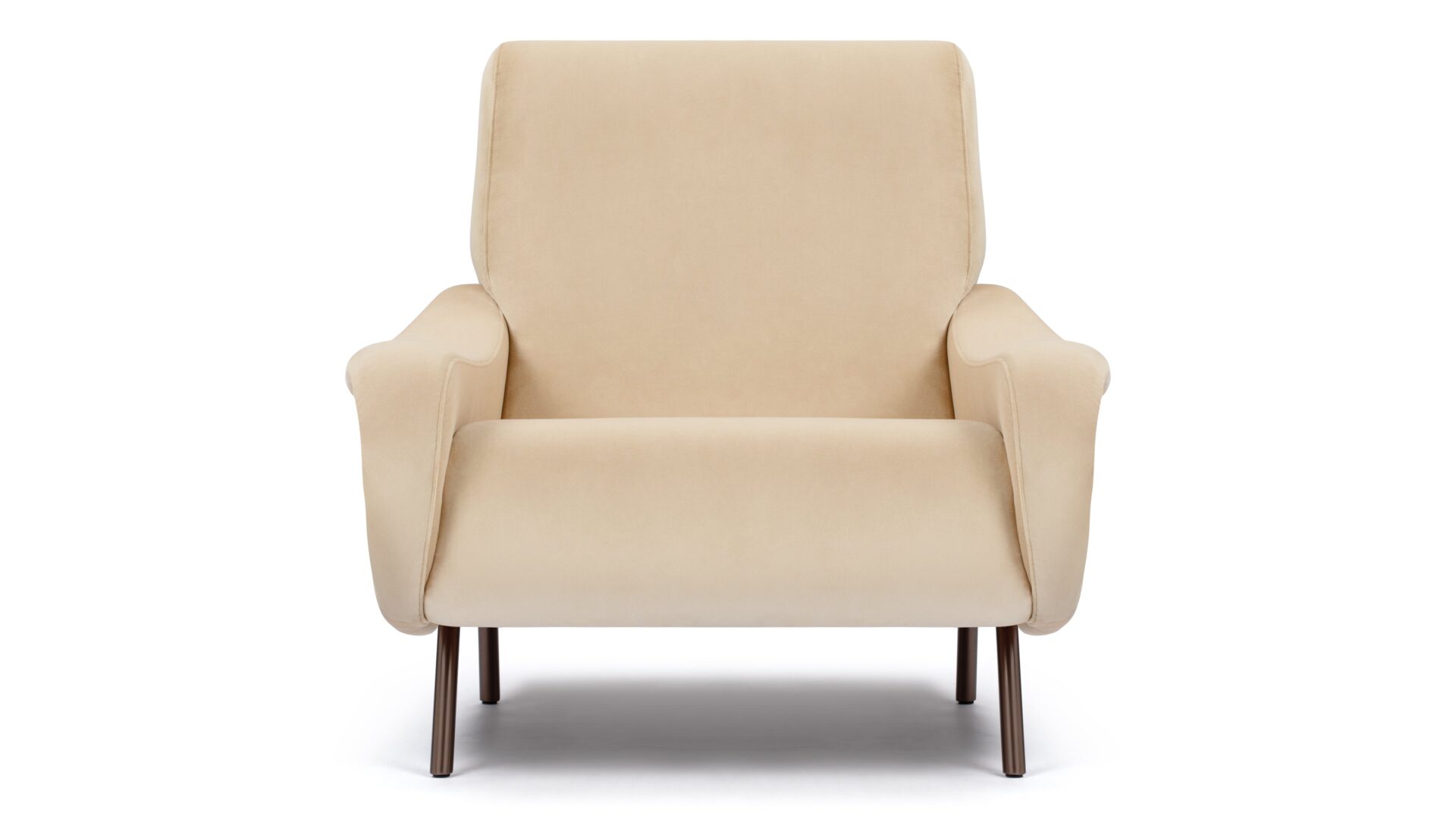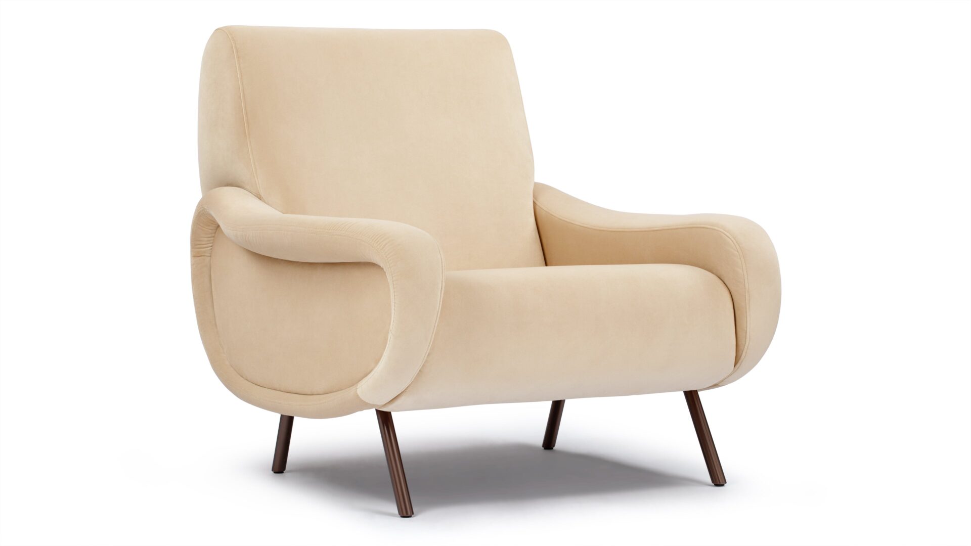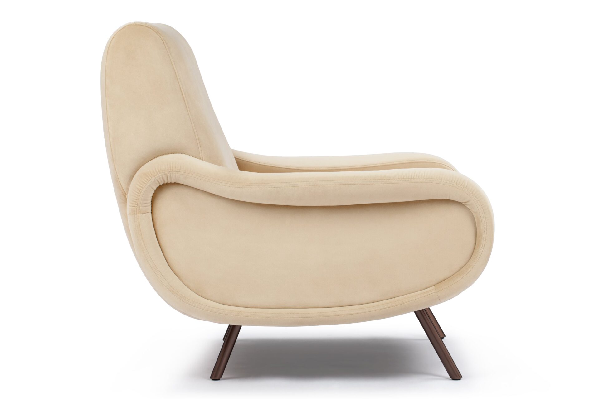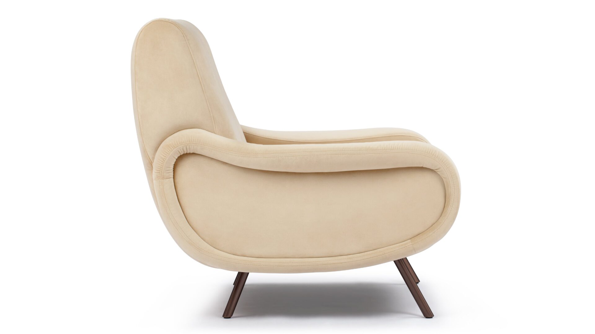 Introducing the Lady Armchair, a chic furnishing that seamlessly melds retro charm with contemporary comfort. Boasting elegantly curved arms and stylish splayed wooden legs, this piece is a nod to mid-century modern aesthetics, adding a touch of sophistication to any modern living area. The chair is luxuriously upholstered in easy-to-maintain velvet, offered in a curated palette of refined hues to easily complement diverse interior styles.