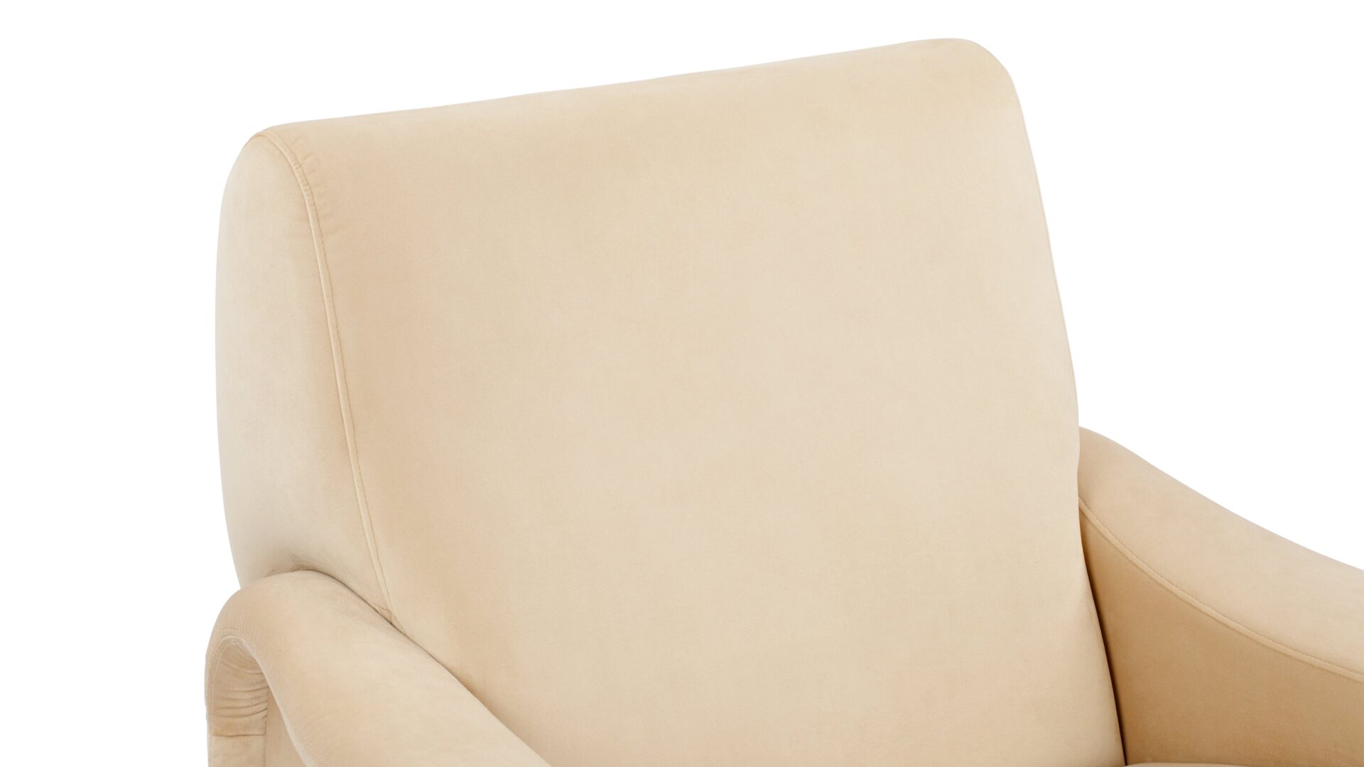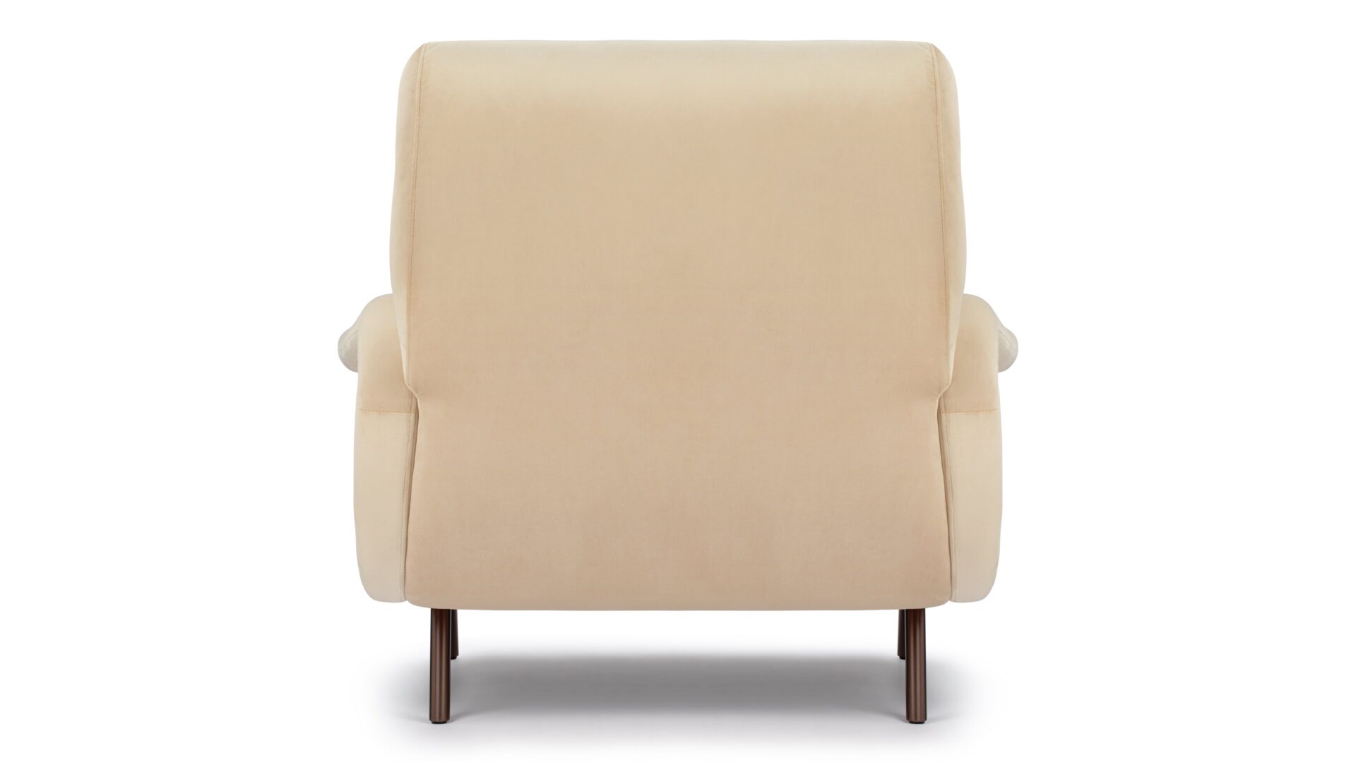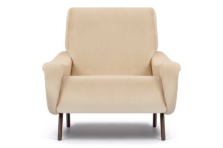 Discover the Lady Armchair, a perfect fusion of vintage charm and modern comfort. Featuring elegantly curved arms and stylish splayed wooden legs, this mid-century inspired piece brings sophistication to any living space. Upholstered in luscious ecru velvet, it adds an opulent touch while being easy to maintain. Elevate your decor with timeless style and cozy luxury.