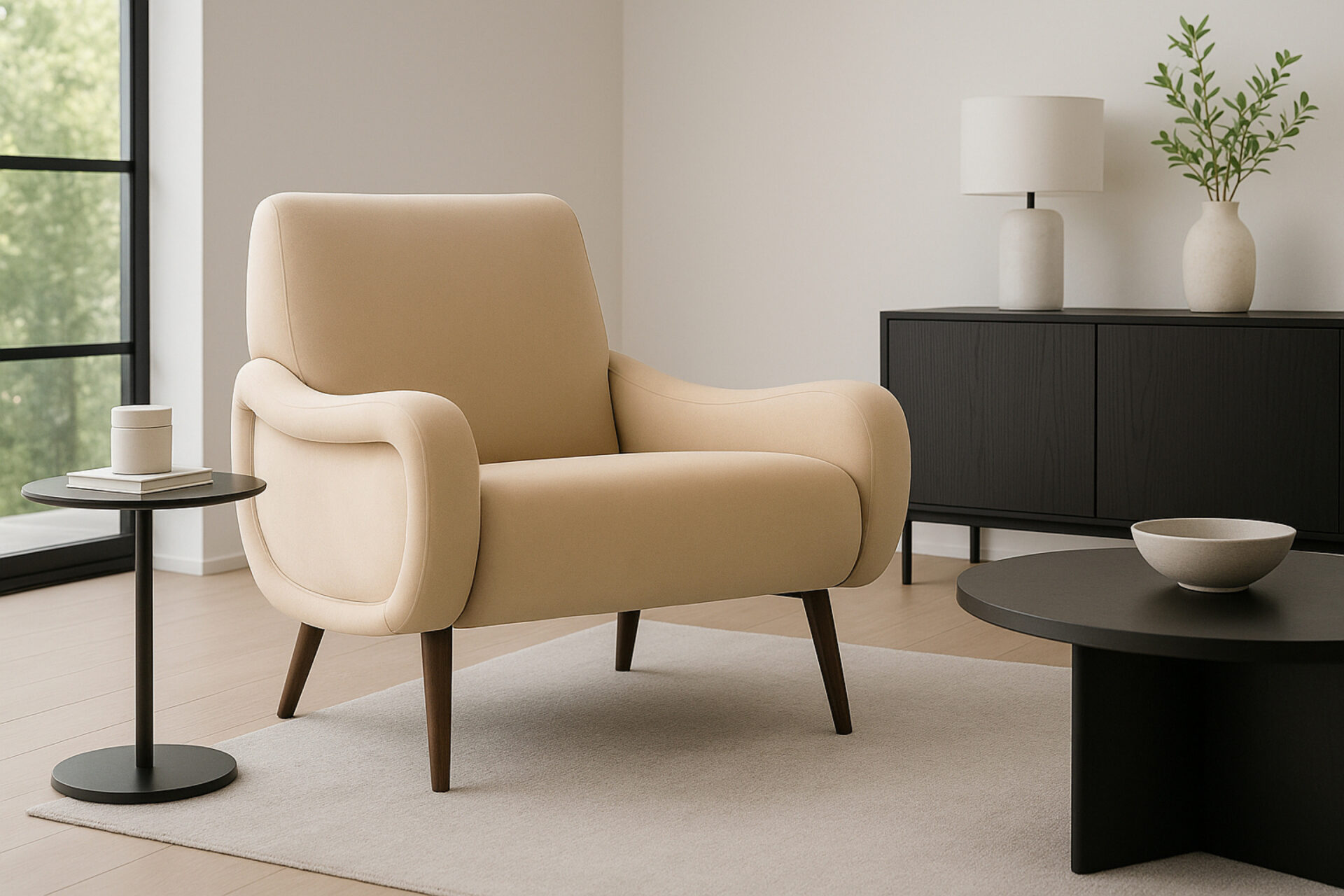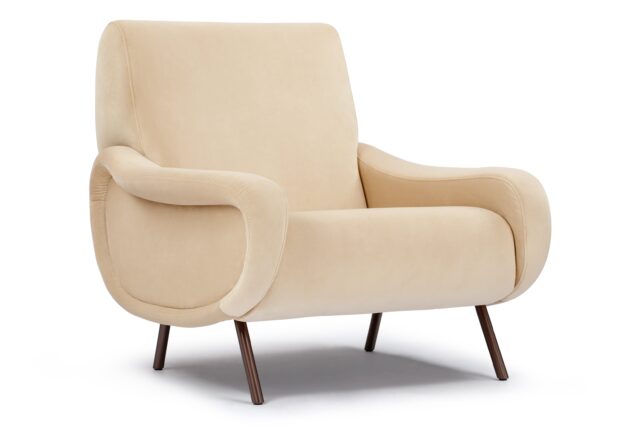 Inspired by a timeless charm, the Lady Armchair showcases a mid-century modern aesthetic with a retro twist, accentuated by its graceful curved arms and splayed wooden legs. Harmoniously blending vintage vibes with a touch of contemporary flair.