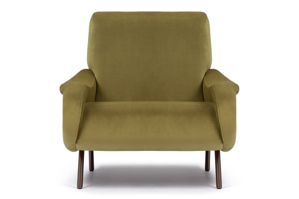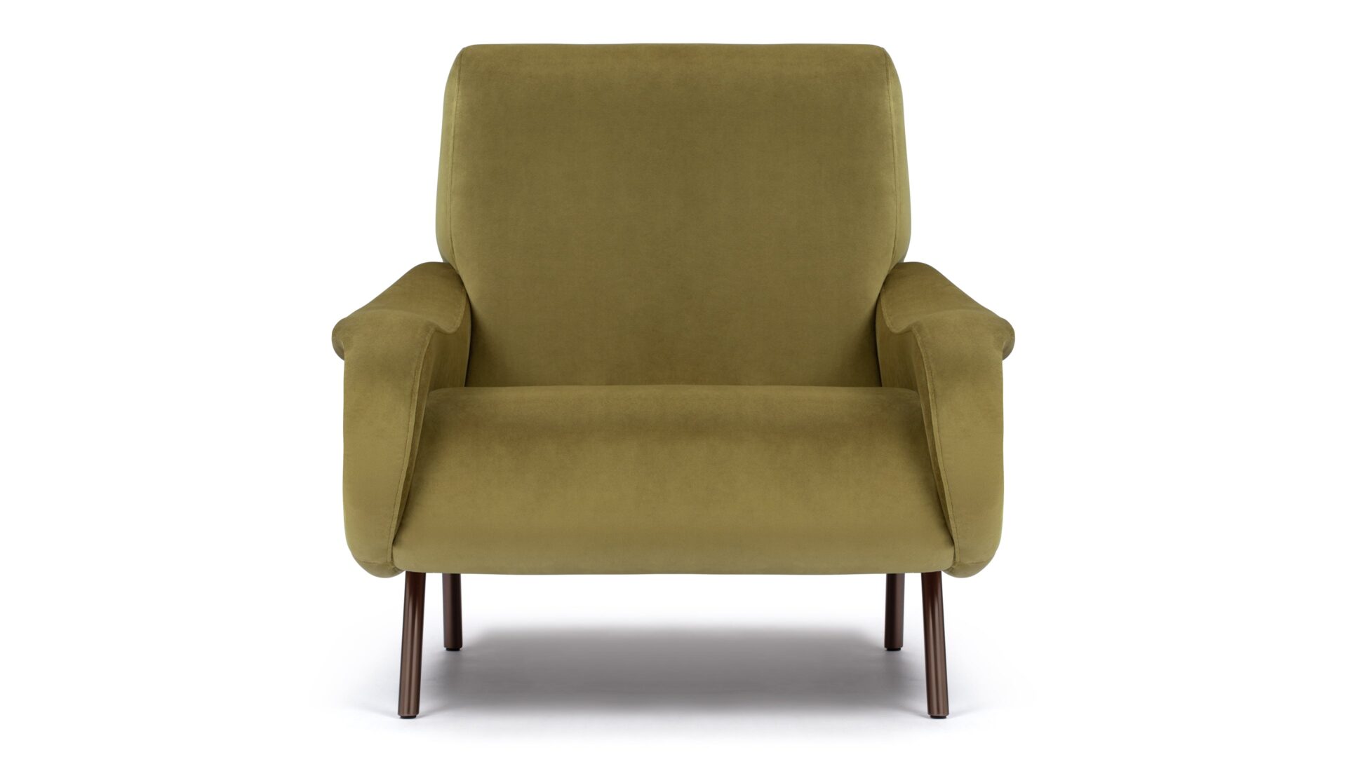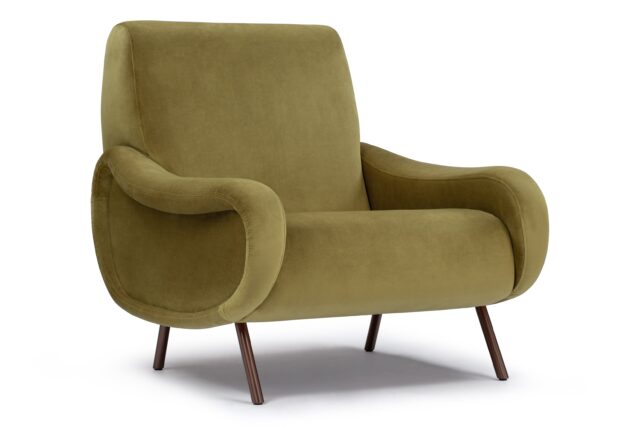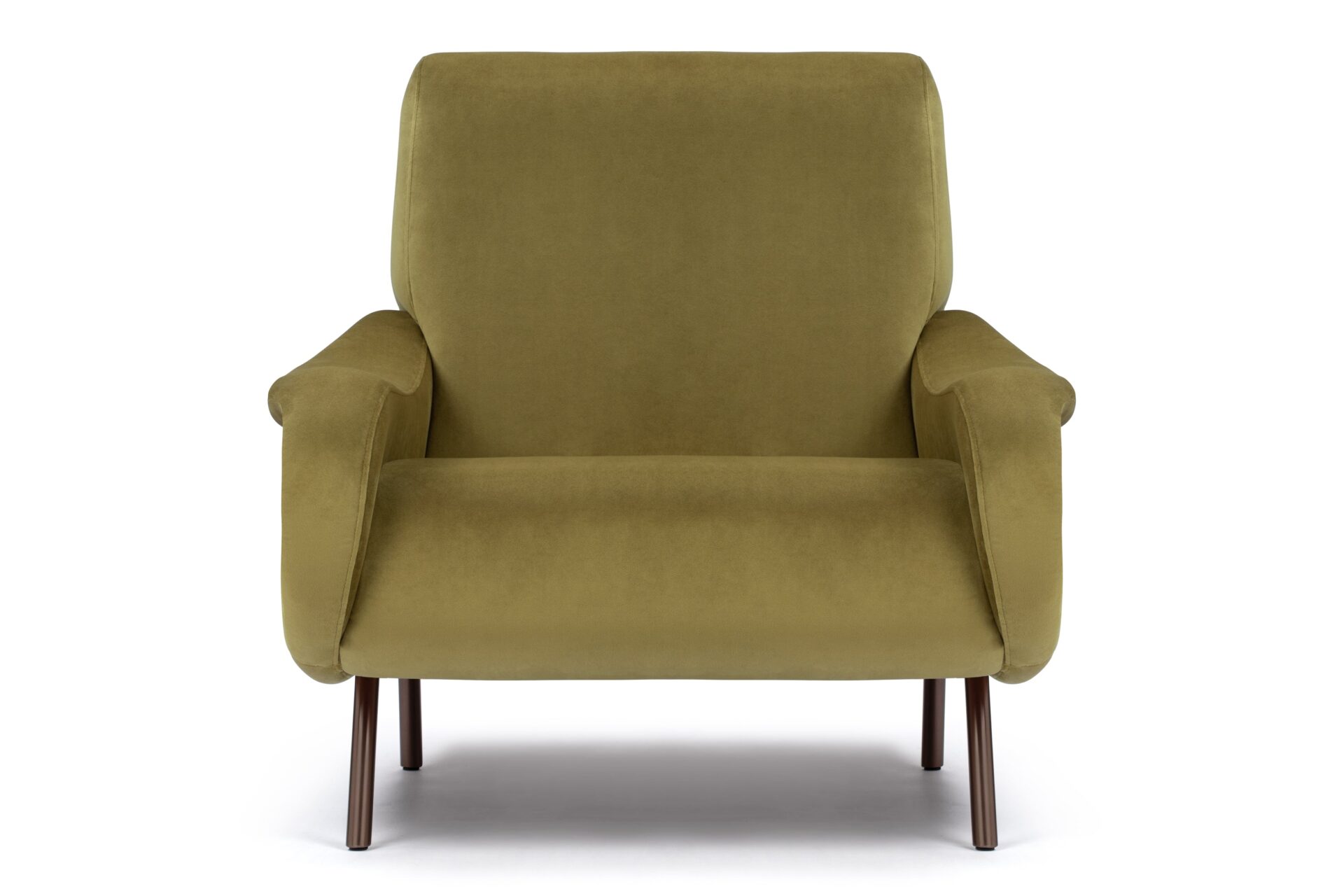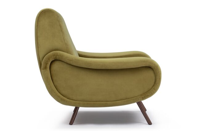 Introducing the Lady Armchair, a chic furnishing that seamlessly melds retro charm with contemporary comfort. Boasting elegantly curved arms and stylish splayed wooden legs, this piece is a nod to mid-century modern aesthetics, adding a touch of sophistication to any modern living area. The chair is luxuriously upholstered in easy-to-maintain velvet, offered in a curated palette of refined hues to easily complement diverse interior styles.