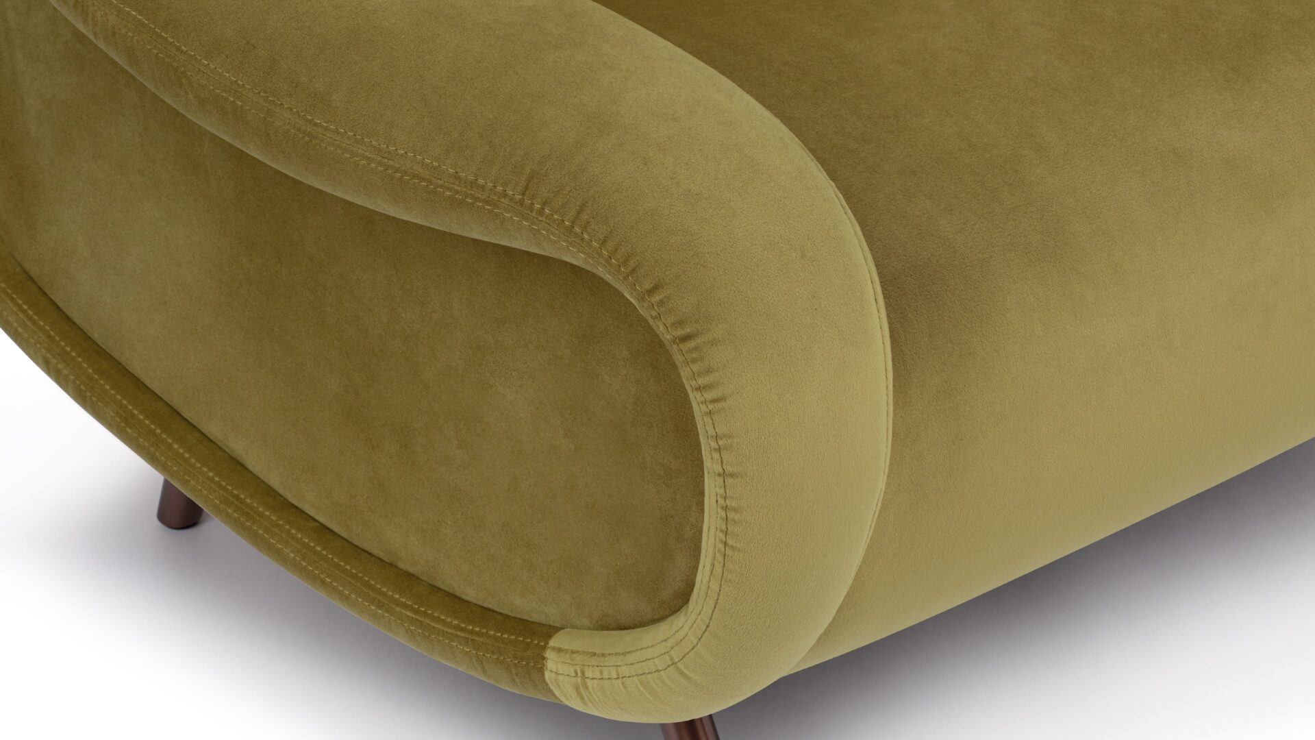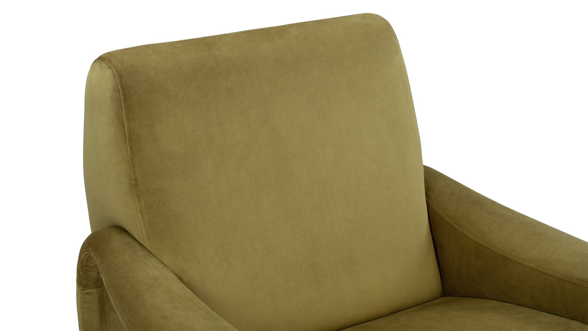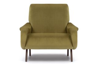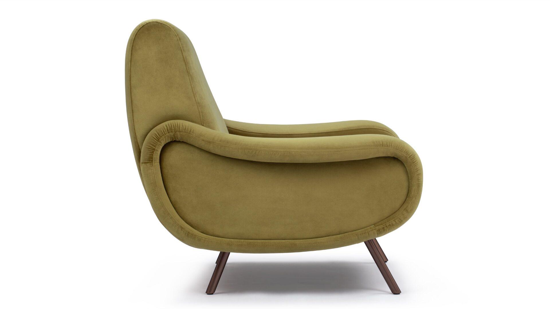 Introducing the Lady Armchair, seamlessly blending retro charm with contemporary comfort. Its elegantly curved arms and stylish splayed wooden legs nod to mid-century modern aesthetics, adding sophistication to any living area. Luxuriously upholstered in Olive Gold Velvet, this armchair marries visual appeal and practical comfort, offering an opulent and easy-to-maintain choice for everyday use, adaptable to various decor schemes.
