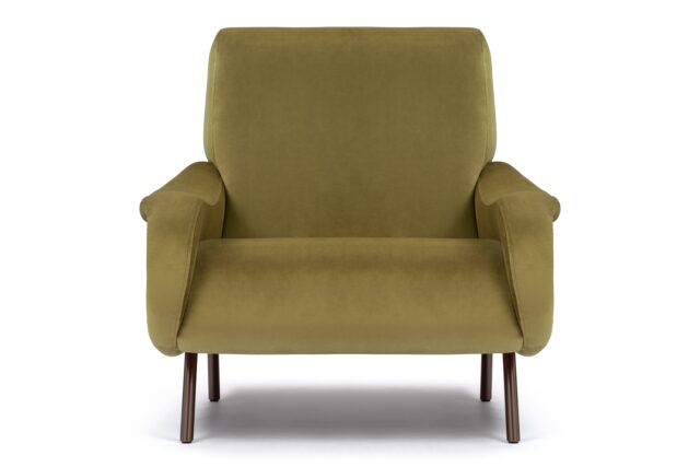 Inspired by a timeless charm, the Lady Armchair showcases a mid-century modern aesthetic with a retro twist, accentuated by its graceful curved arms and splayed wooden legs. Harmoniously blending vintage vibes with a touch of contemporary flair.