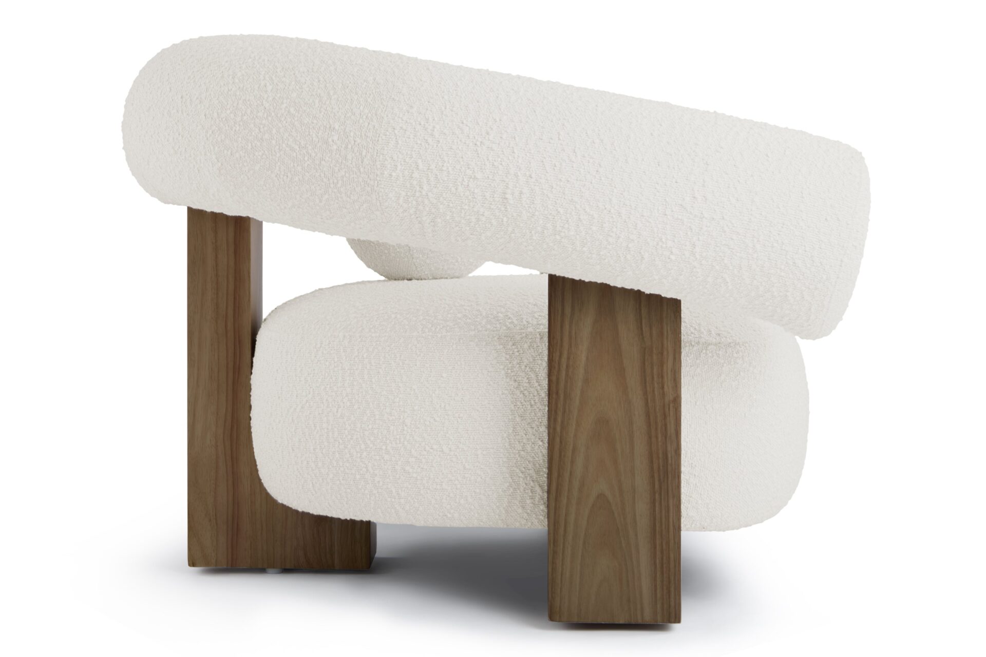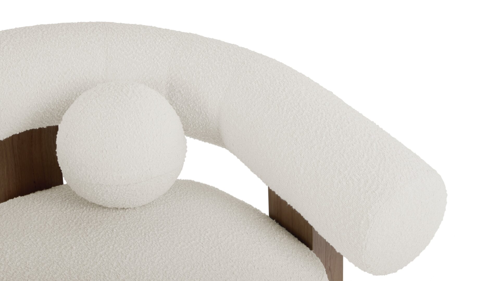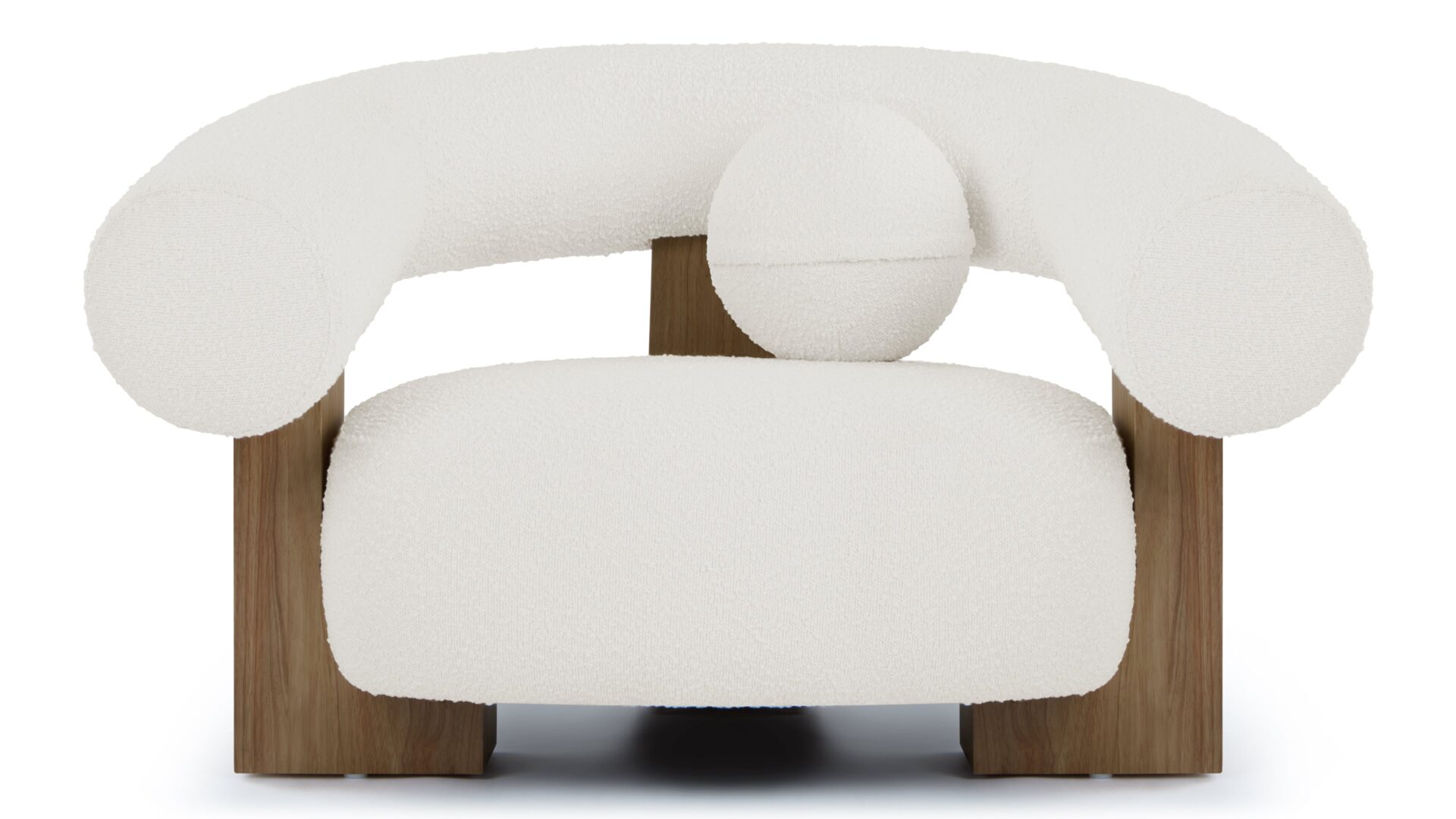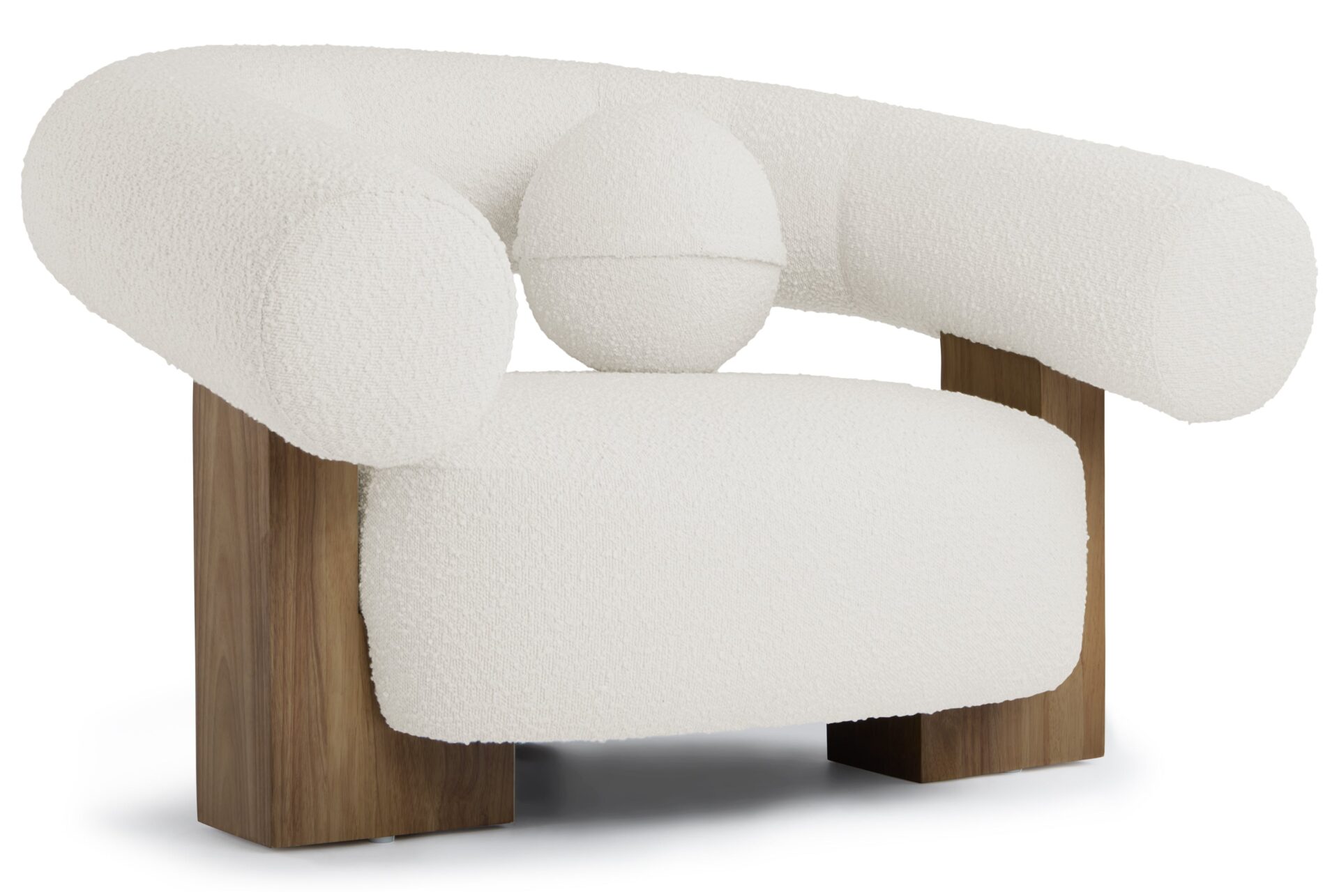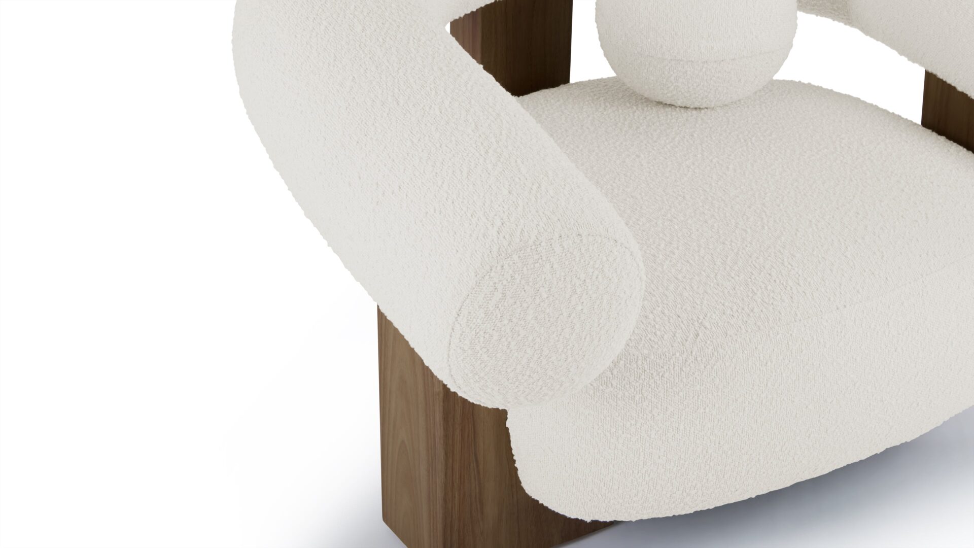 Embrace boldness with the Liv Lounge Chair, an artistic statement with wide, curved arms and a distinctive spherical cushion that adds a playful sculptural touch. Crafted from robust walnut pieces, it juxtaposes dark wood with sumptuously textured Pearl Boucle fabric for a luxurious and enduring appeal. This chair seamlessly blends comfort and creativity, serving as an elegant focal point in any living space.