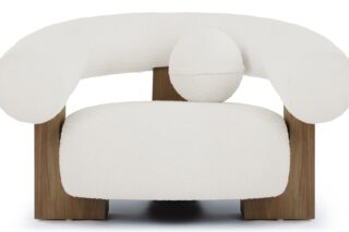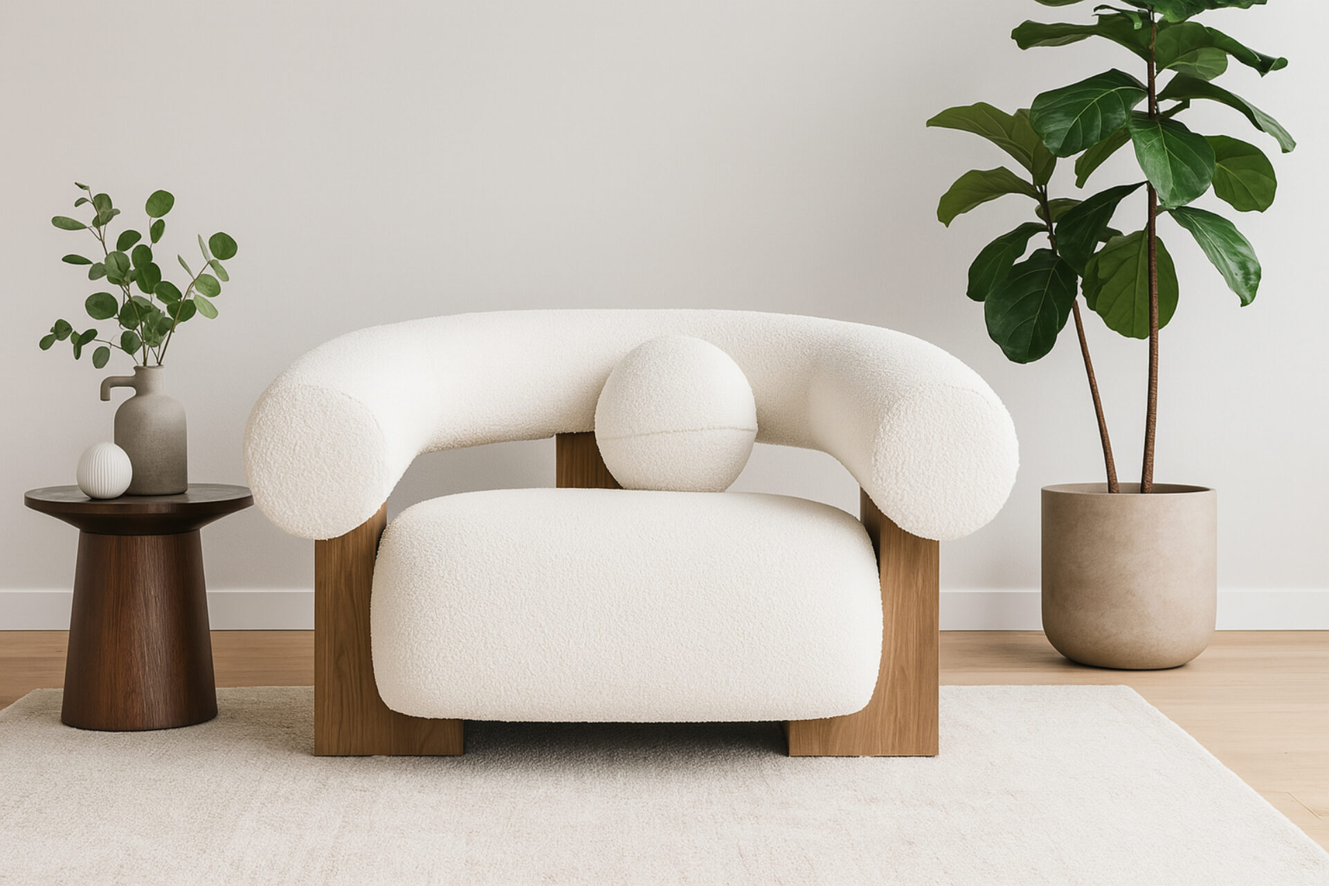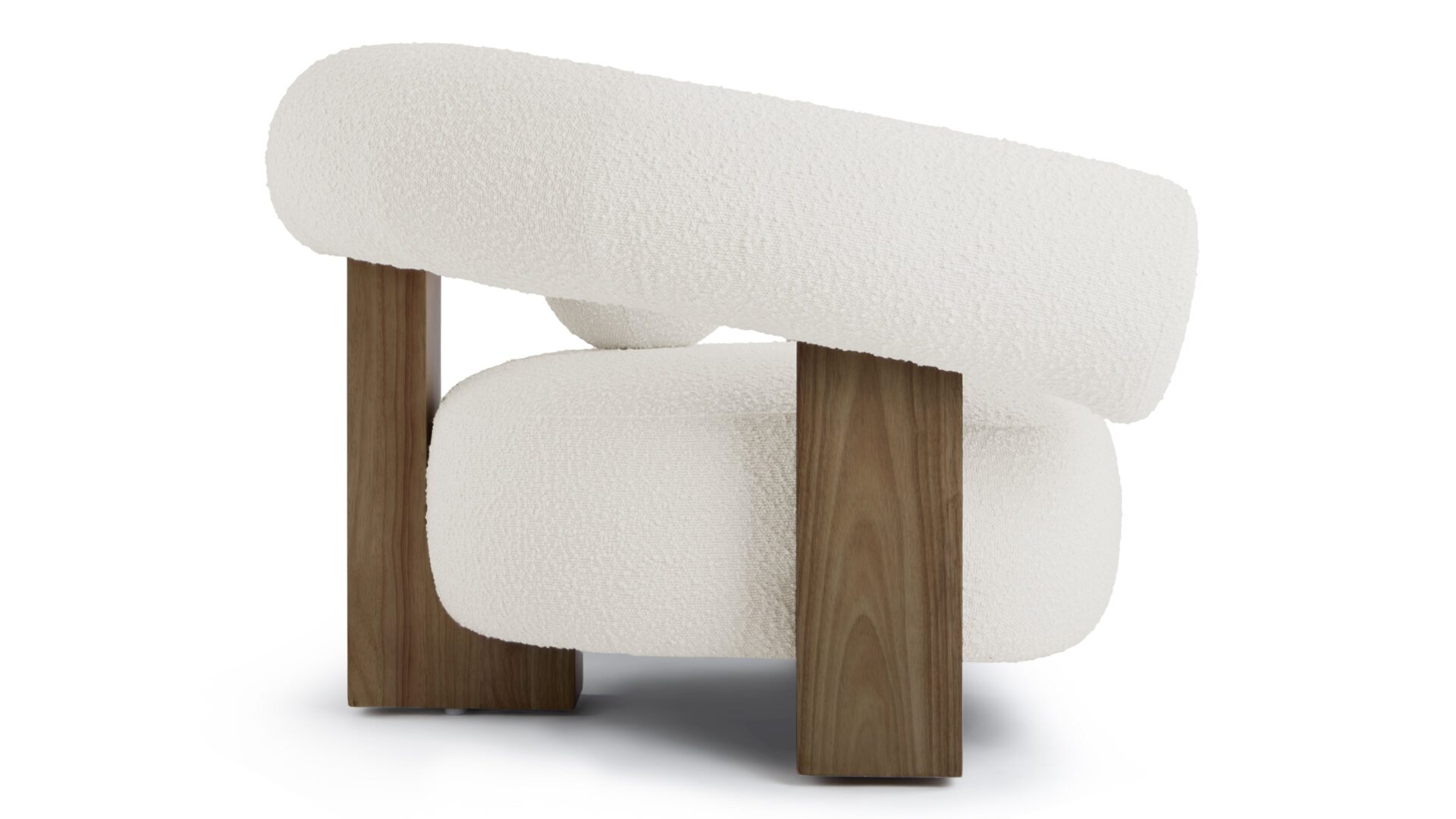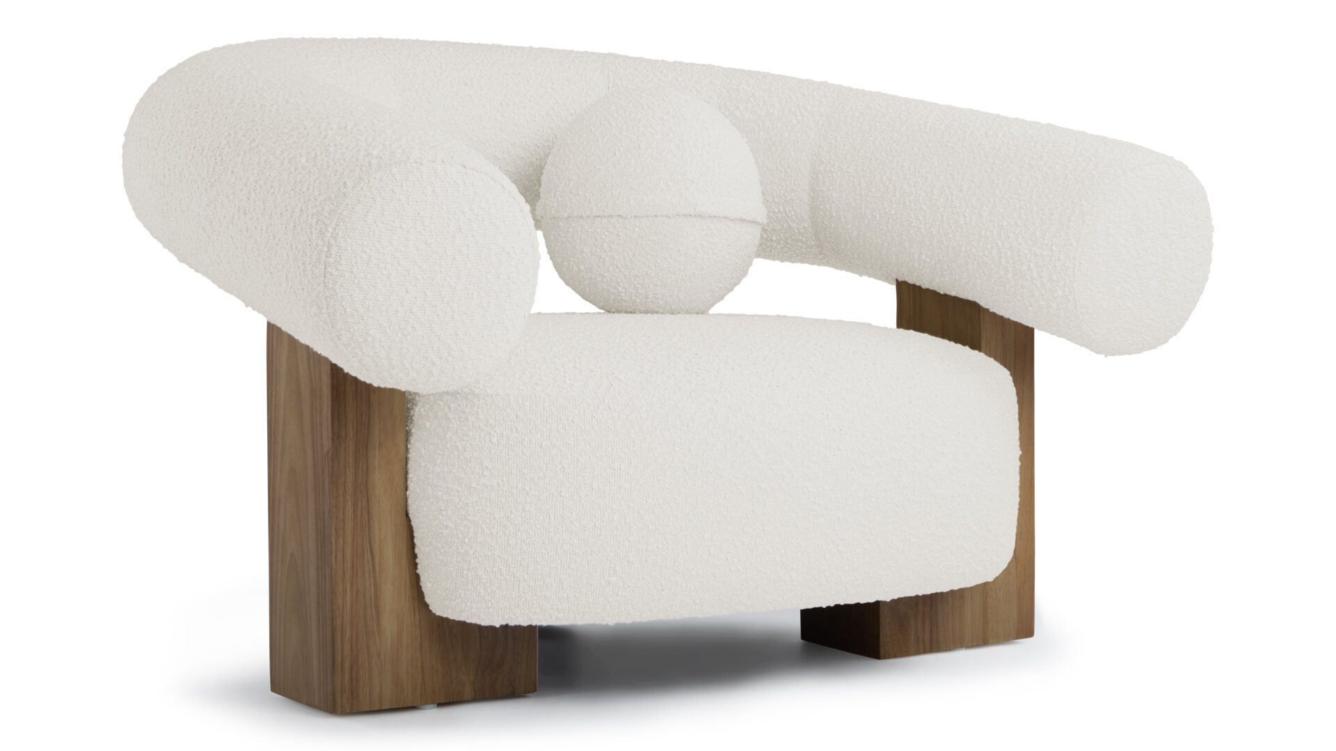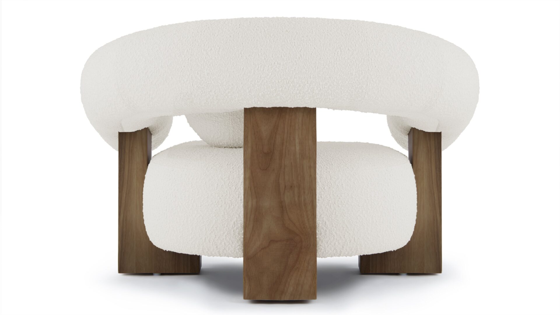 Embrace boldness with the Liv Lounge Chair, an artistic statement with wide, curved arms and a distinctive spherical cushion that adds a playful sculptural touch. Crafted from robust walnut pieces, it juxtaposes dark wood with sumptuously textured Pearl Boucle fabric for a luxurious and enduring appeal. This chair seamlessly blends comfort and creativity, serving as an elegant focal point in any living space.