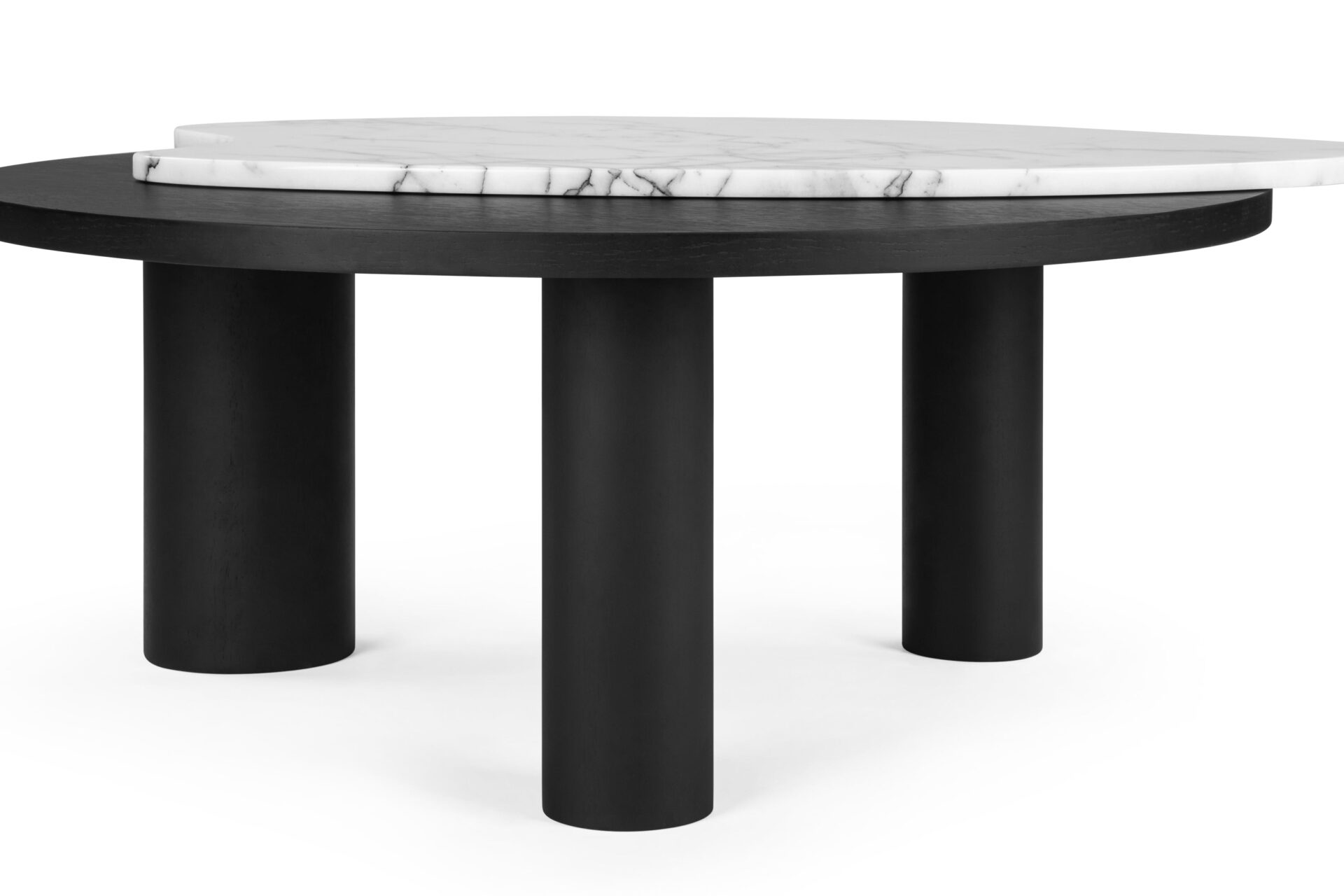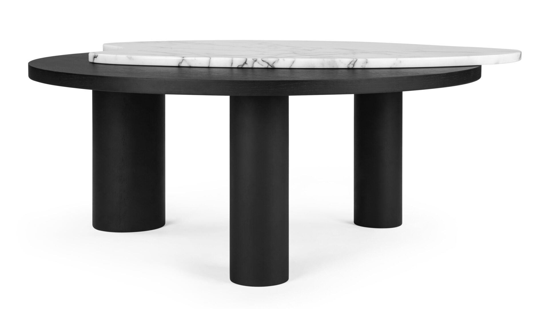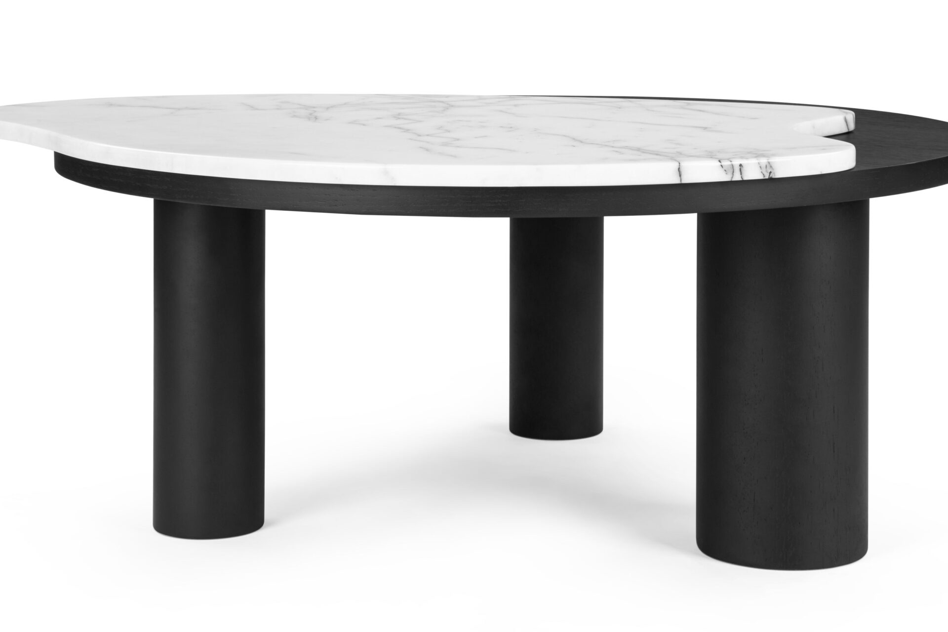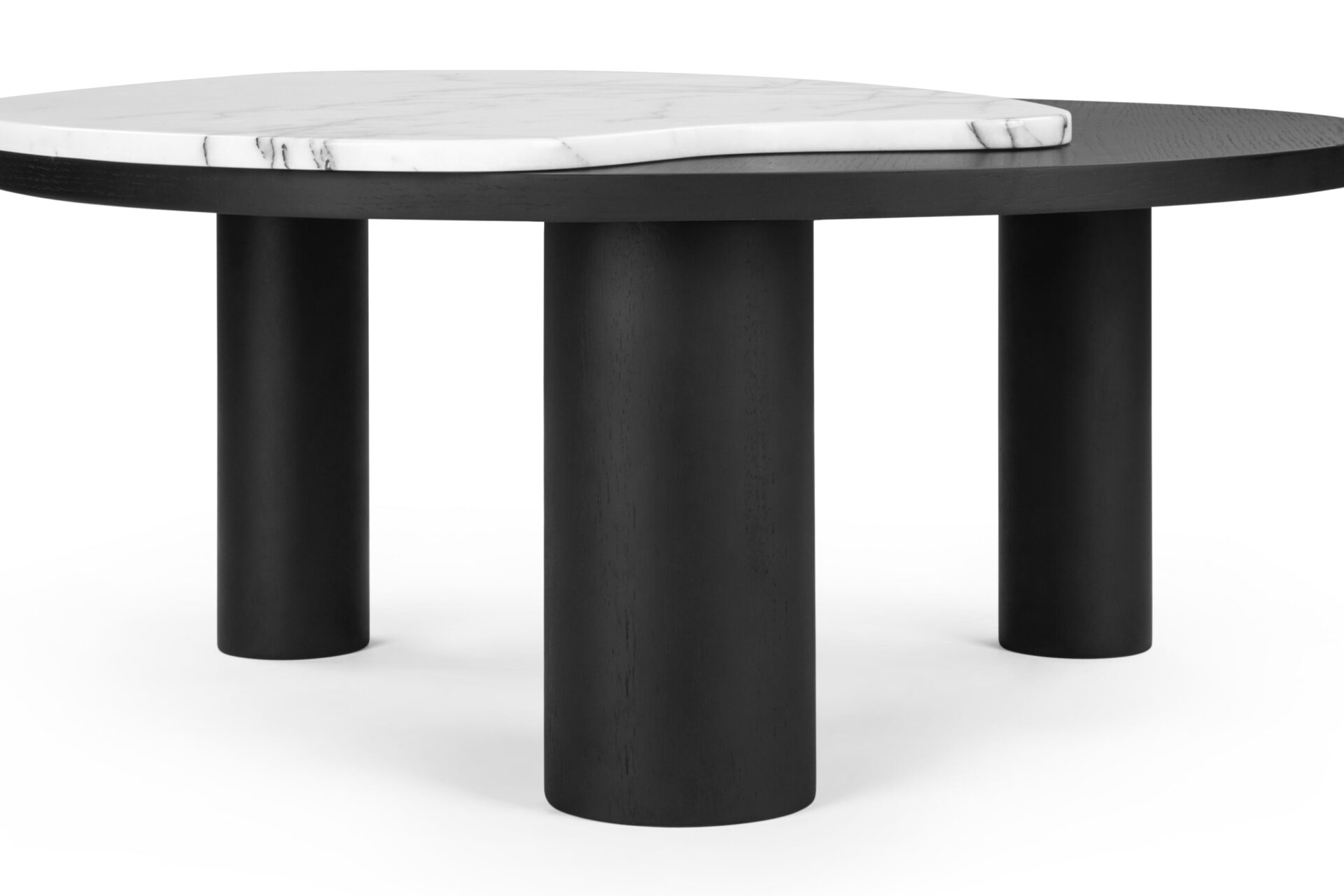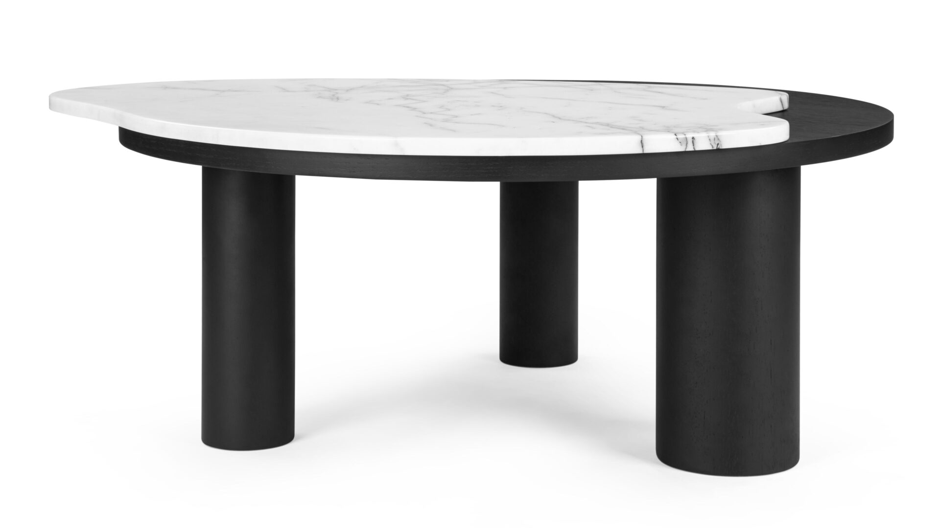 Discover the striking modern design of the Lugo Coffee Table, featuring organic shapes and asymmetrical legs for a contemporary aesthetic. Crafted with a mix of matte black and honed white Calacatta marble, each piece showcases unique, natural dark veins for a touch of sophistication and style.