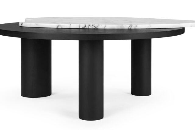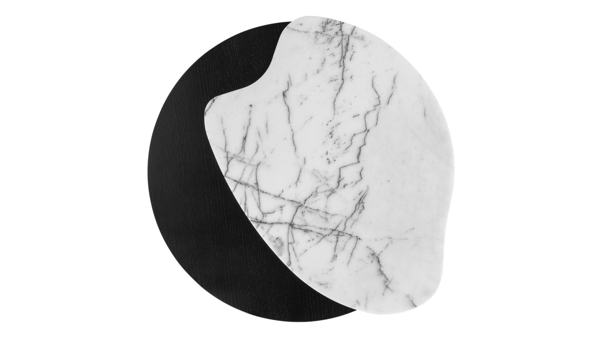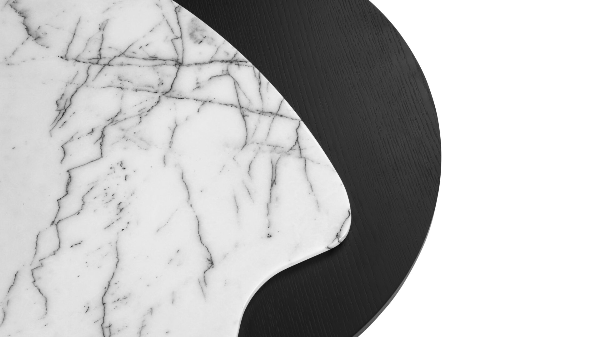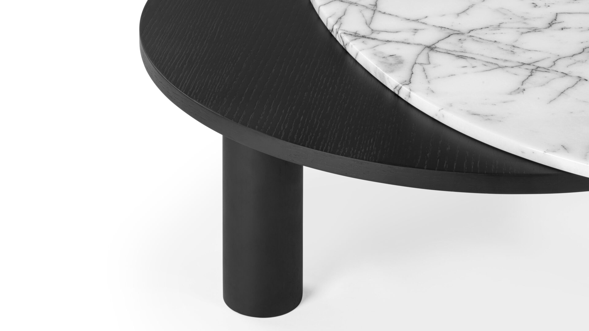 Discover the exquisite Lugo Coffee Table showcasing a captivating blend of Calacatta marble and painted oak veneer. The sophisticated design marries the matte black finish of painted oak against the stunning white Calacatta marble. The honed marble surface gracefully exhibits natural variations in vein color and positioning, imparting a distinct charm to every piece. Boasting organic shapes and intertwining curved sections, this coffee table is enhanced by its asymmetrical pillar legs. A practical yet tasteful addition, it effortlessly keeps daily essentials handy while making a striking statement in any living area with its Italian-inspired allure.