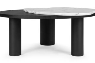 Discover the striking modern design of the Lugo Coffee Table, featuring organic shapes and asymmetrical legs for a contemporary aesthetic. Crafted with a mix of matte black and honed white Calacatta marble, each piece showcases unique, natural dark veins for a touch of sophistication and style.