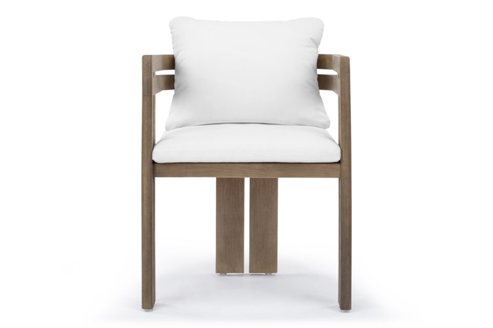 Elevate your outdoor living space with the Lusso Outdoor Collection, inspired by midcentury modern elegance. Crafted from durable teak wood, the Lusso Outdoor Dining Chair in Weathered Teak with White Cushions embodies sophistication and resilience. Every detail is meticulously designed to enhance your outdoor area's allure and personality, creating a perfect blend of style and comfort for memorable gatherings.