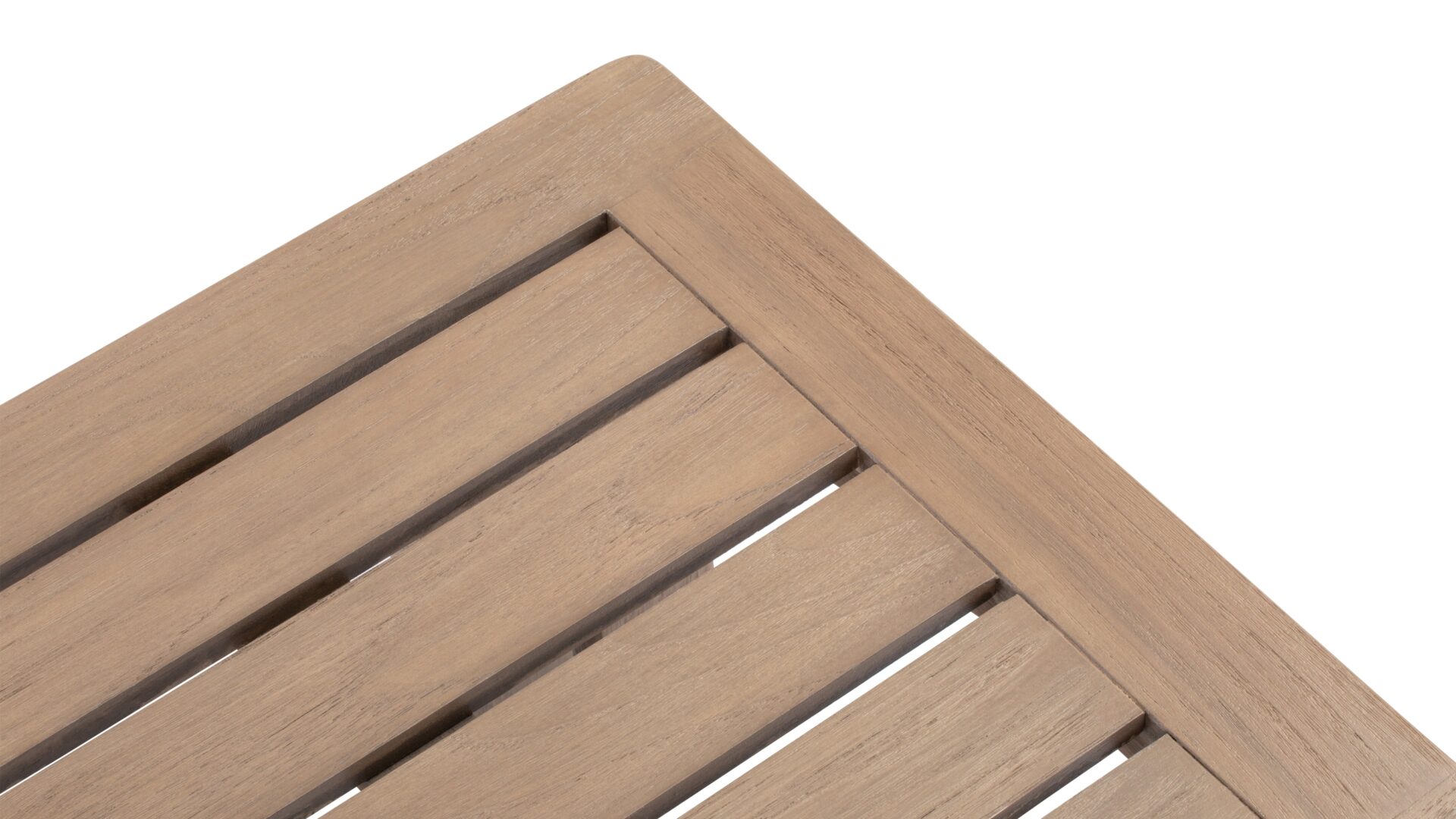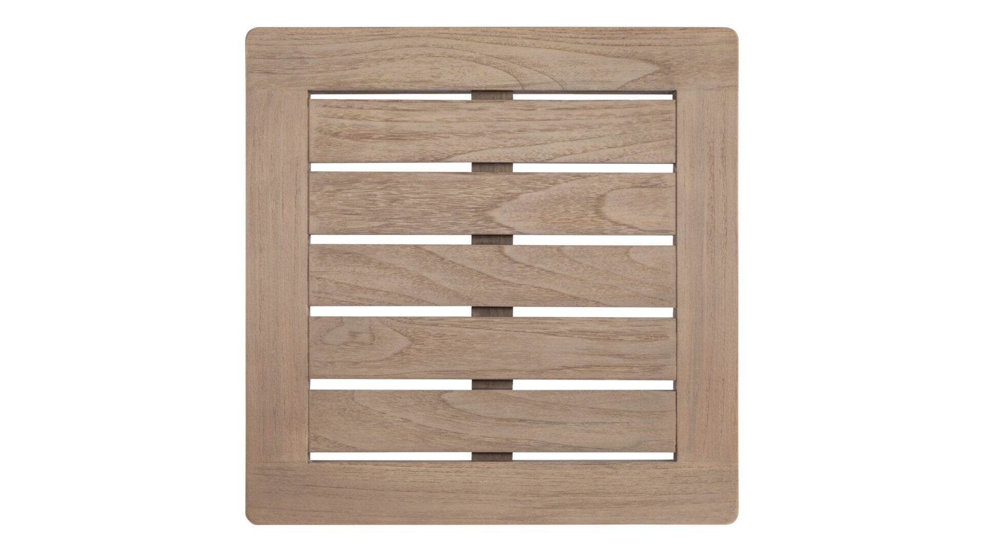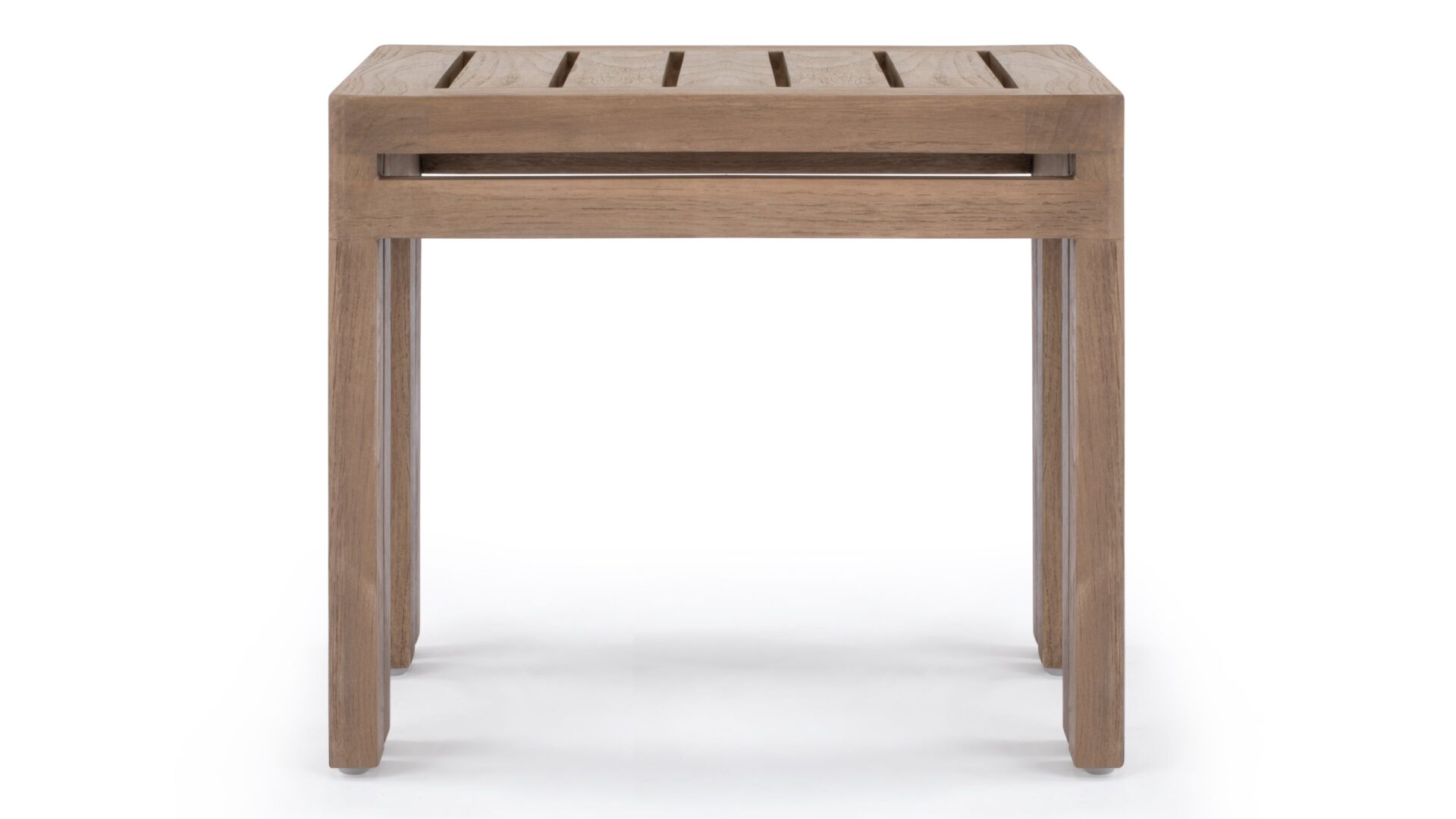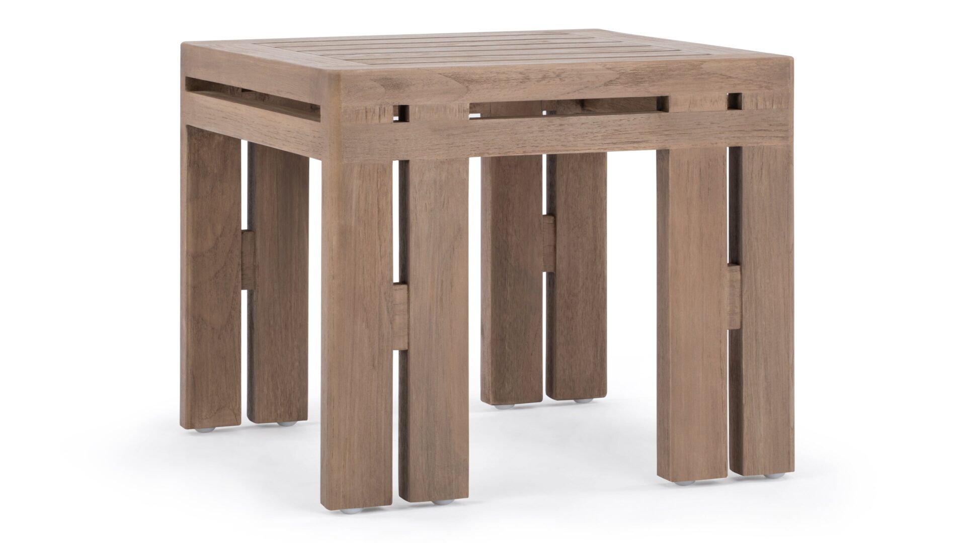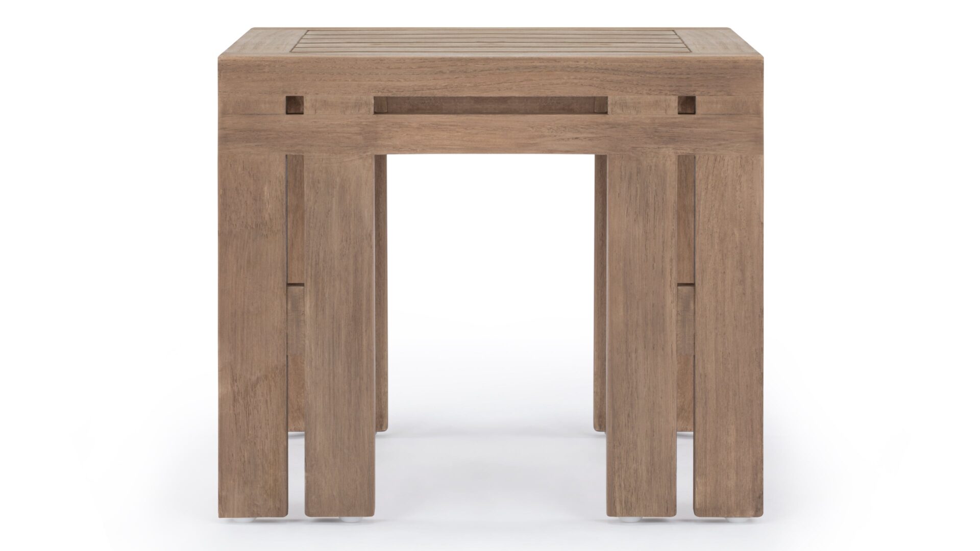 Elevate your outdoor living experience with the chic Lusso Outdoor Collection crafted in luxurious weathered teak wood. The Lusso Outdoor Side Table, an exquisite piece inspired by midcentury modern design, radiates elegance. Precision-tailored with sleek lines and a refined silhouette, it adds allure and personality to your outdoor space, perfectly blending style with functionality for your gatherings.