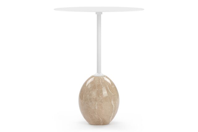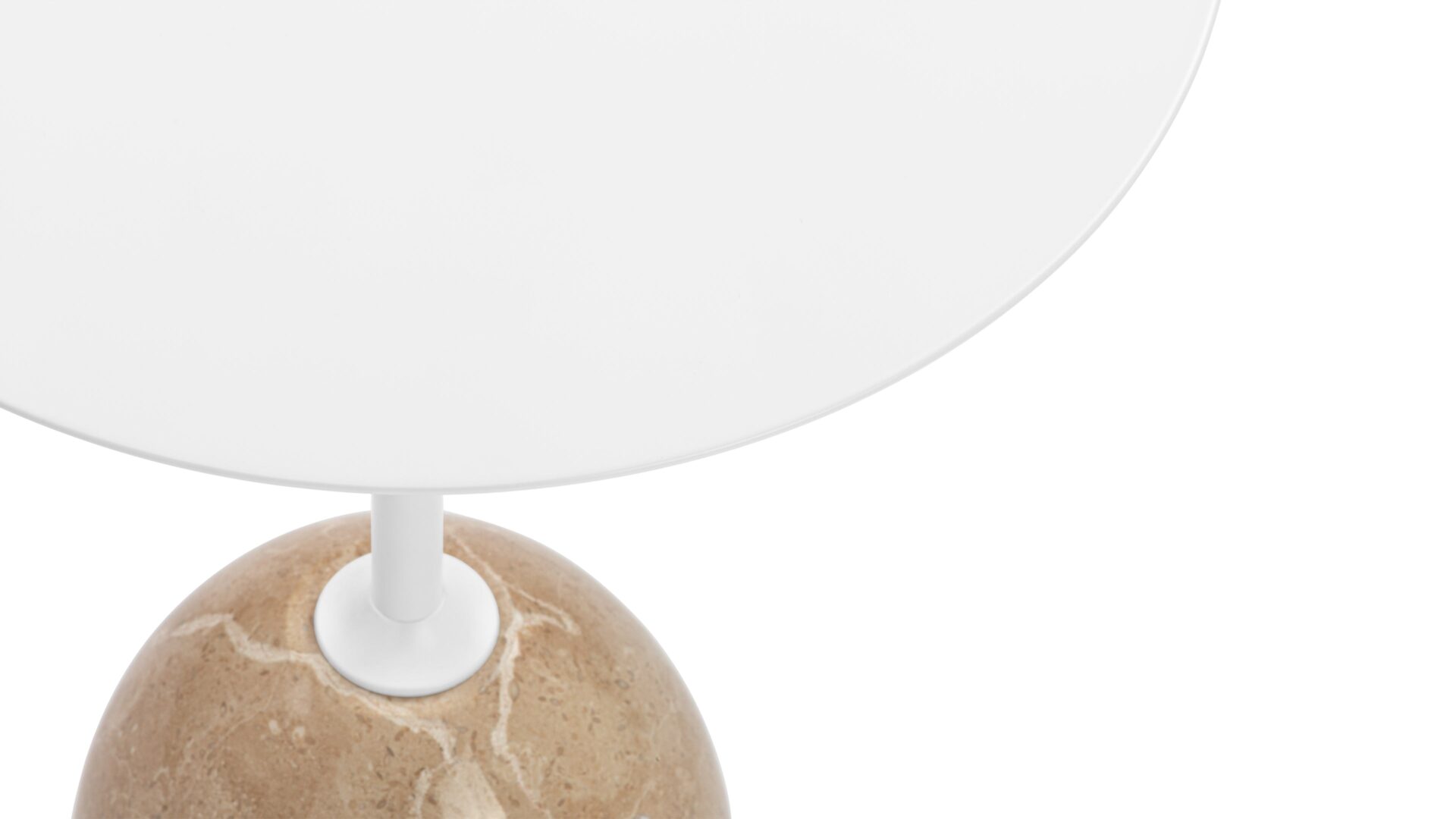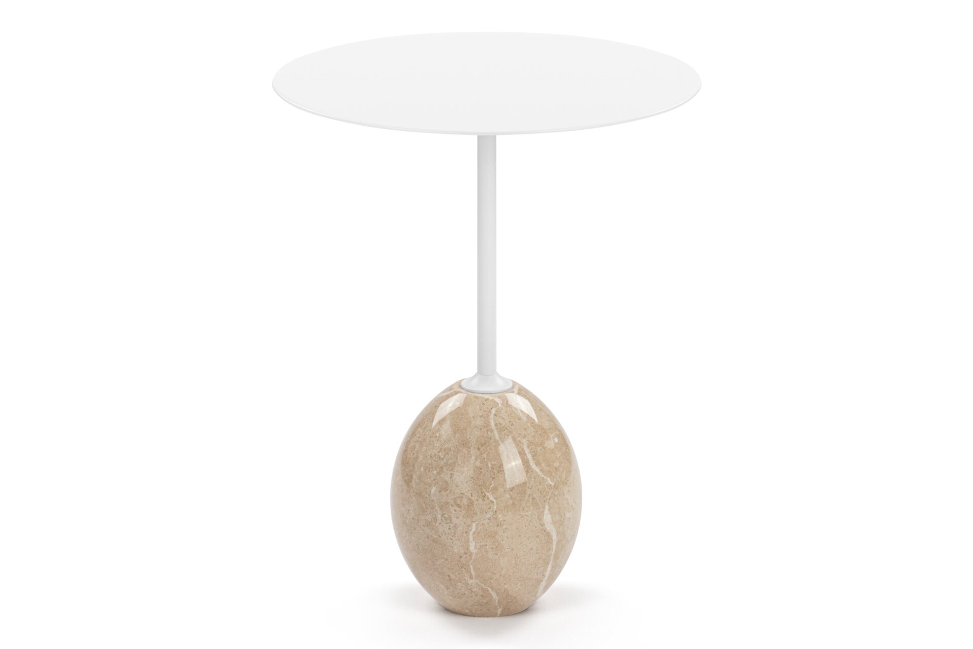 Discover the elegant Malmo Side Table boasting a marble base and a metal frame and tabletop in a matte white finish. This design strikes a harmonious balance between softness and strength, featuring a circular tabletop and a discreet presence that effortlessly complements diverse interiors. The warm-toned marble with its rich cream hue exudes sophistication, elevating any living space.