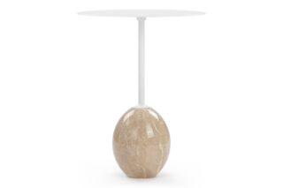 Discover the elegant Malmo Side Table boasting a marble base and a metal frame and tabletop in a matte white finish. This design strikes a harmonious balance between softness and strength, featuring a circular tabletop and a discreet presence that effortlessly complements diverse interiors. The warm-toned marble with its rich cream hue exudes sophistication, elevating any living space.