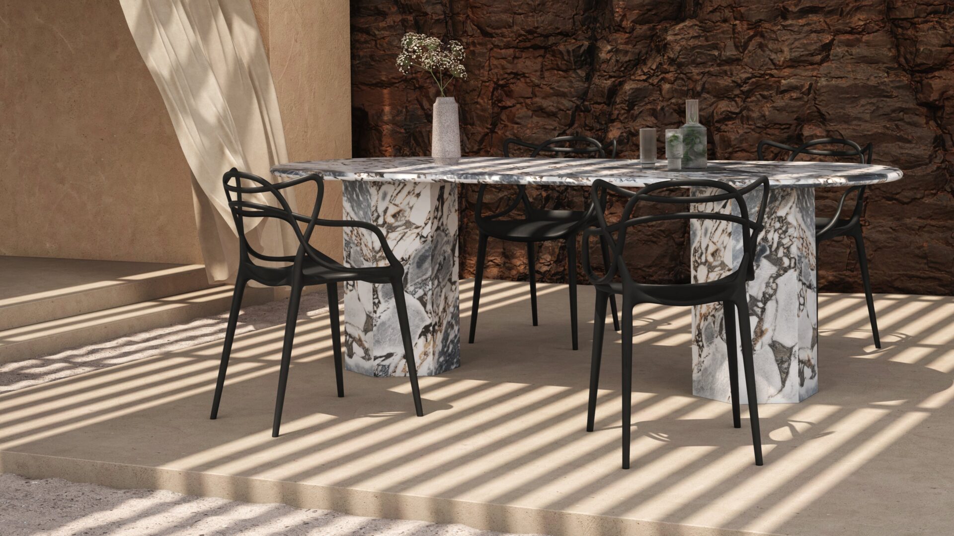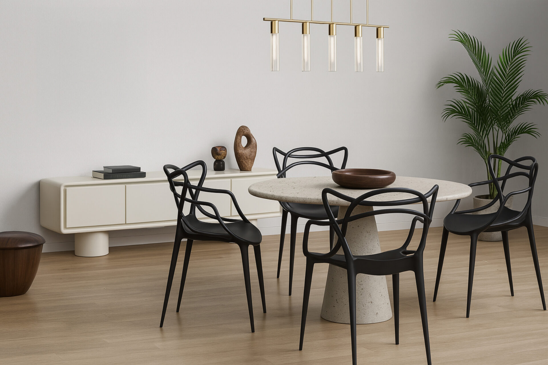 Experience the sleek and modern allure of The Master's Collection, showcasing a contemporary backrest and subtly tapered legs. The iconic Master's Chair combines bold aesthetics with affordability, while the refined Master's dining chair boasts timeless appeal and exquisite craftsmanship. Discover the modern icon, the [Product Name] bar stool in striking black, a versatile and durable seating solution that exudes sophistication in compact living spaces.