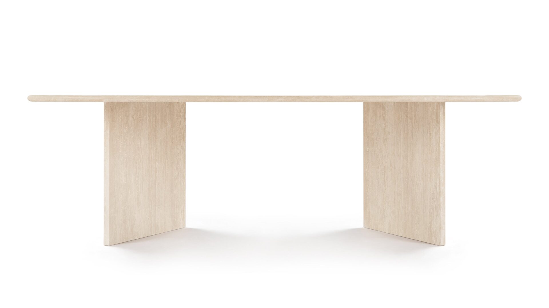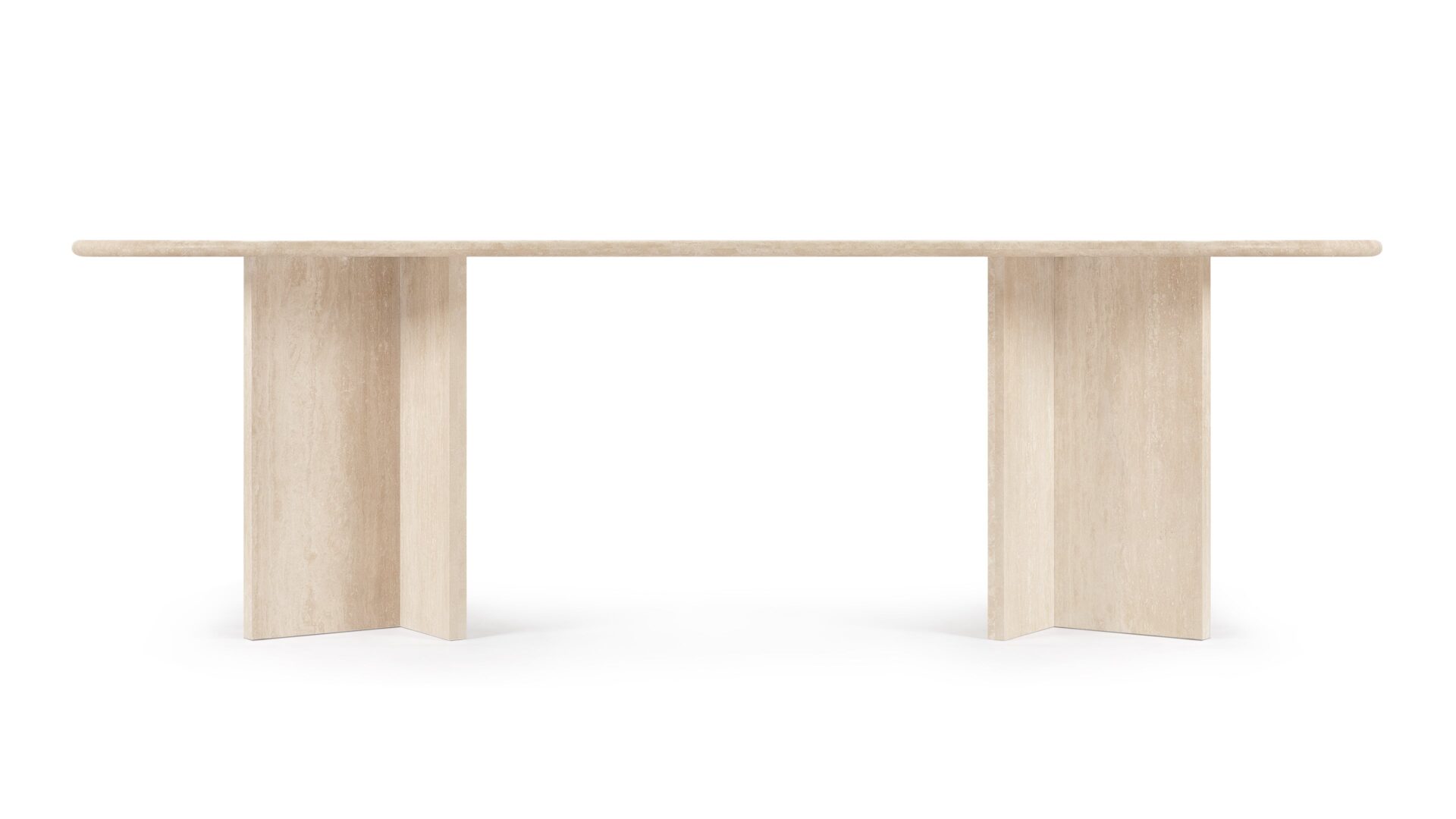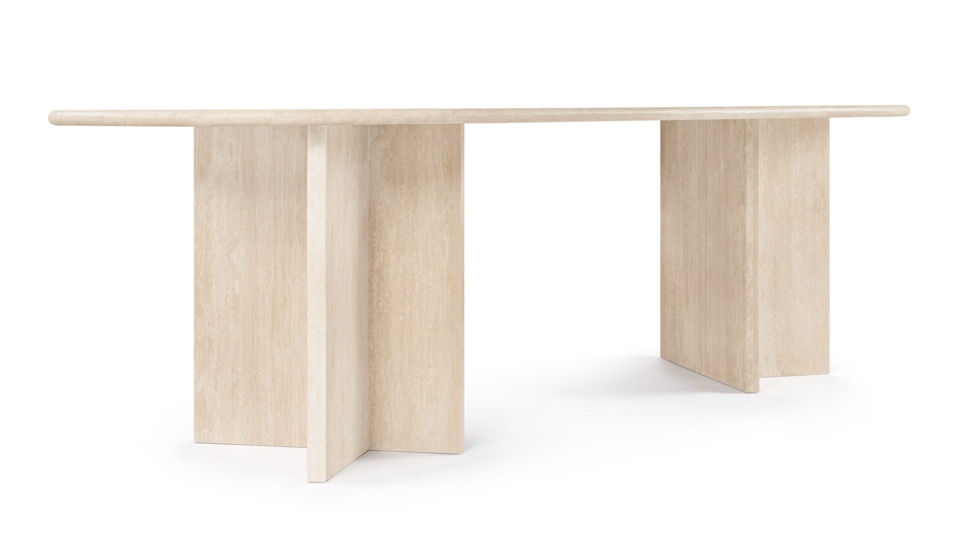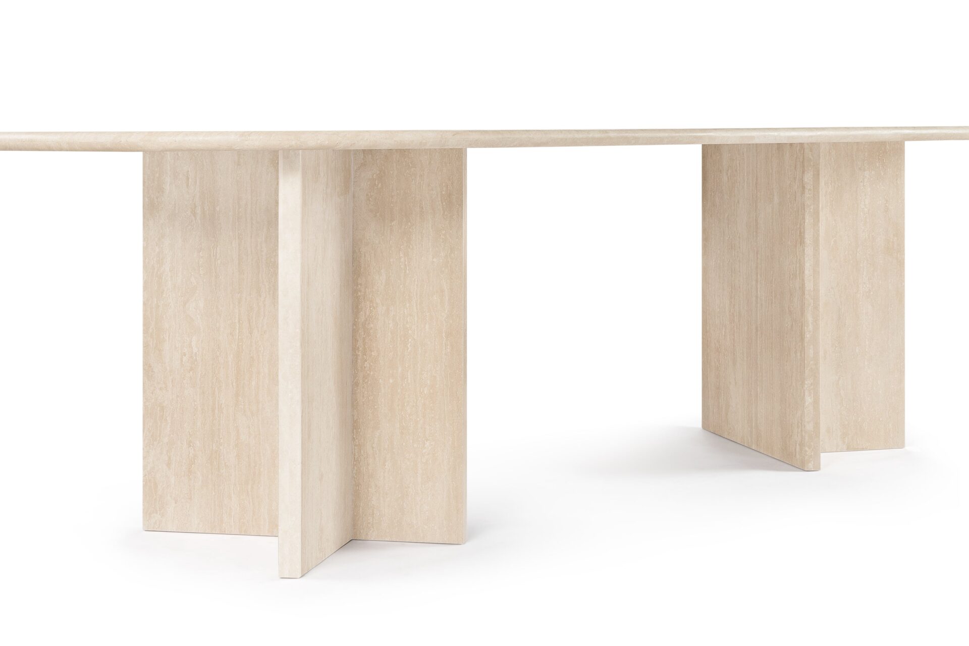 Discover the Maui Dining Table, an elegant centerpiece crafted with a rounded Travertine stone profile that comfortably seats up to 10 guests. Its fusion of smooth edges, angular legs, and intersecting leg framework showcases a contemporary aesthetic, blending durability with timeless sophistication. Available in warm, neutral tones, this table complements diverse decor themes, infusing your space with a harmonious blend of style and functionality.
