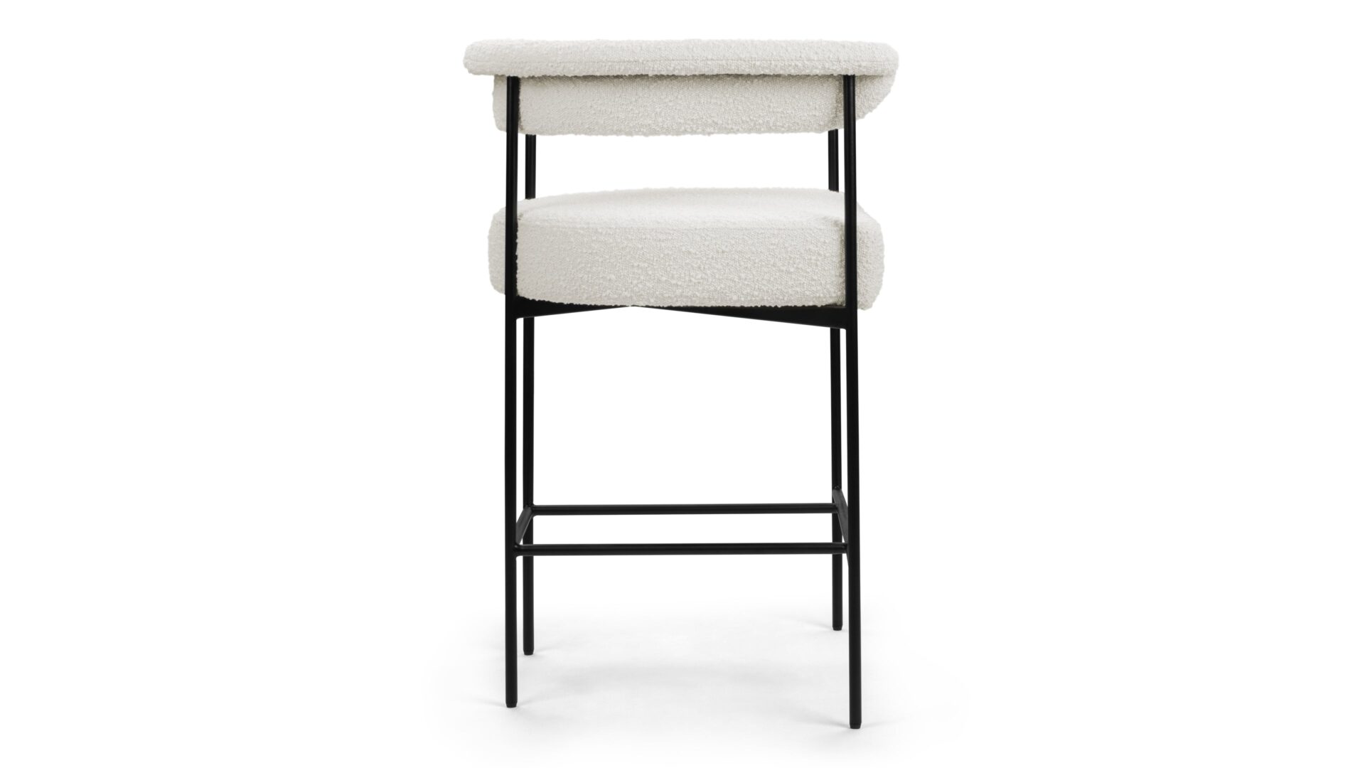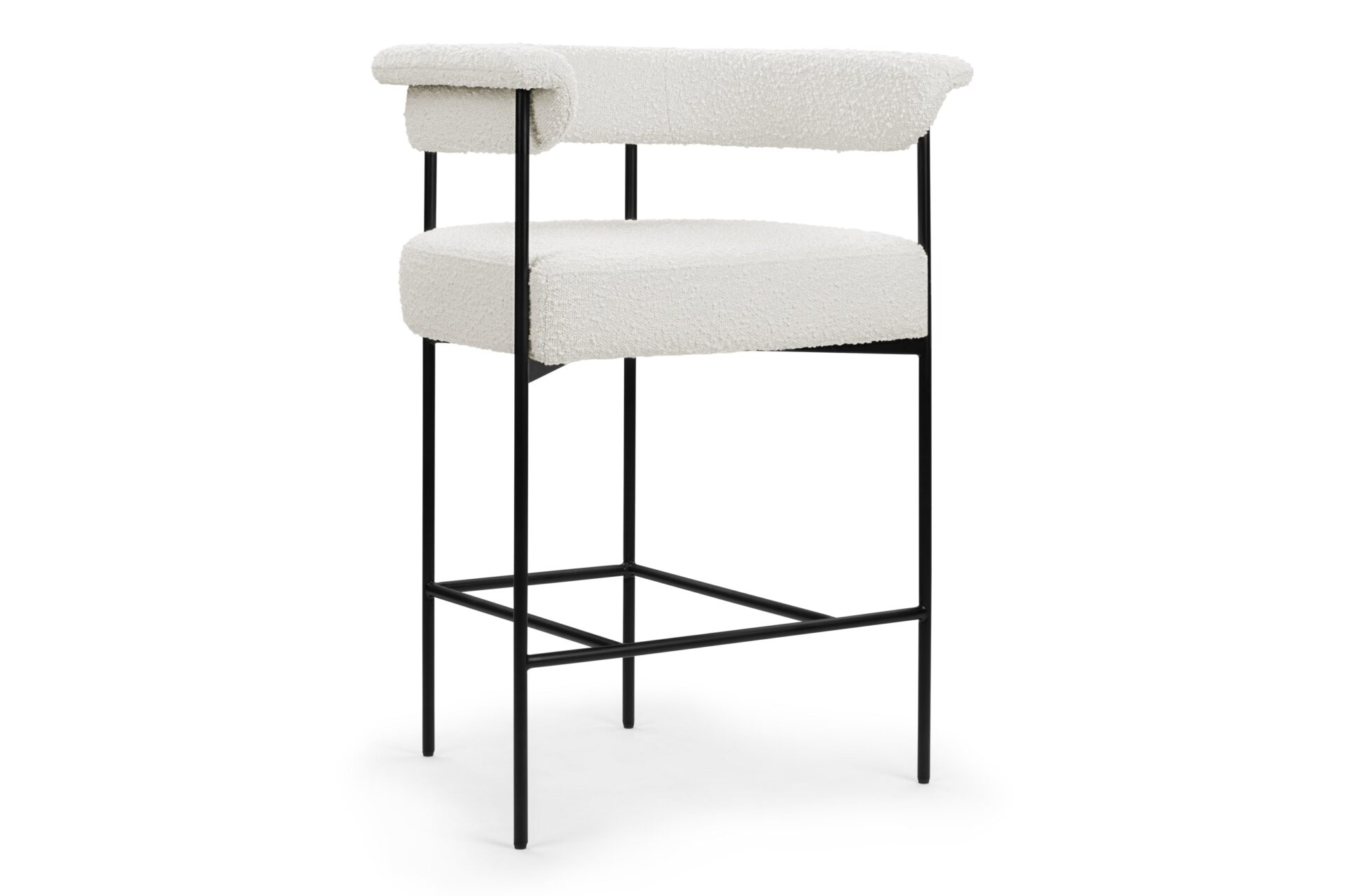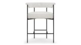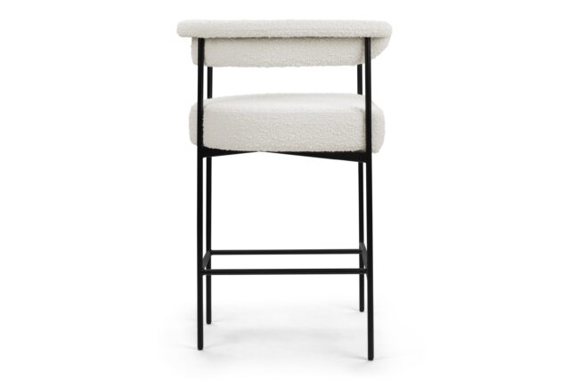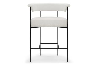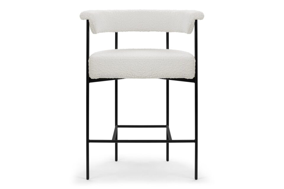 Experience the contemporary charm of the Mei Counter Stool featuring a stylishly curved backrest and slim metal frame. Upholstered in luxurious warm white boucle, this stool offers a plush texture that beautifully complements the matte black frame.