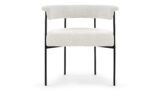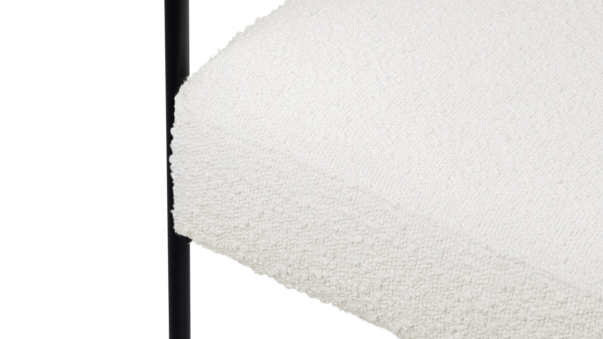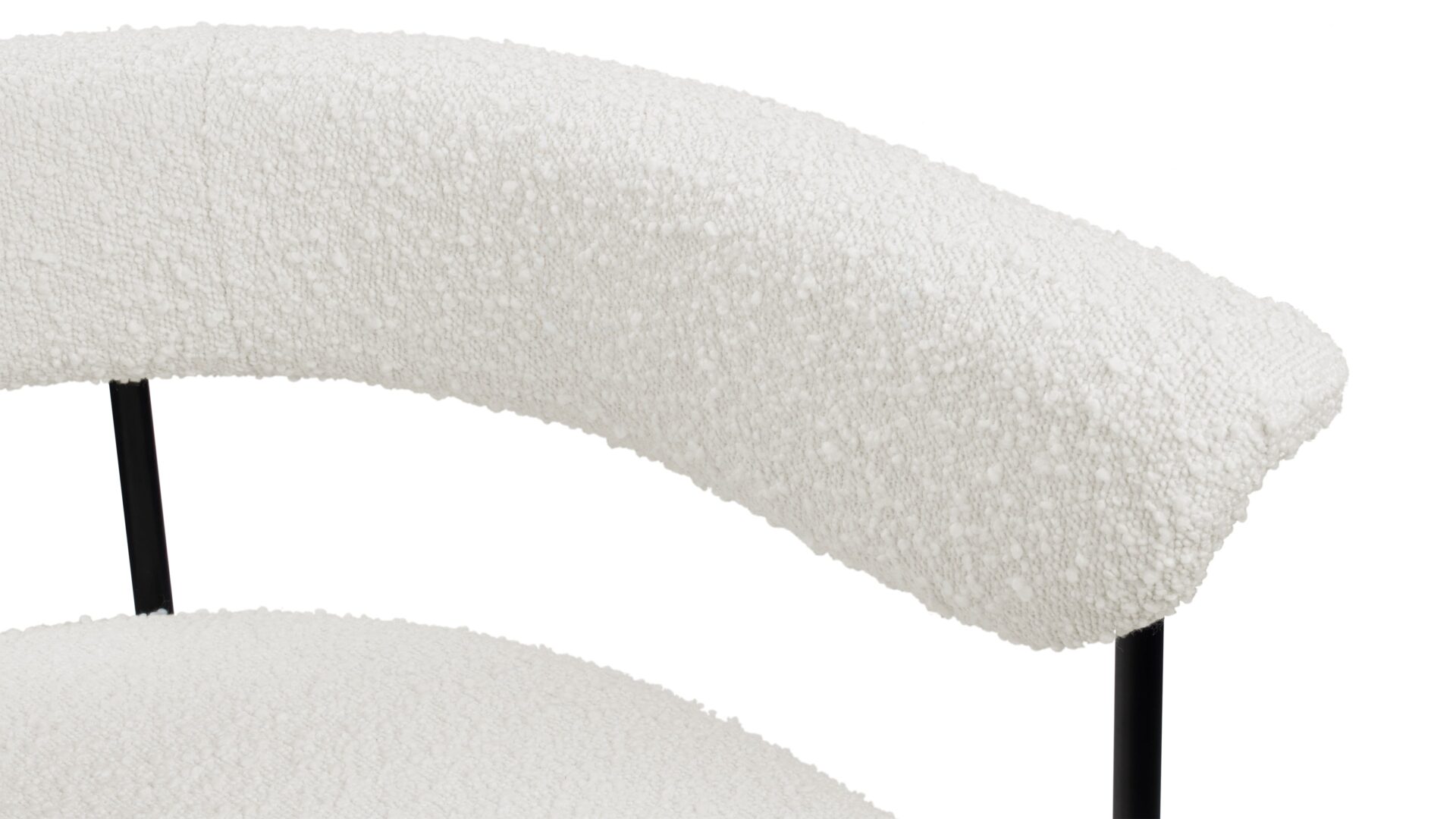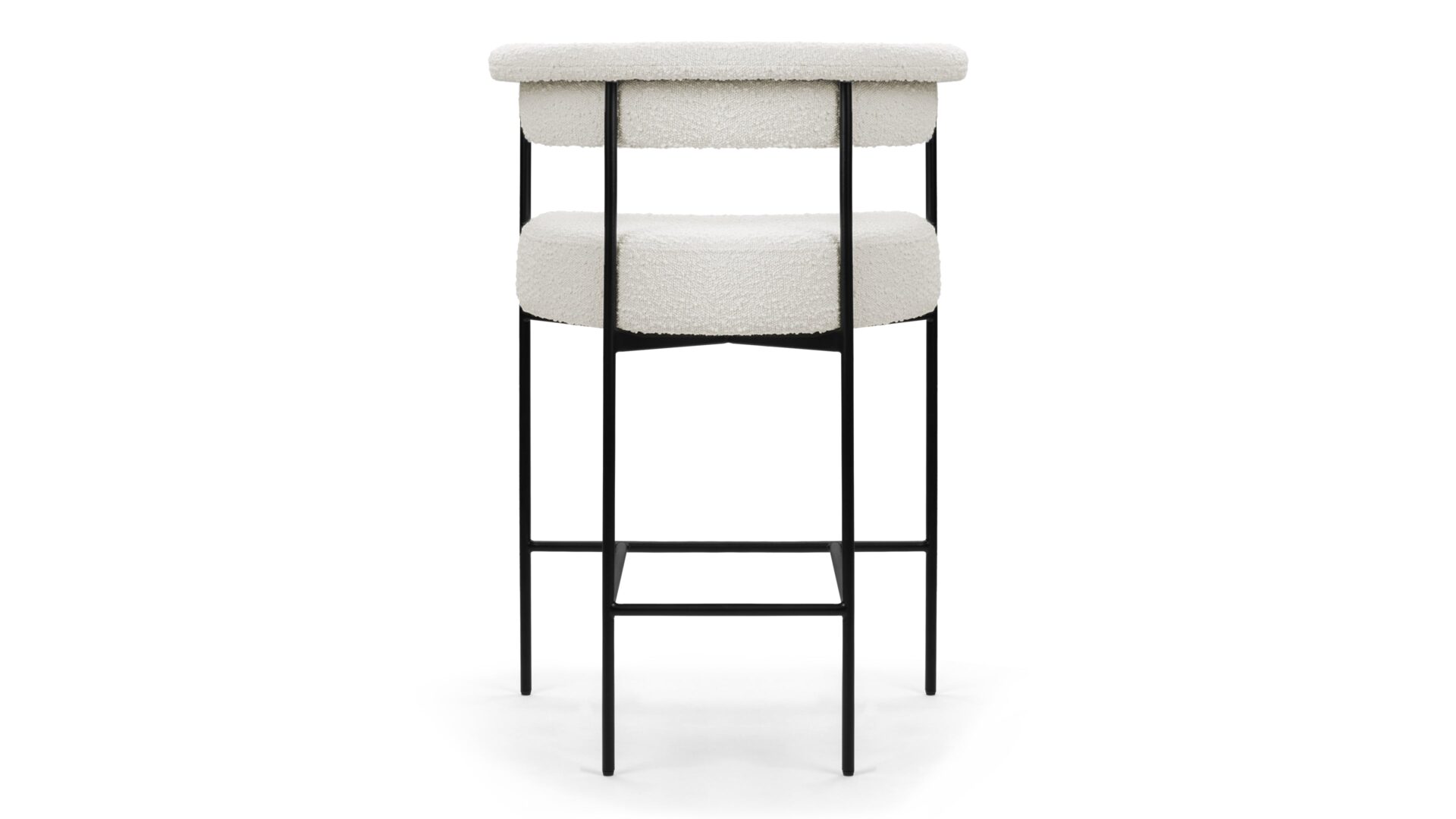 Experience the contemporary charm of the Mei Counter Stool featuring a stylishly curved backrest and slim metal frame. Upholstered in luxurious warm white boucle, this stool offers a plush texture that beautifully complements the matte black frame.