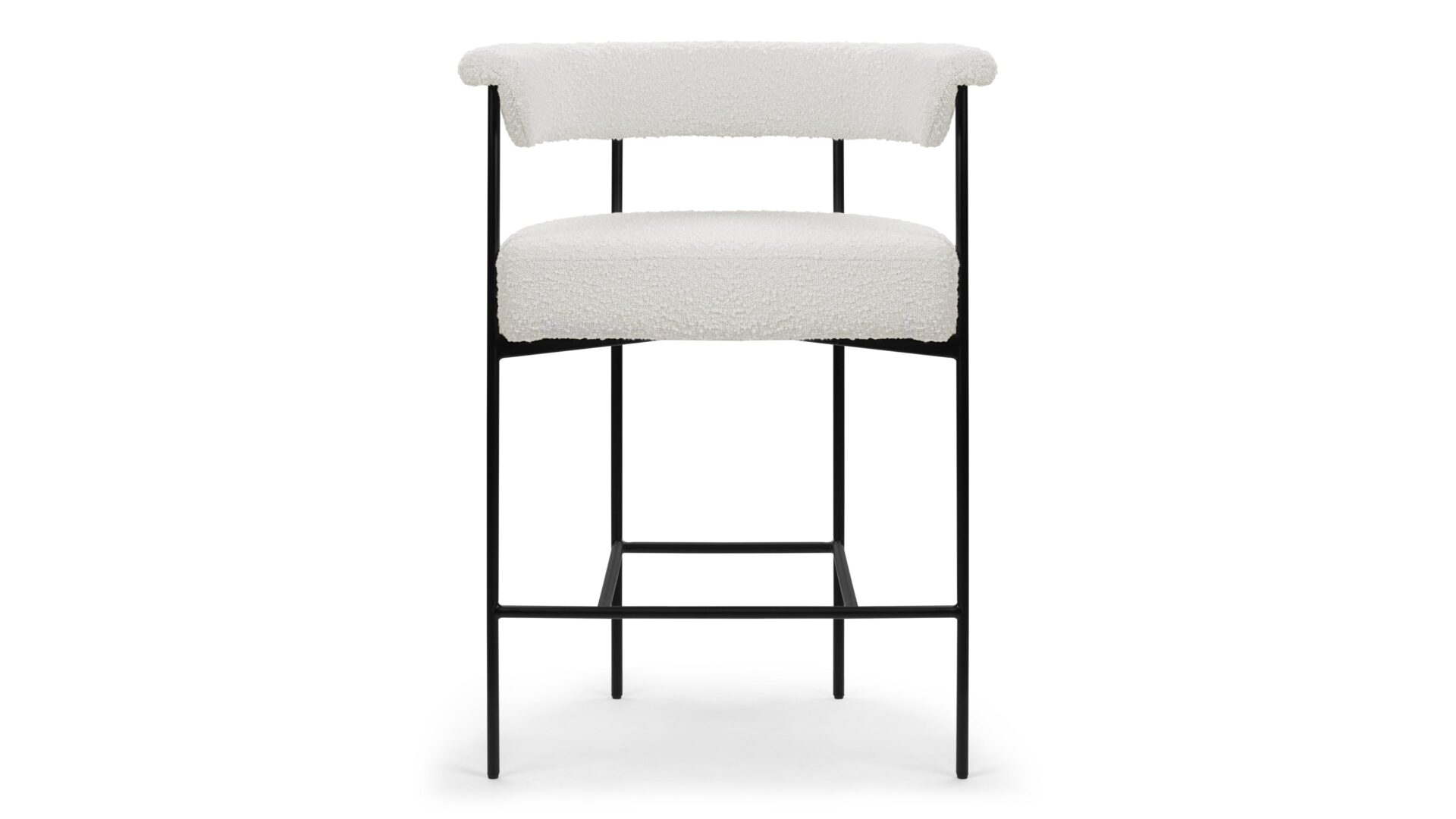 Enhance your seating area with the sophisticated appeal of the Crescent Counter Stool. It showcases plush upholstery in a cozy white boucle fabric, renowned for its distinctive looped texture that ensures a comfortable sitting experience. The sleek design is elevated by a slim metal frame in a sleek matte black finish, adding a touch of modern elegance to your space.