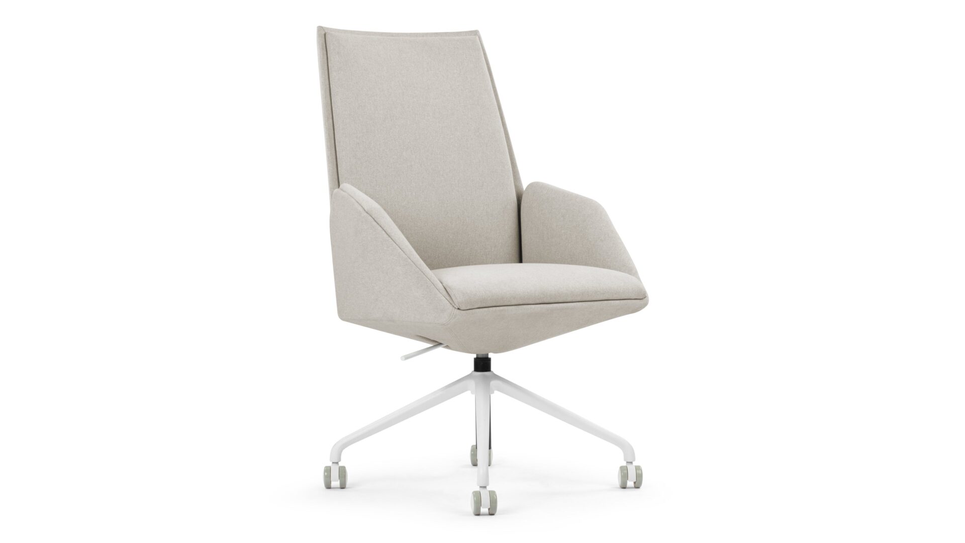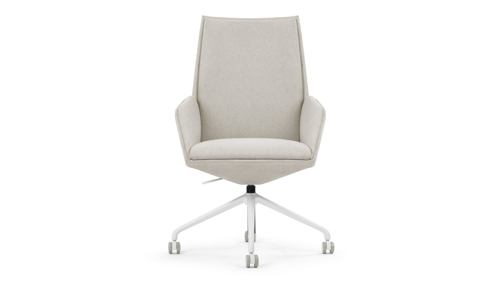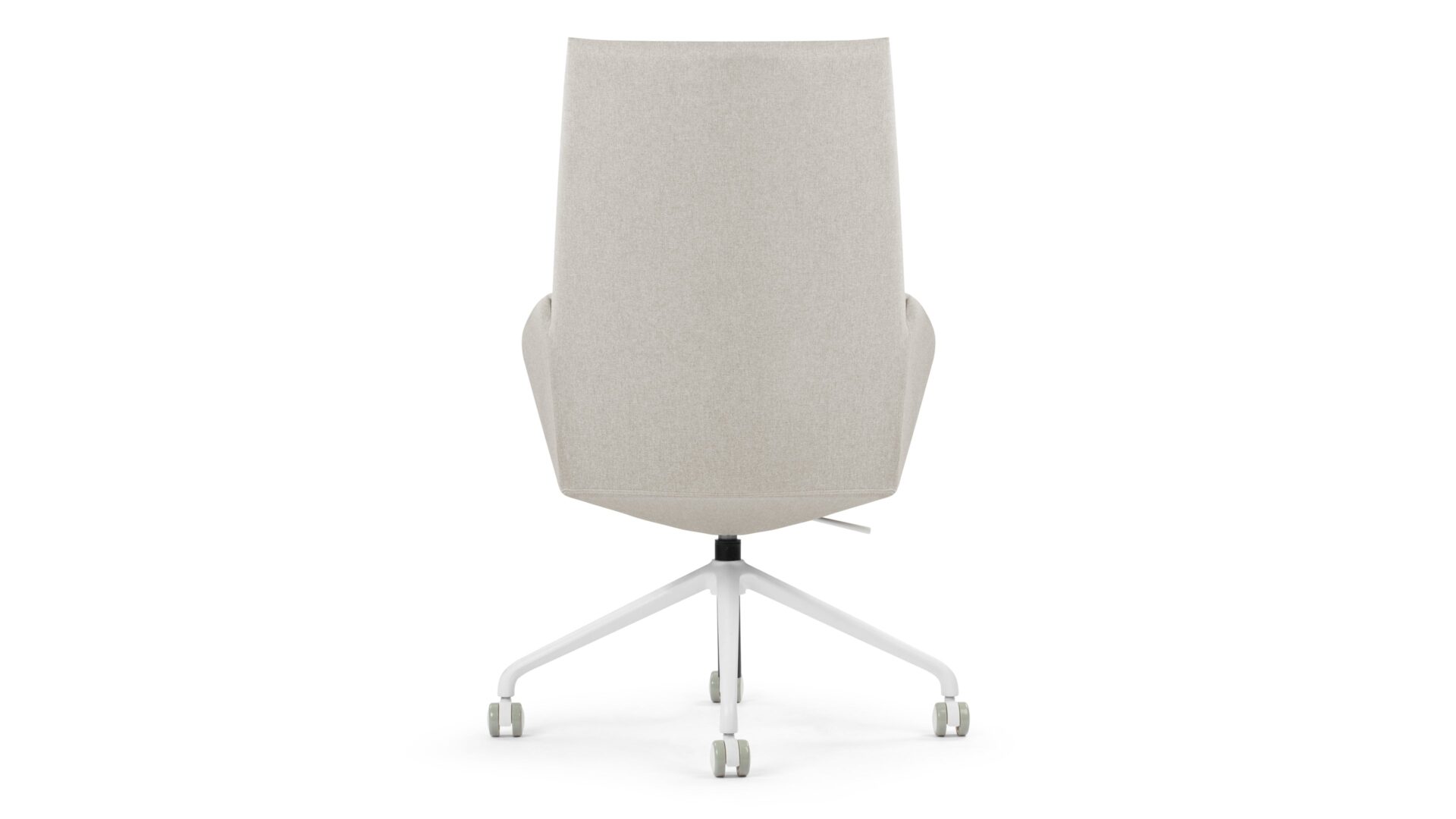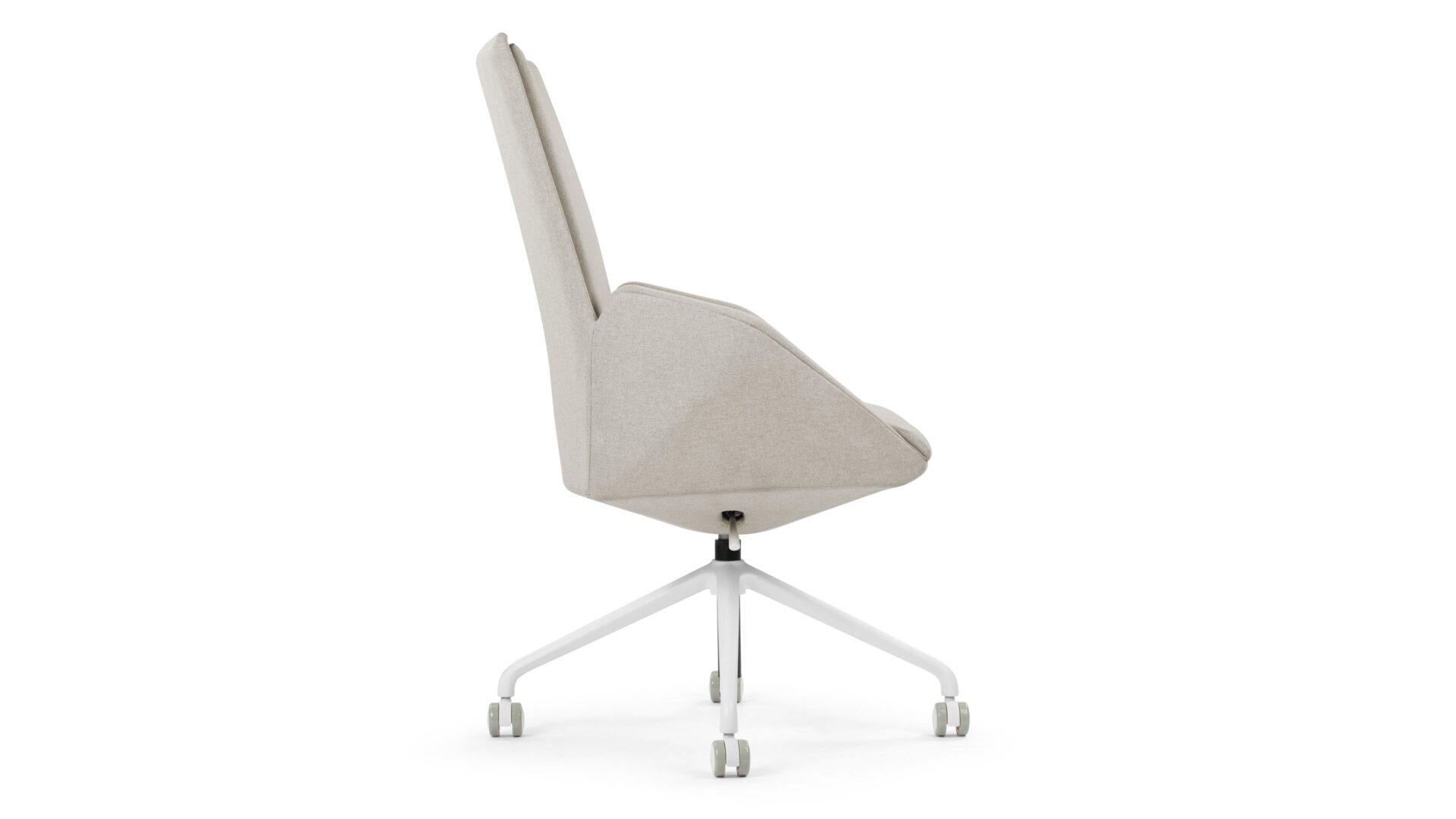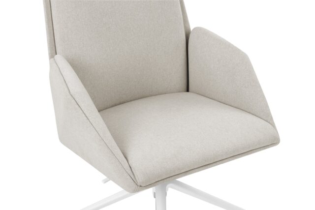 Introducing the Mies Desk Chair, a fusion of elegance and durability in a soft warm gray fabric. Its geometric design and sturdy white steel swivel base offer a modern touch for lasting comfort. With smooth gliding plastic casters, this chair effortlessly marries style with functionality, perfect for dynamic workspaces seeking a chic, minimalist upgrade.