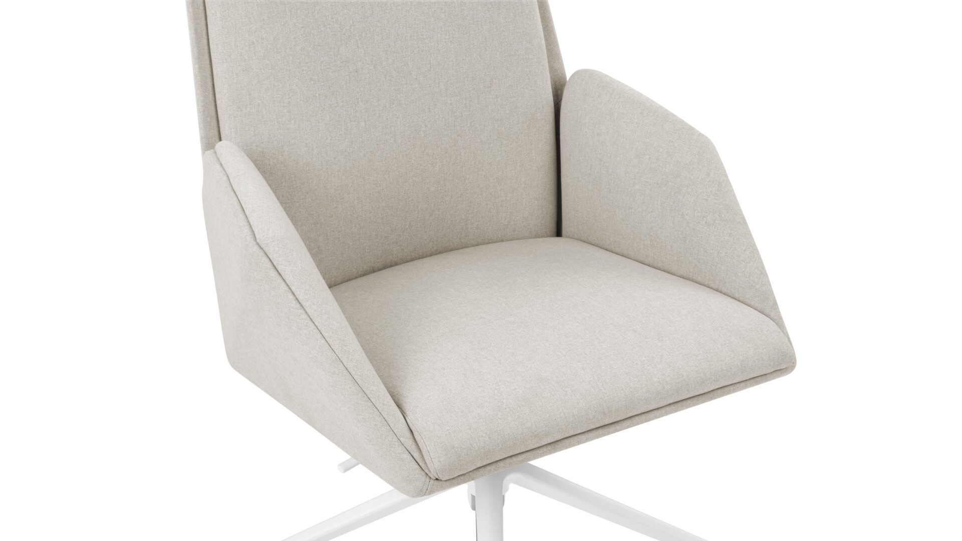 Discover the exquisite features of the Mies Desk Chair with its refined design showcasing a light hue of warm gray in a plush woven fabric. The chair's geometric outline adds a contemporary flair, while its robust swivel base, crafted from steel and finished in pristine white, ensures long-lasting durability. Complete with plastic caster feet, this chair effortlessly glides for seamless movement, making it a prime choice for dynamic work environments.