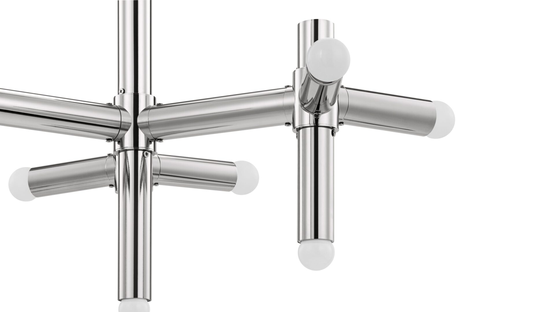 Introducing the Moda Chandelier showcasing a stunning fractal design, with its sturdy arms branching into three before further dividing into smaller trios. This repetition accentuates the fixture's technological aesthetics, while its geometric precision evokes fascination and appreciation. A sleek chrome finish adds the final touch to this meticulous design.