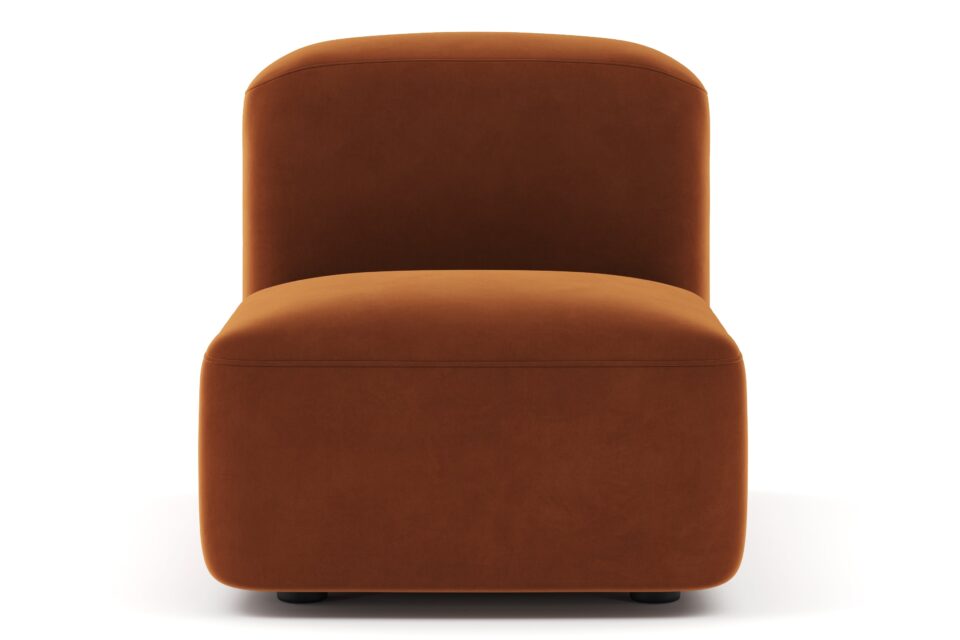 Sleek and eye-catching, the modules showcase plush velvet upholstery, sturdy arms, curved edges, and intricate stitching for both a tactile and visual allure. The burnt orange color infuses a hint of coziness and enduring elegance.