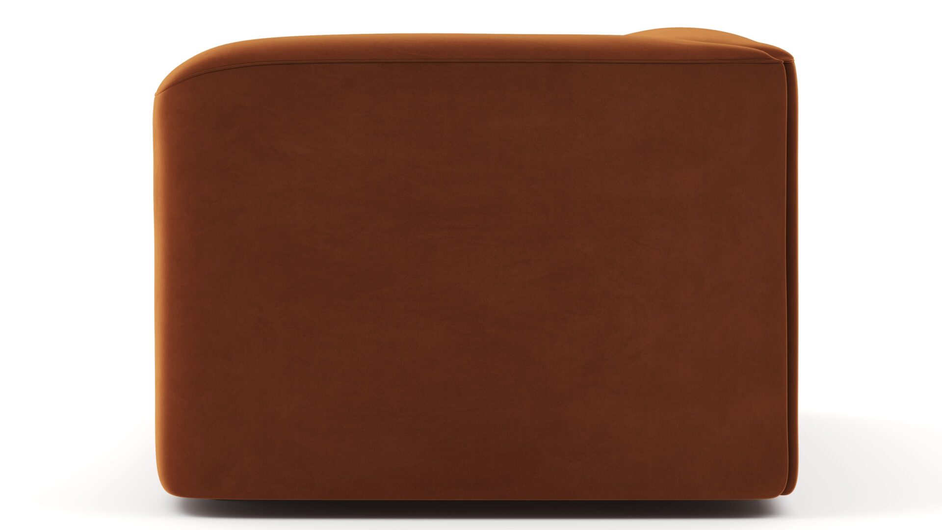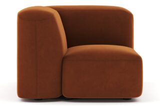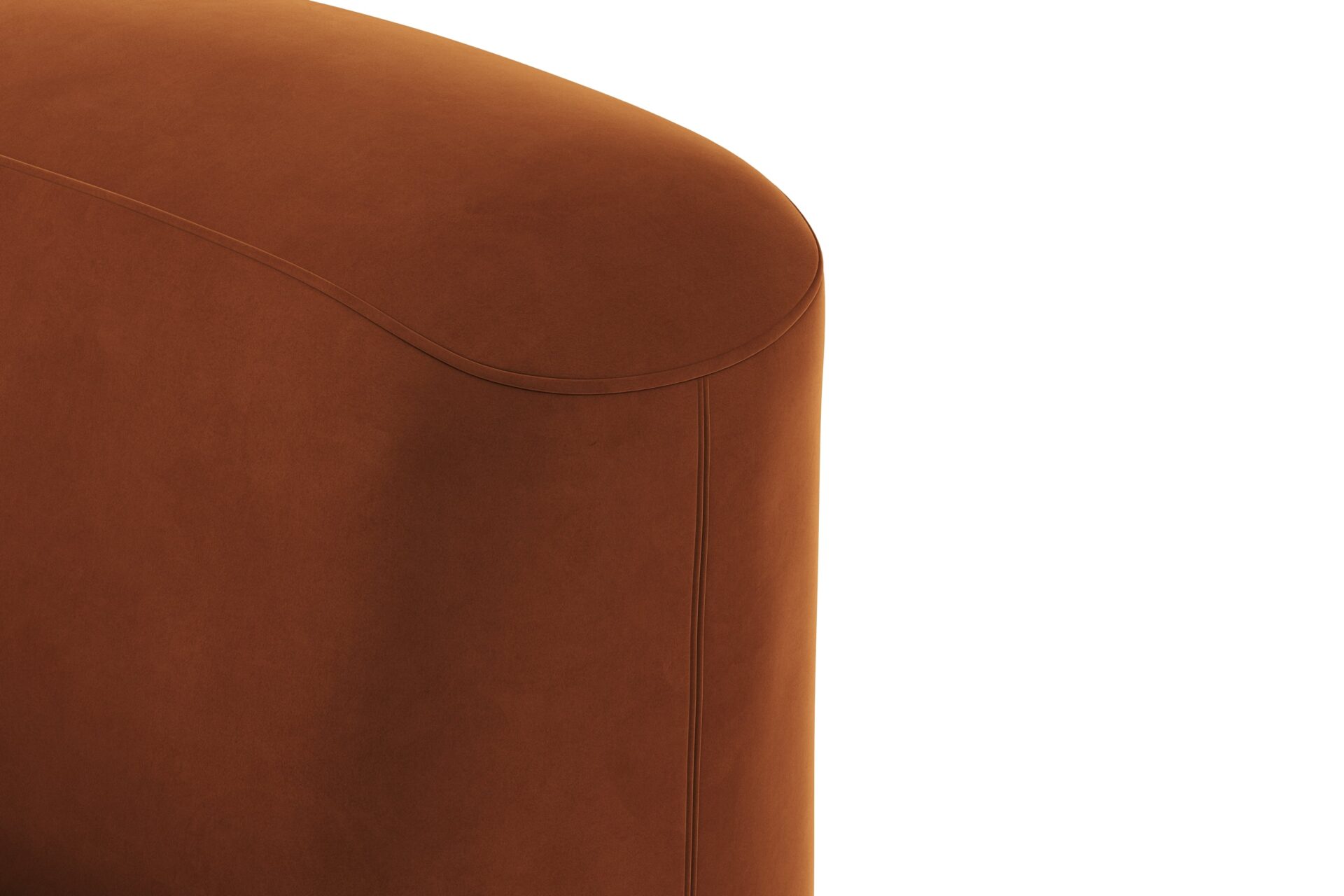 Sleek and eye-catching, the modules showcase plush velvet upholstery, sturdy arms, curved edges, and intricate stitching for both a tactile and visual allure. The burnt orange color infuses a hint of coziness and enduring elegance.