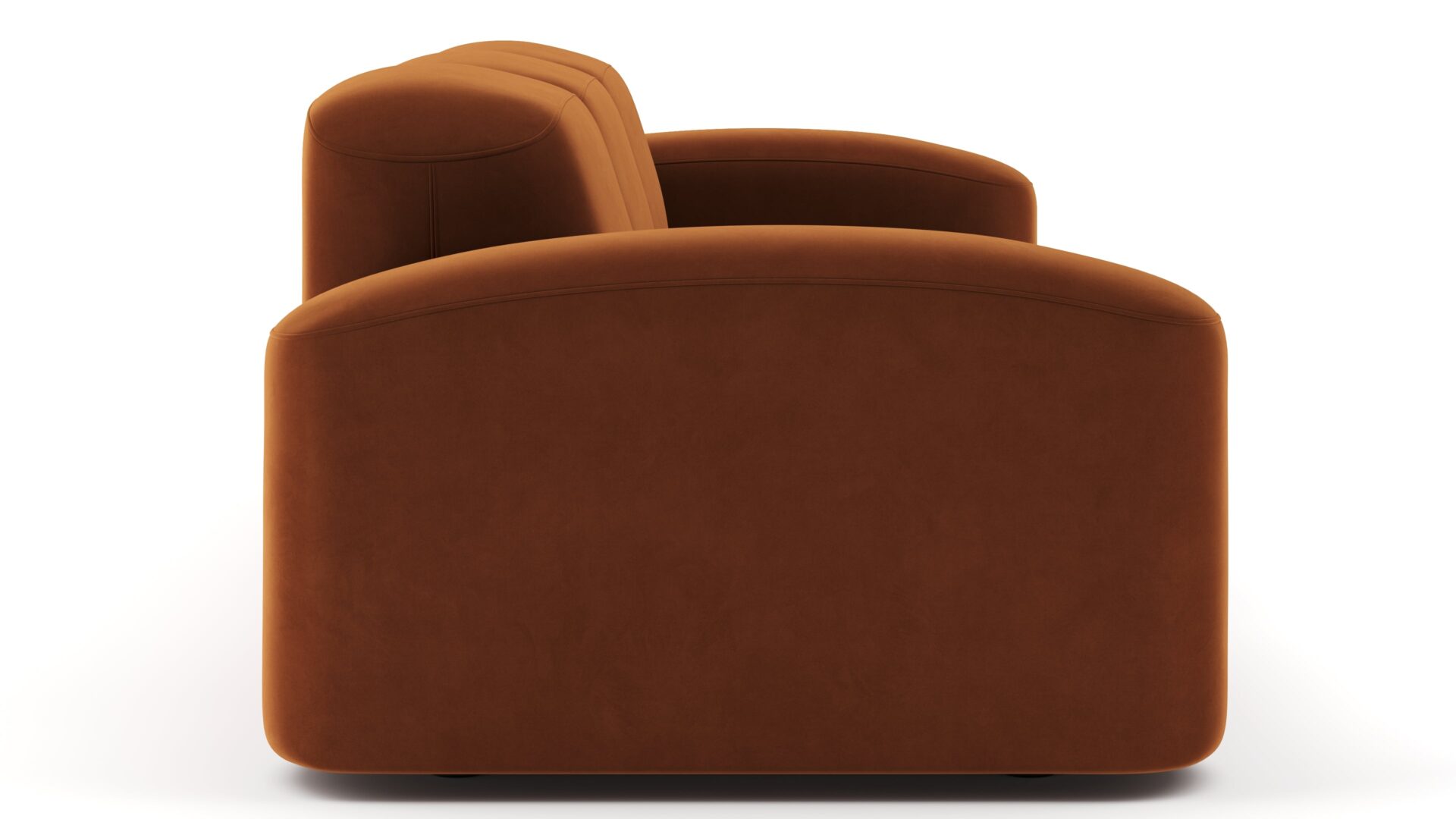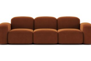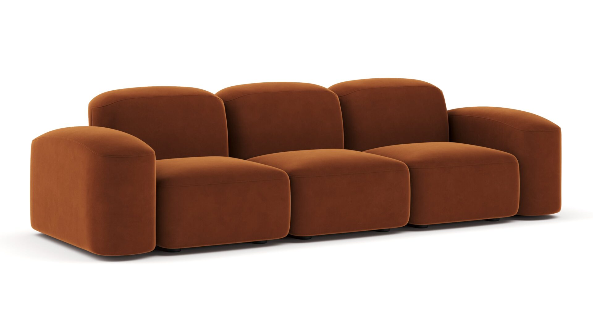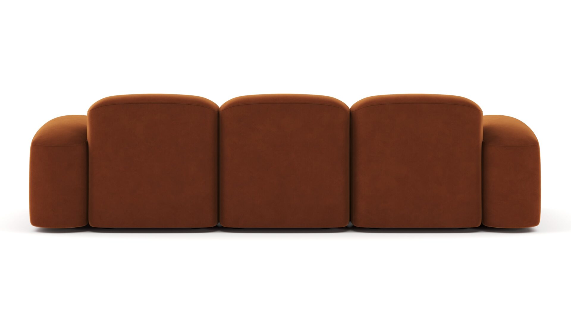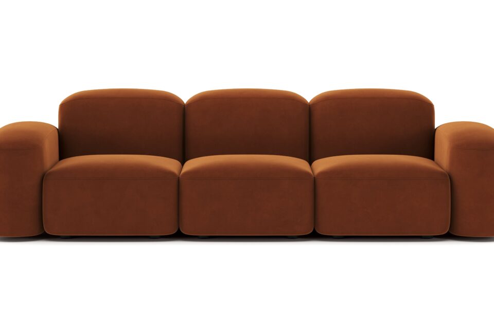 Sleek and eye-catching, the modules showcase plush velvet upholstery, sturdy arms, curved edges, and intricate stitching for both a tactile and visual allure. The burnt orange color infuses a hint of coziness and enduring elegance.
