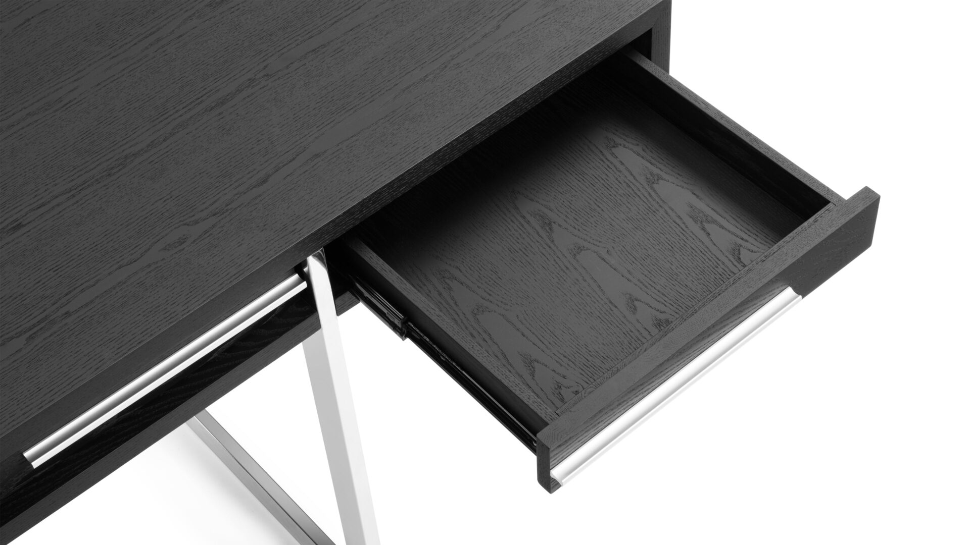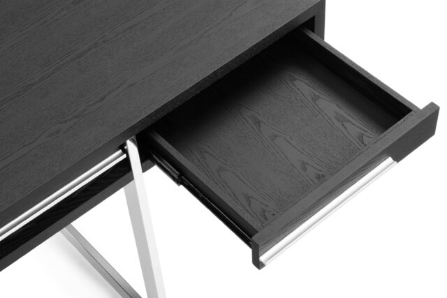 Enhance your workspace with the Naver Desk showcasing a stunning natural walnut veneer and sleek stainless steel legs seamlessly blended into its design. The airy and open base of this desk not only adds a modern touch but also contributes to its light and refreshing appeal.