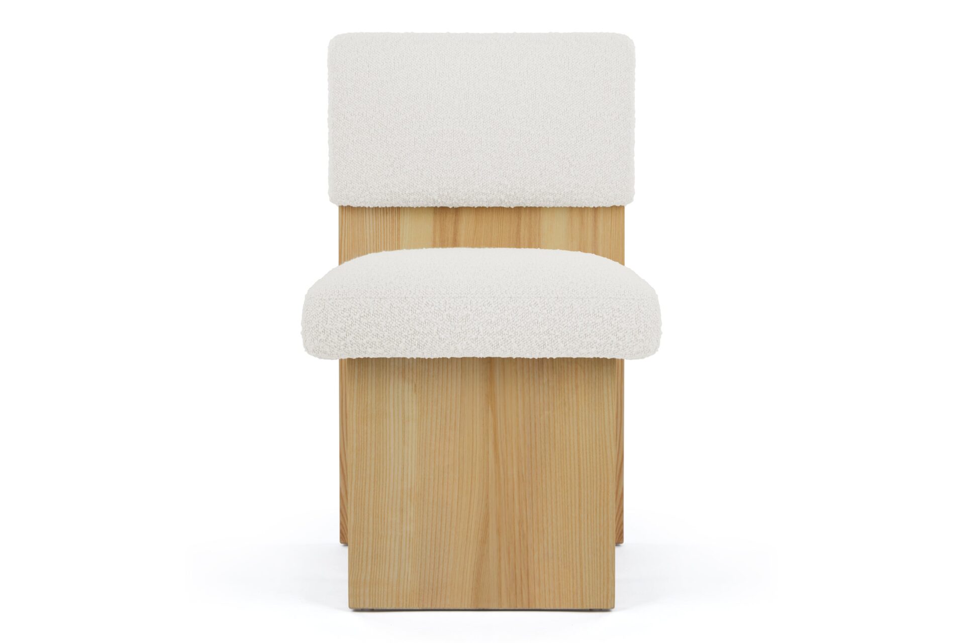 Discover the allure and comfort of the Nina Dining Chair, a superb addition to your dining ensemble. With its inviting warm white boucle upholstery, this chair delivers a soft and tactile seating experience. Enhanced with foam padding in the seat and backrest, it ensures lasting comfort during extended meals or gatherings. Crafted with a sturdy solid wood frame, its sophisticated design is accentuated by the elegantly folded backrest over the frame.