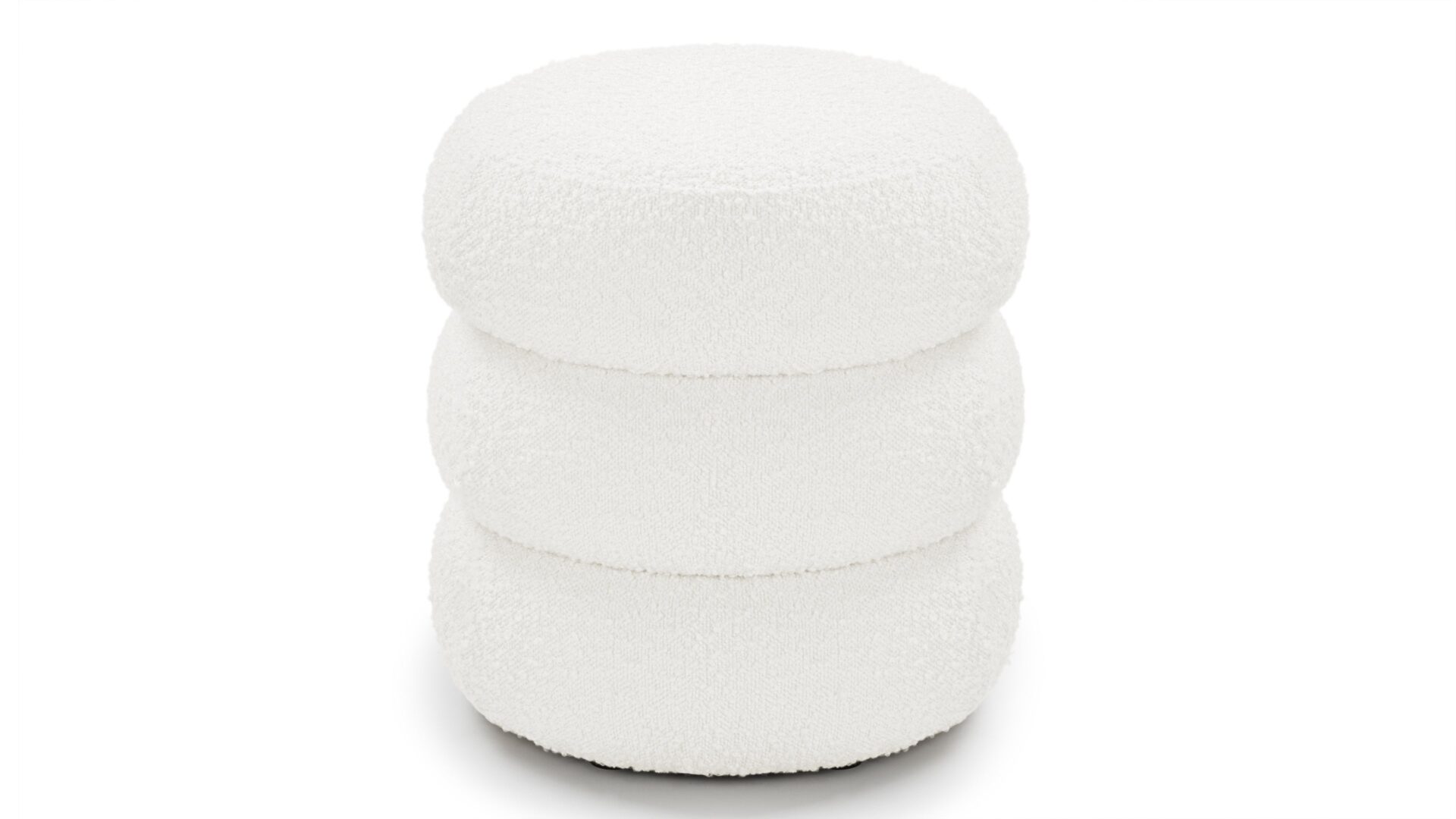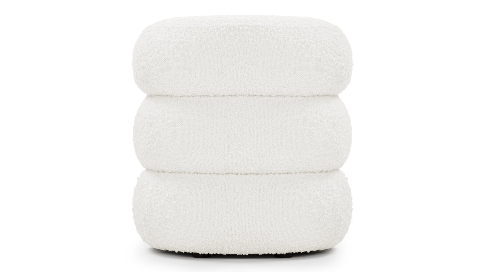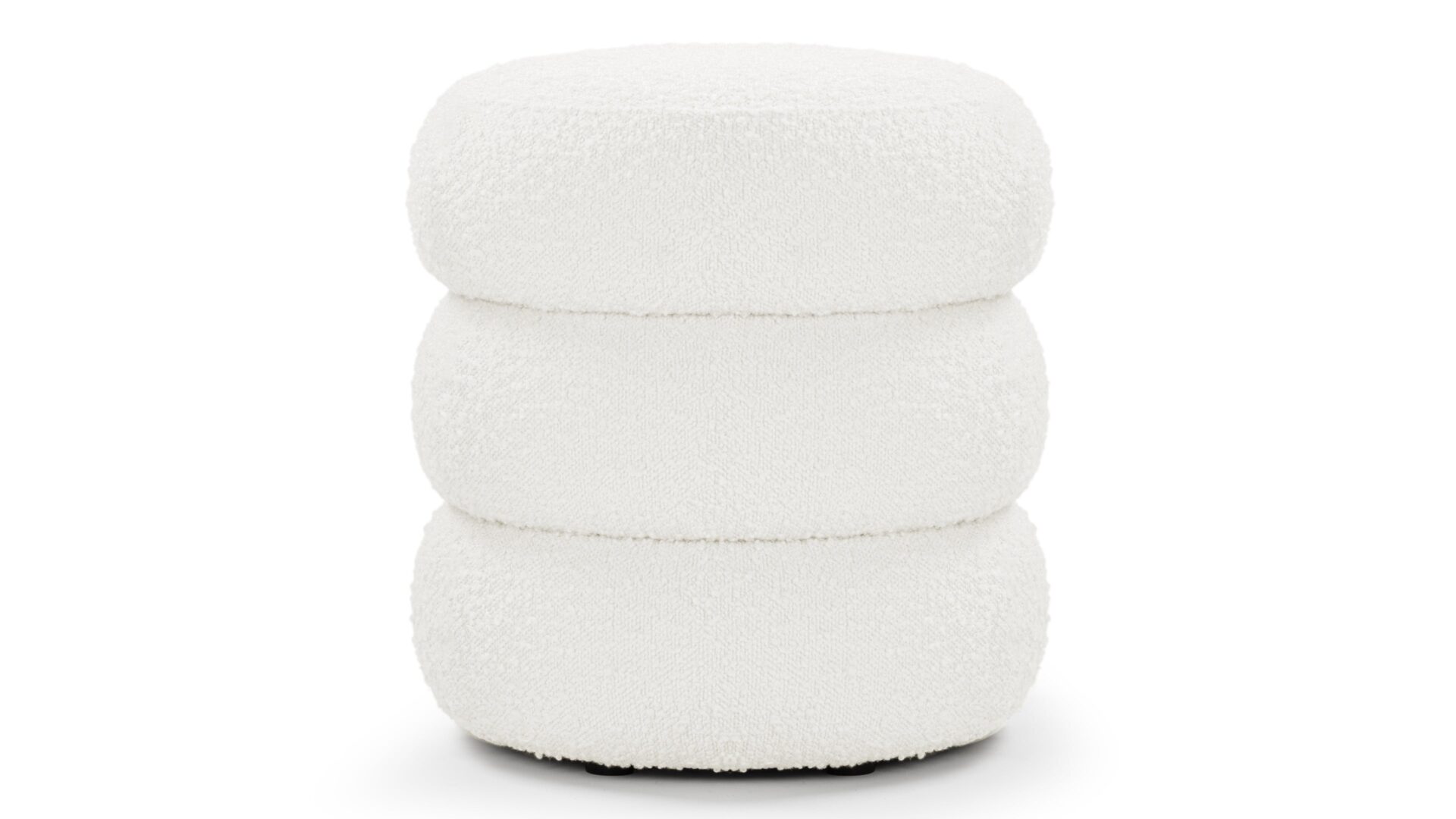 Introducing the Noa Ottoman, an elegant piece that combines comfort with style. Featuring soft boucle upholstery and looped tufts, this ottoman offers a cozy and inviting texture. Its sculptural round design, formed by stacked ring-like shapes, adds a whimsical touch to any space. Versatile and durable, it can serve as a statement piece or be paired for a cohesive look.
