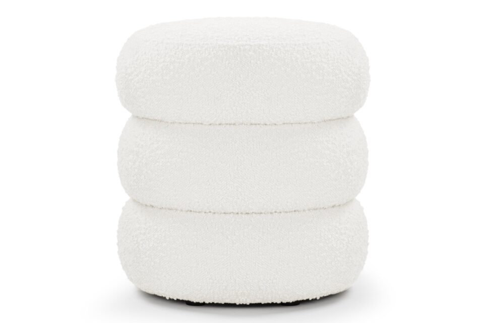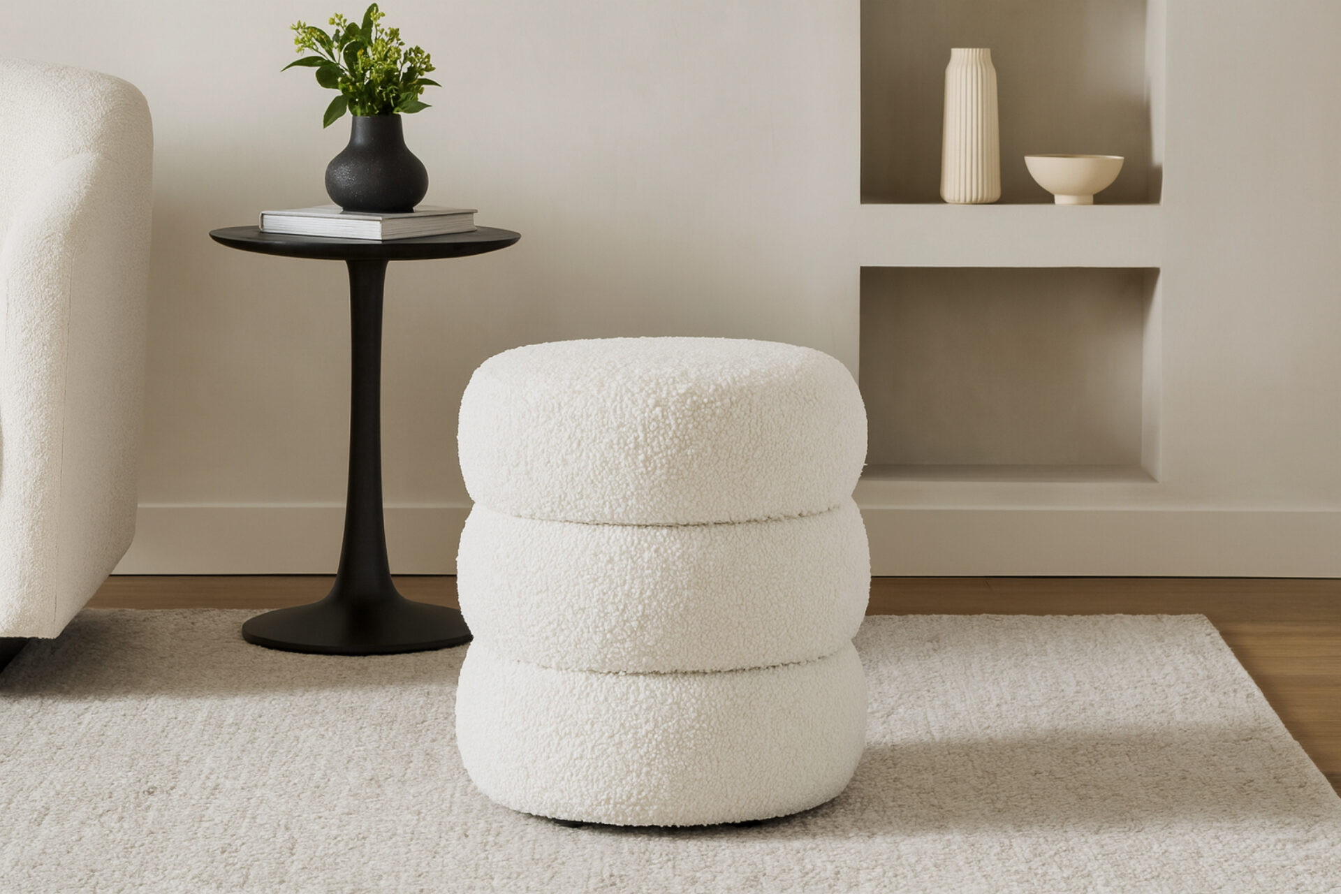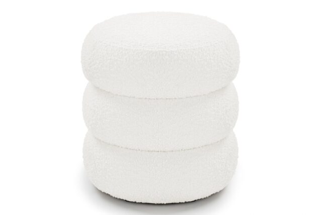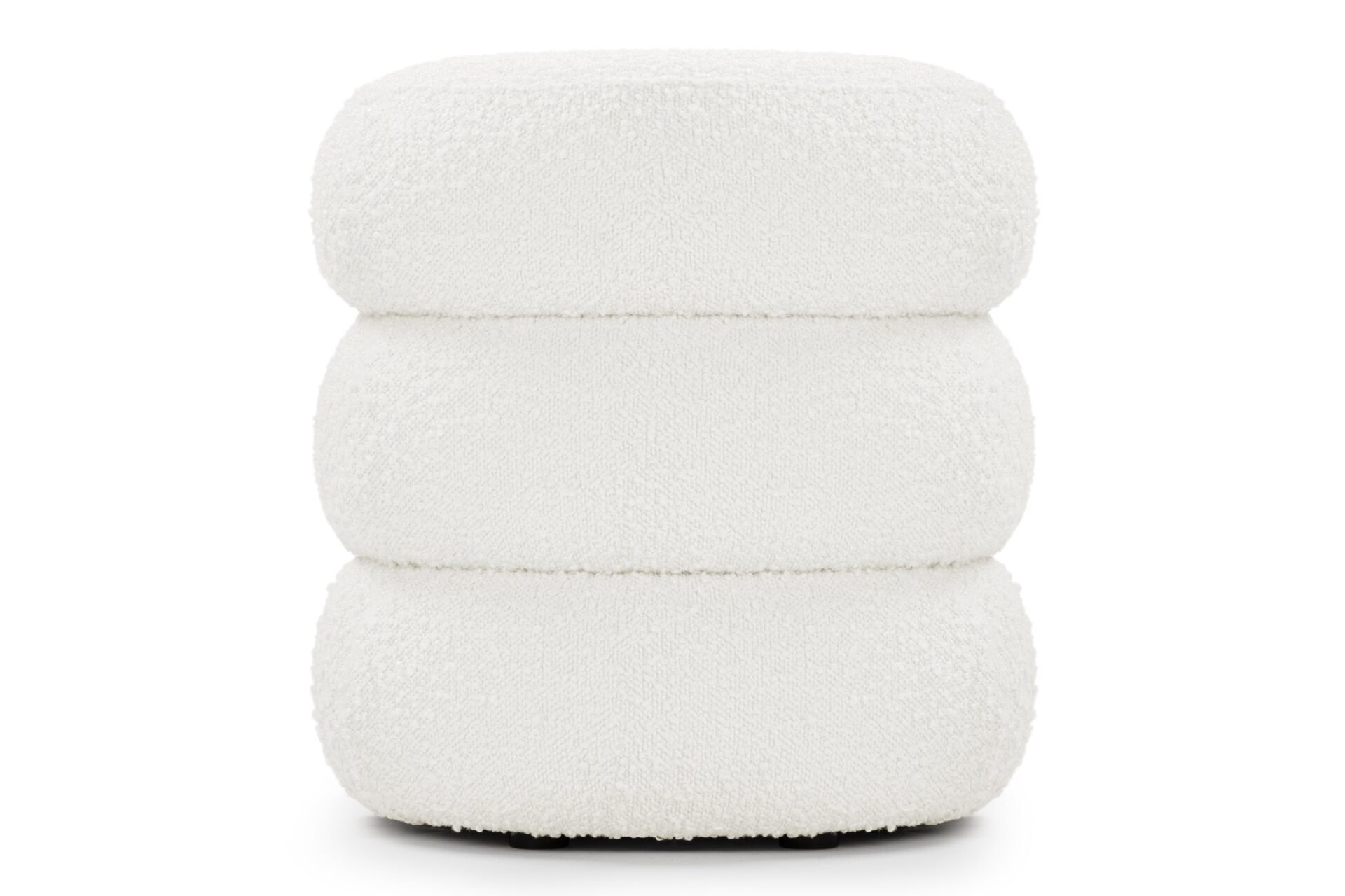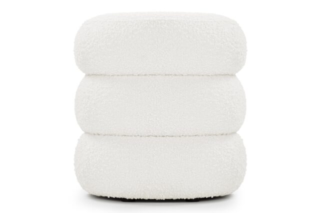 Introducing the Noa Ottoman, an elegant piece that combines comfort with style. Featuring soft boucle upholstery and looped tufts, this ottoman offers a cozy and inviting texture. Its sculptural round design, formed by stacked ring-like shapes, adds a whimsical touch to any space. Versatile and durable, it can serve as a statement piece or be paired for a cohesive look.