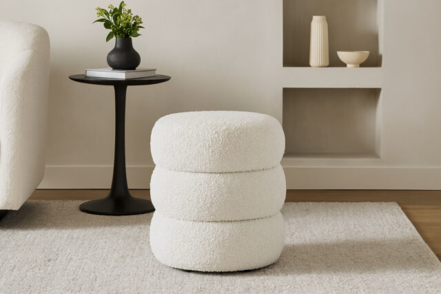 The Noa Ottoman is a visually captivating piece composed of round ring-like sections stacked atop each other. Its unique design becomes even more remarkable when combined with the other sizes offered.