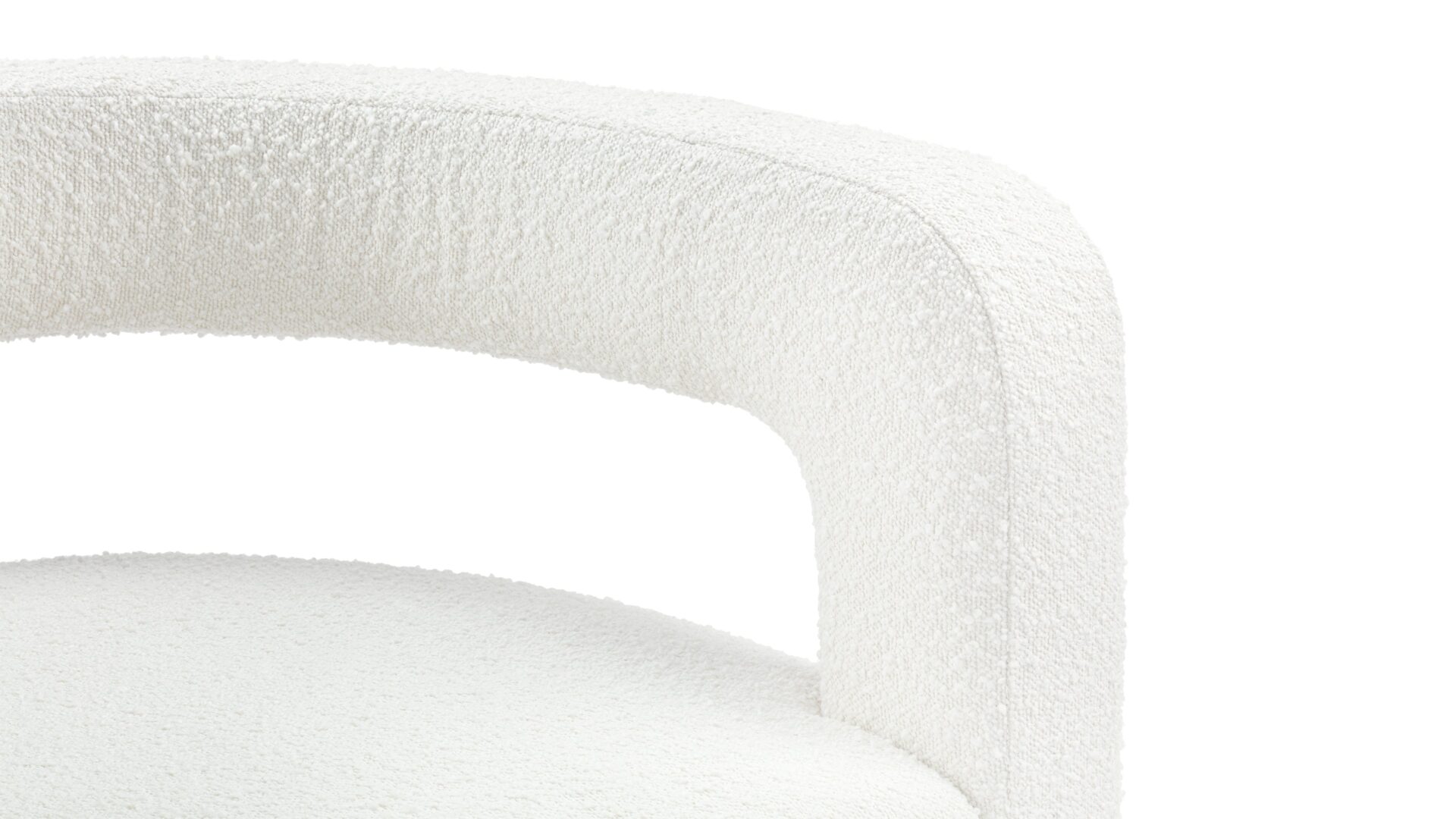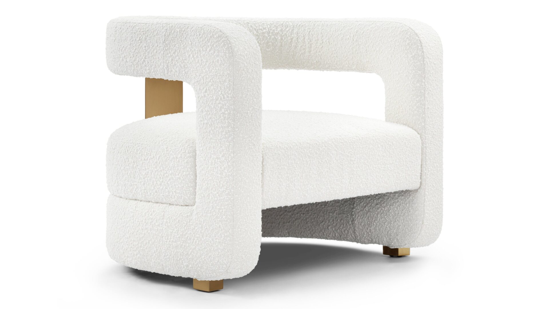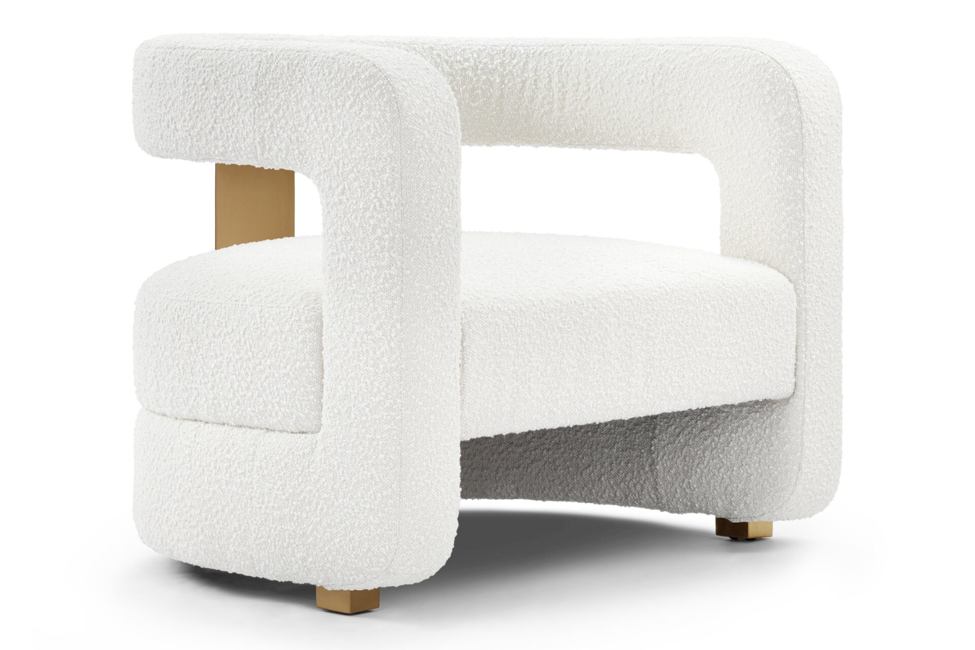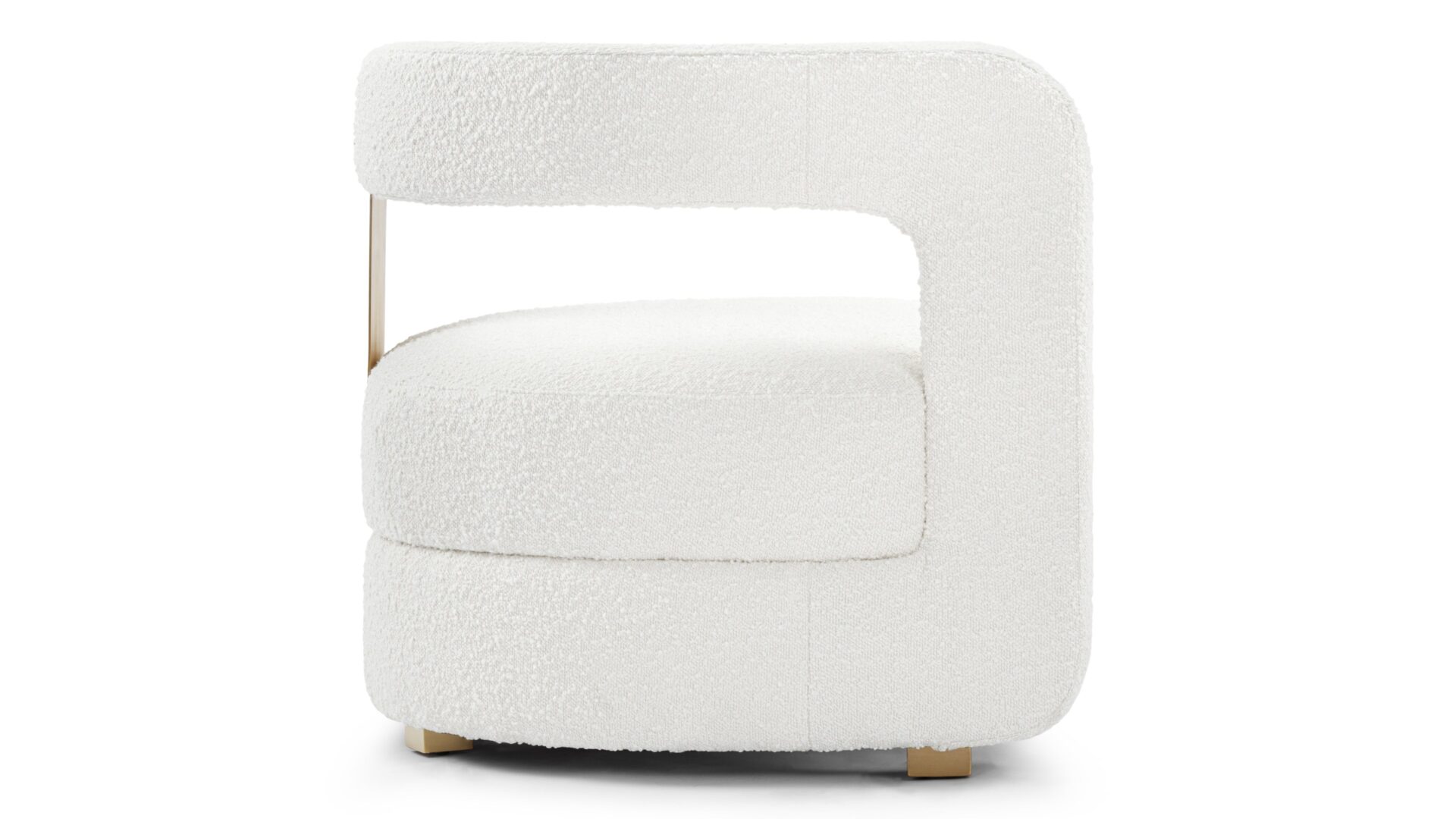 Step into sophistication with the Nola Lounge Chair, a fusion of sculptural finesse and sumptuous comfort. With an artful silhouette and luxurious Pearl Boucle texture, this chair is a definitive statement piece that captivates attention. Elevate your living space with the Nola Lounge Chair's elegant design and enduring charm showcasing brass accents, ideal for those seeking luxurious comfort and timeless style.