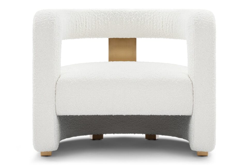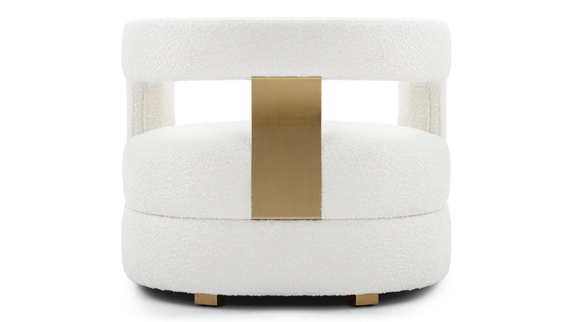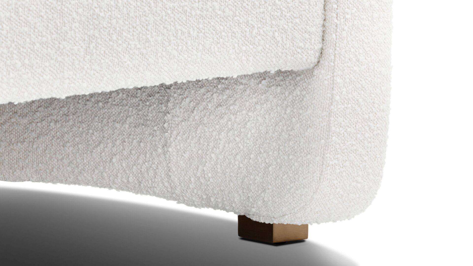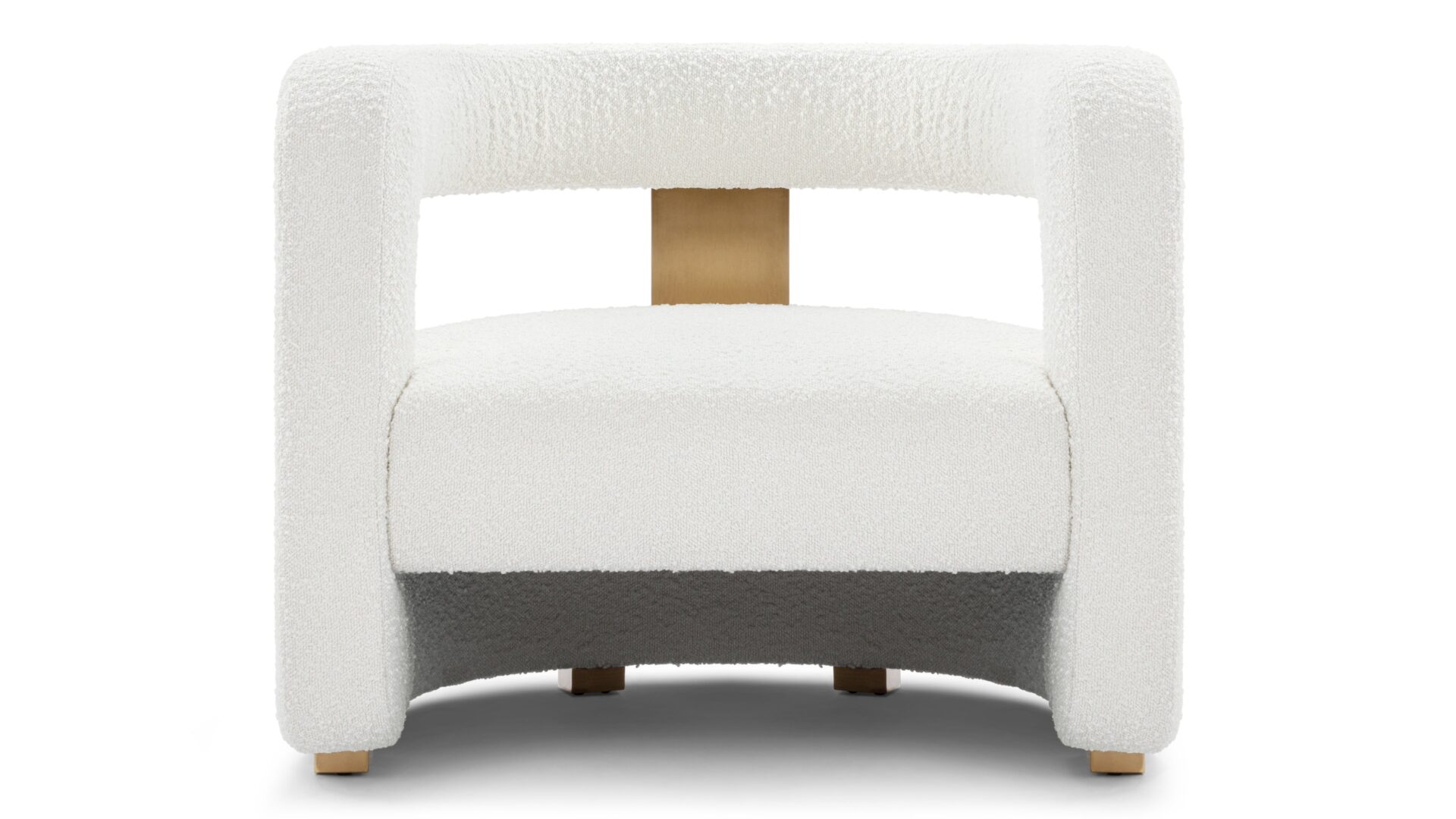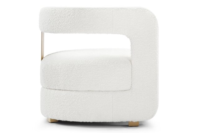 Step into sophistication with the Nola Lounge Chair, a fusion of sculptural finesse and sumptuous comfort. With an artful silhouette and luxurious Pearl Boucle texture, this chair is a definitive statement piece that captivates attention. Elevate your living space with the Nola Lounge Chair's elegant design and enduring charm showcasing brass accents, ideal for those seeking luxurious comfort and timeless style.
