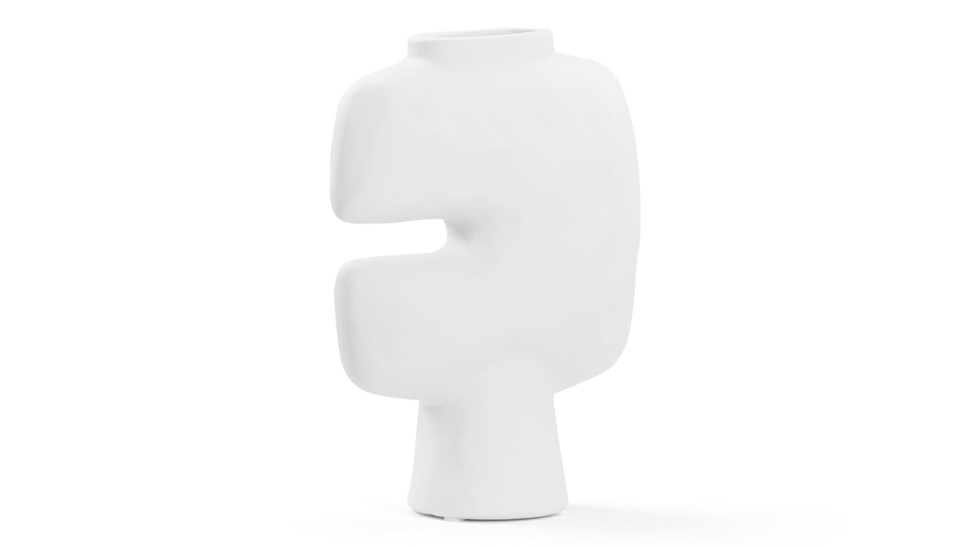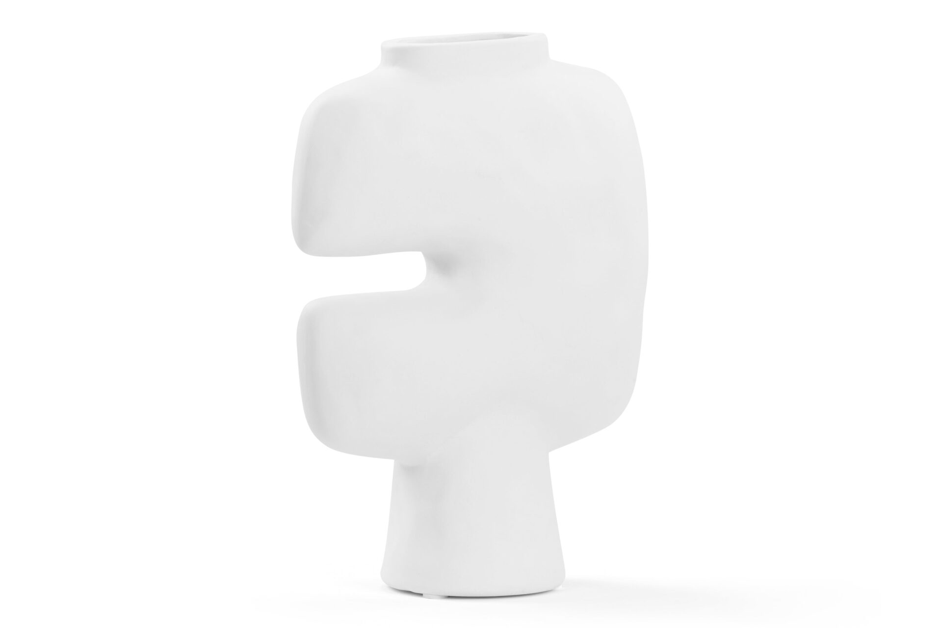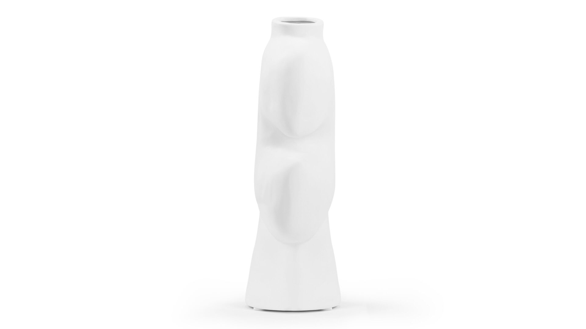 The Nyle Vase is a ceramic piece that showcases a quirky and whimsical design with a soft, organic silhouette. Its playful nature and almost human-like shape harken back to 1960s design aesthetics, while the minimal color palette gives it a distinct Scandinavian vibe. The Nyle Vase makes a striking statement on its own but can also be personalized with dried flowers and other decorative embellishments. For a captivating showcase, pair the smaller Nyle Vase with our range of ceramic vases available in various sizes. This creates a dynamic and visually engaging display, elevating the overall coherence of any setting.