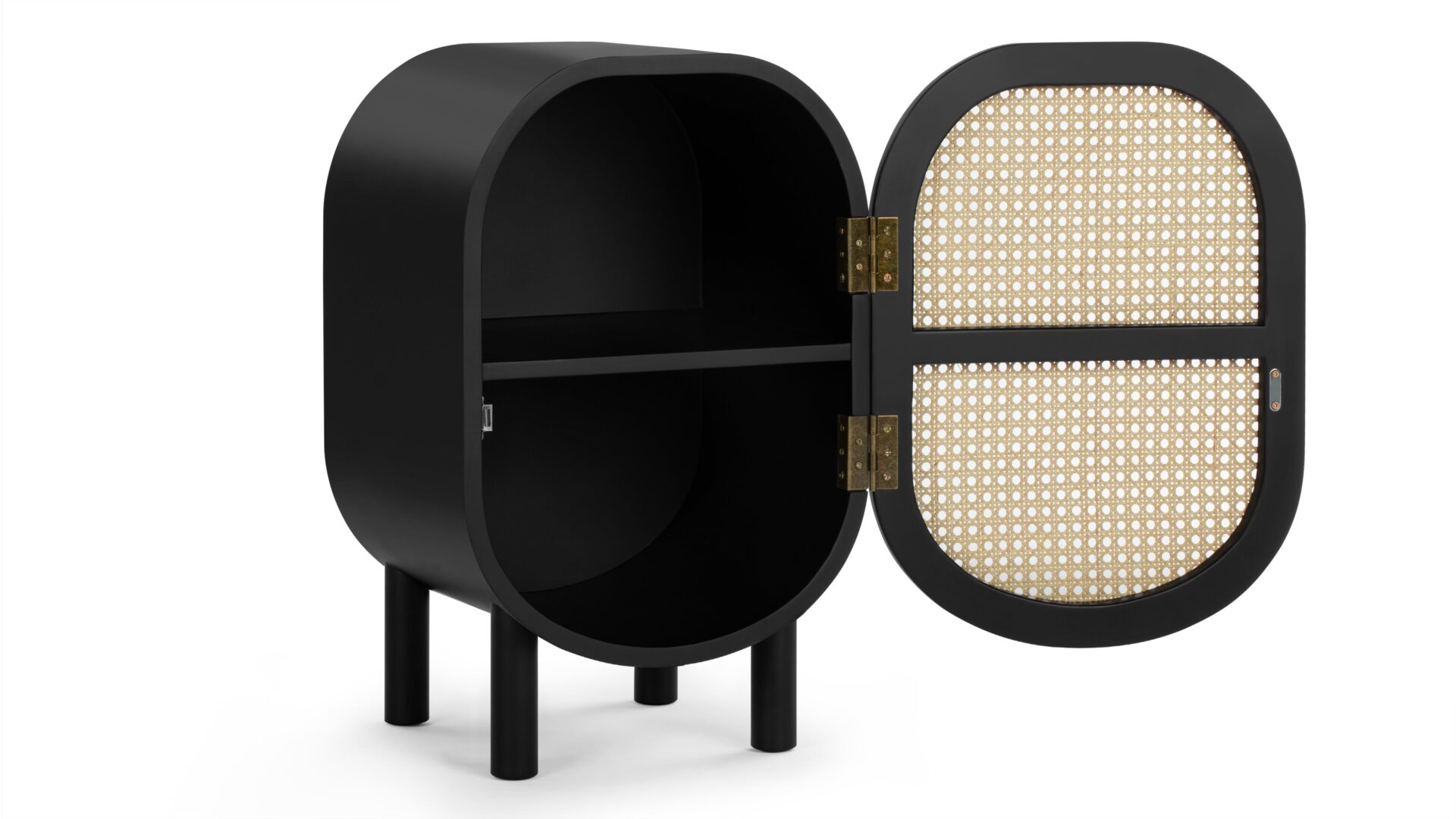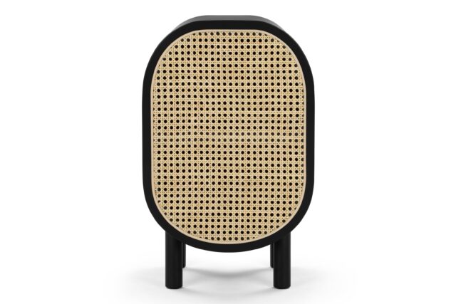 Discover the Oma Side Table showcasing a modern design that effortlessly combines natural elements like rattan with a sleek matte black ash frame. The warm wood tones harmoniously complement the dark frame and brass accents within. The table's incorporation of natural rattan evokes memories of post-war French aesthetics, harmonized with a contemporary rounded silhouette.