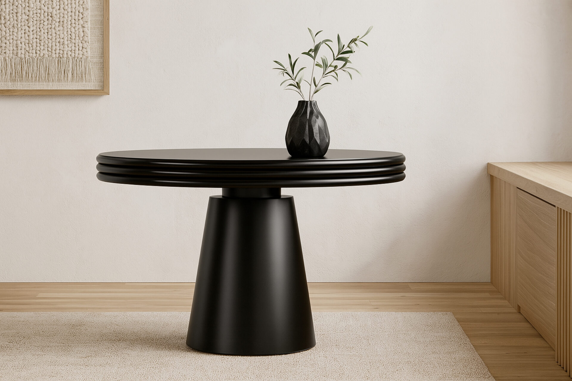 Meet the Pascal Round Dining Table - a captivating blend of elegance and innovation in furniture design. Impeccably crafted in black, this table seamlessly merges style and utility, elevating any space. Part of the Pascal Collection, it complements other pieces effortlessly for a harmonious aesthetic. The versatile design ensures it fits various decor styles, making it a standout addition to your home.