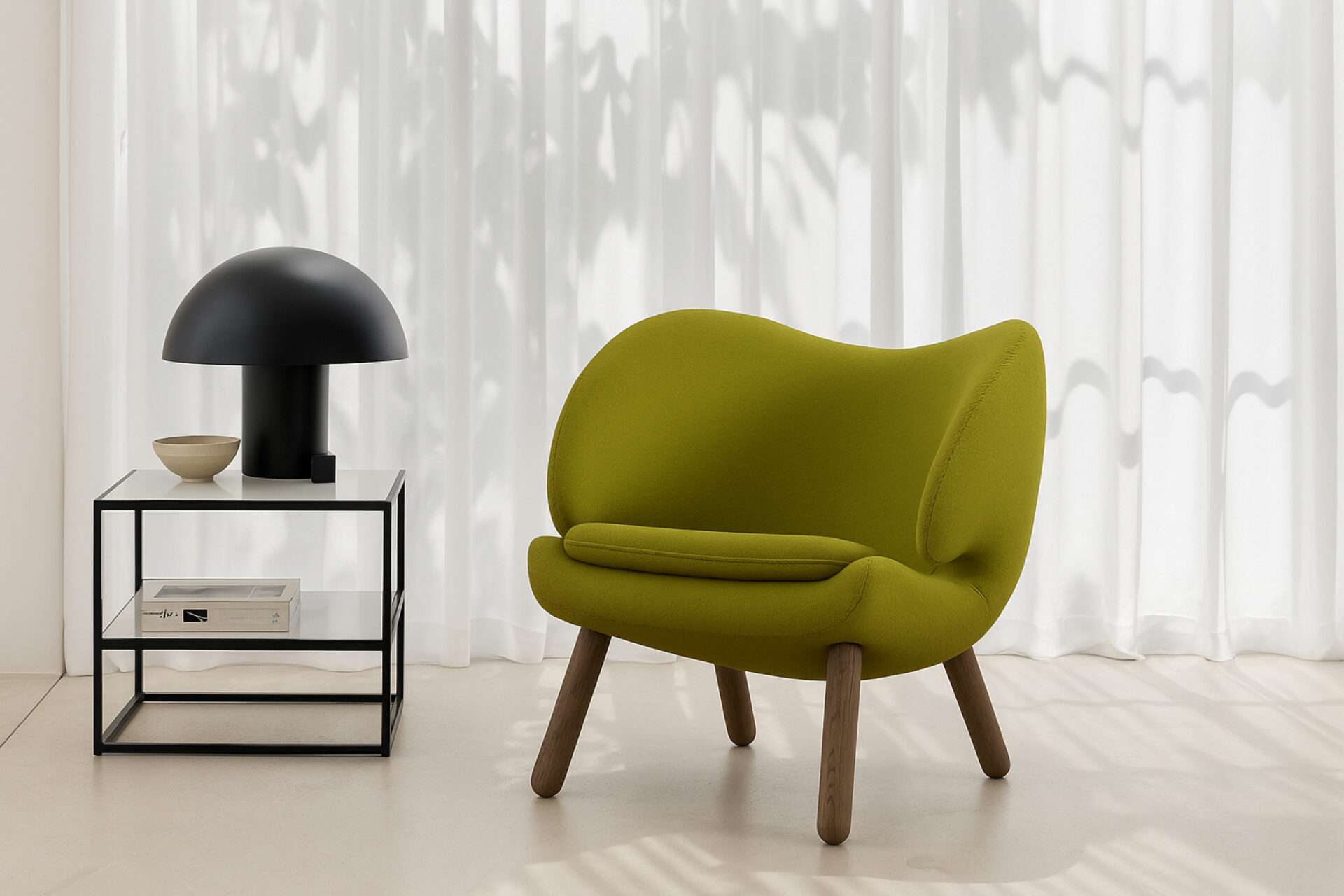 Capturing the essence of 1940s design, the Pelican Chair exudes timeless allure with a nod to its unique era. Boasting a gracefully contoured frame and classic walnut legs, this cozy lounge chair embodies the warmth of hygge and modern sophistication. In a captivating green wool variation, it becomes a striking centerpiece that harmonizes beautifully in various settings, from lavish master suites to inviting living spaces, emanating an everlasting sense of refinement and comfort.